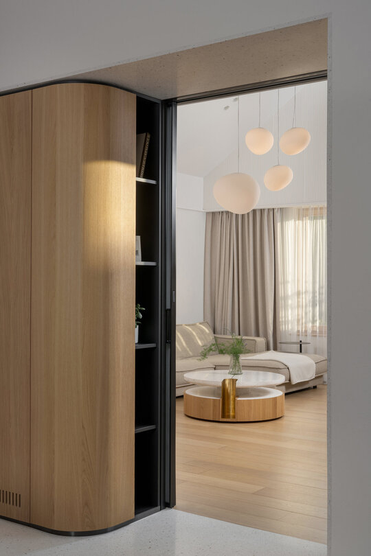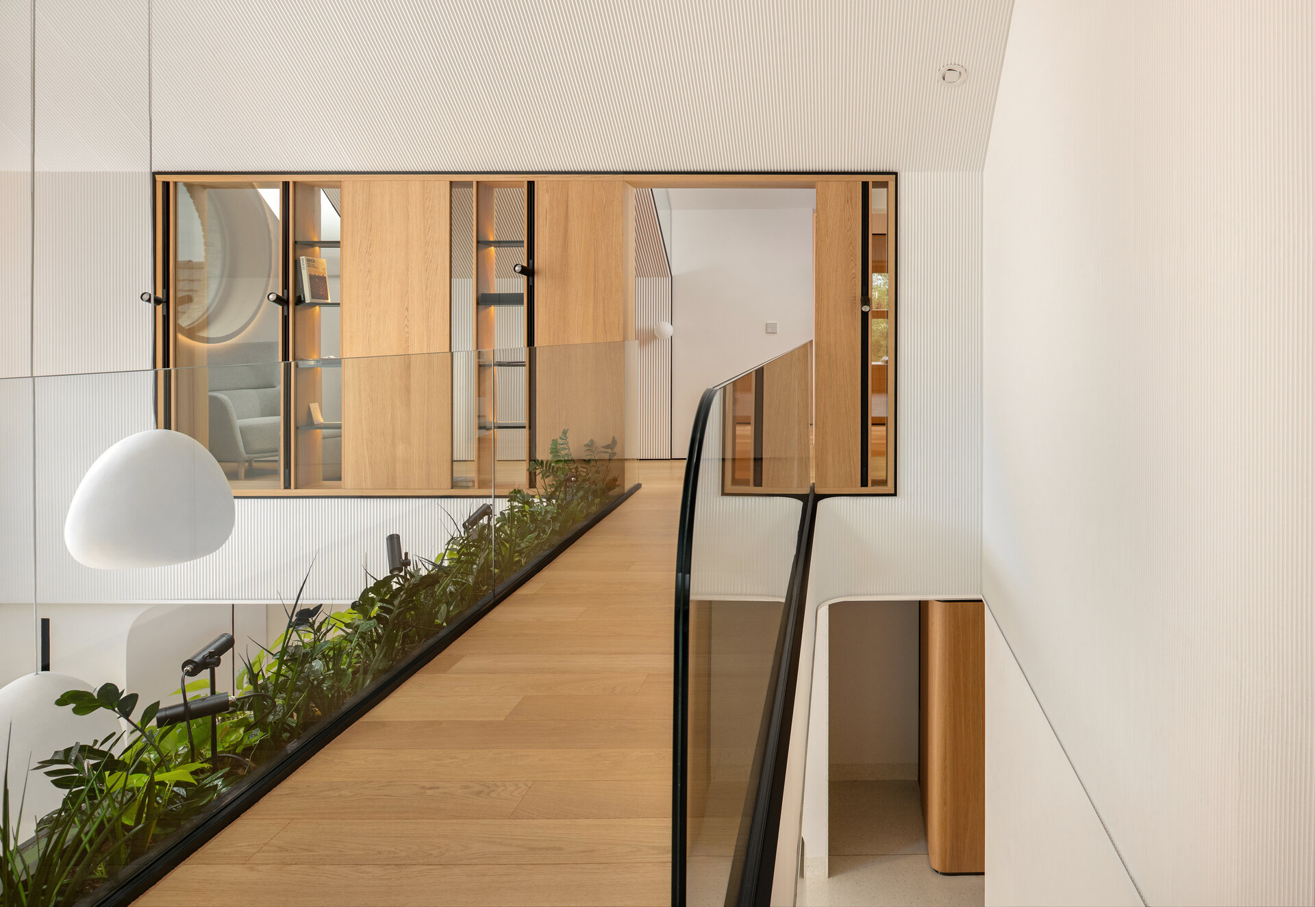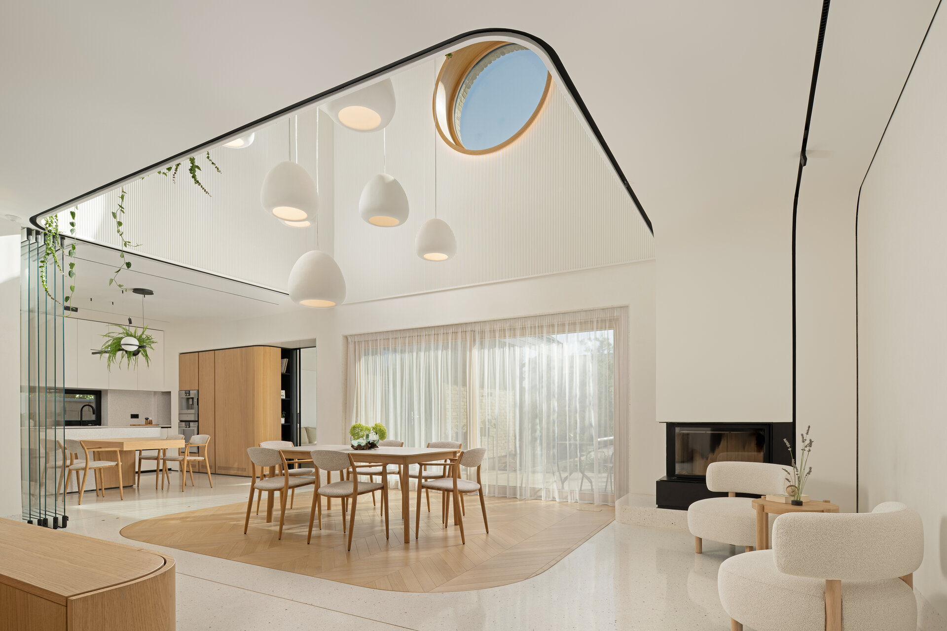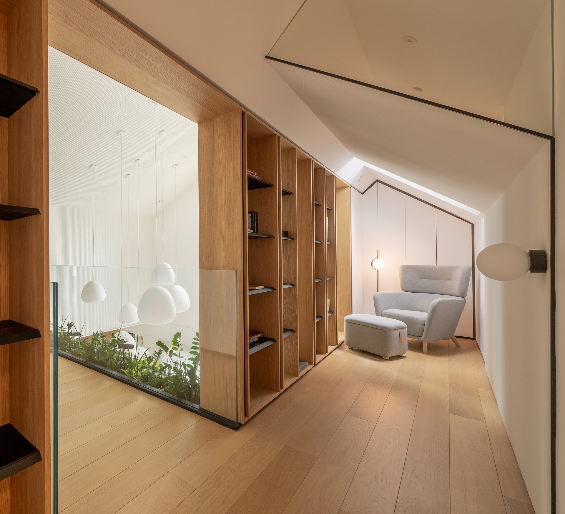 Inima casei are nevoie de căldură, prin urmare am invitat focul în interior prin intermediul unui șemineu care te cheamă la conexiune de îndată ce treci pragul. Este un capăt de perspectivă puternic, ce nu îți permite să deviezi spre locurile mai intime ale casei, ascunse după obiectele din lemn. Inima casei are însă nevoie și de înțelepciune și ghidaj; de aceea, în „Casa plutitoare” am adăugat o cursivă nouă, care adăpostește biblioteca și locul de citit. Aceasta schimbă rolul inițial al pasarelei de la etaj – dintr-un acces pompos către zona oaspeților – într-o punte între studiul individual și spațiul comun al copiilor. Zona oaspeților primește astfel un rol terțiar, complementar, dar mai intim și retras.