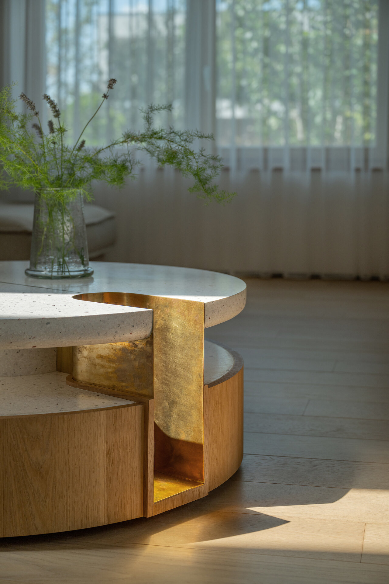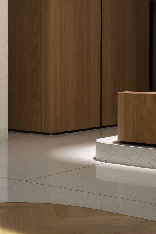 Ghidajul l-am soluționat grafic, prin linii și articulații ce ascund iluminatul și prin intermediul unor „obiecte” din lemn care interacționează cu planul pardoselii și marchează funcțiunile și locurile casei, conectându-le. Prin forma și materialitatea lor, acestea transmit privitorului caracterul intim al spațiilor și marchează trecerea către straturile mai private ale casei.