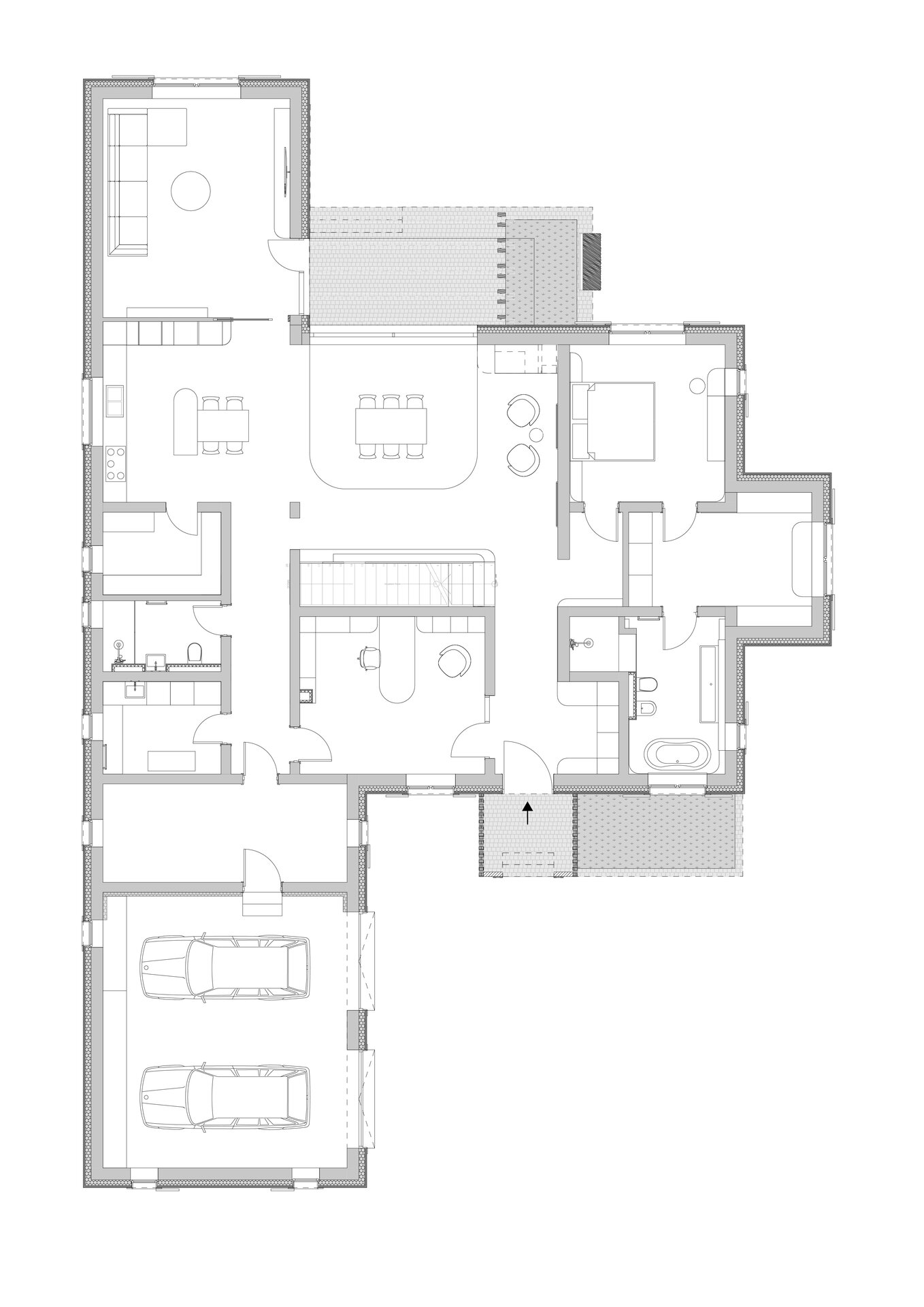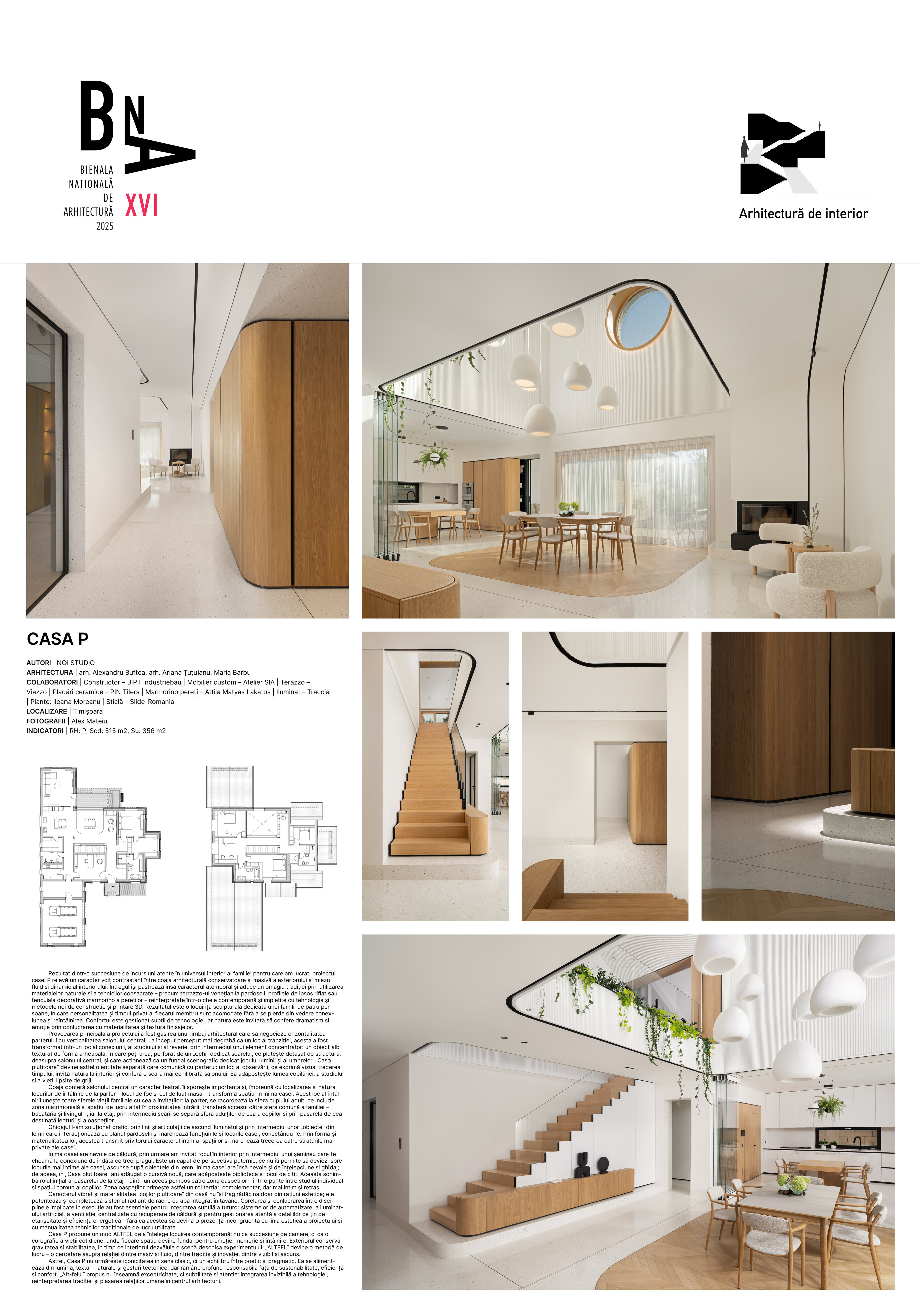 Rezultat dintr-o succesiune de incursiuni atente în universul interior al familiei pentru care am lucrat, proiectul casei P relevă un caracter voit contrastant între coaja arhitecturală conservatoare și masivă a exteriorului și miezul fluid și dinamic al interiorului. Întregul își păstrează însă caracterul atemporal și aduce un omagiu tradiției prin utilizarea materialelor naturale și a tehnicilor consacrate – precum terrazzo-ul venețian la pardoseli, profilele de ipsos riflat sau tencuiala decorativă marmorino a pereților – reinterpretate într-o cheie contemporană și împletite cu tehnologia și metodele noi de construcție și printare 3D. Rezultatul este o locuință sculpturală dedicată unei familii de patru persoane, în care personalitatea și timpul privat al fiecărui membru sunt acomodate fără a se pierde din vedere conexiunea și reîntâlnirea. Confortul este gestionat subtil de tehnologie, iar natura este invitată să confere dramatism și emoție prin conlucrarea cu materialitatea și textura finisajelor.