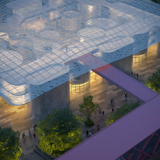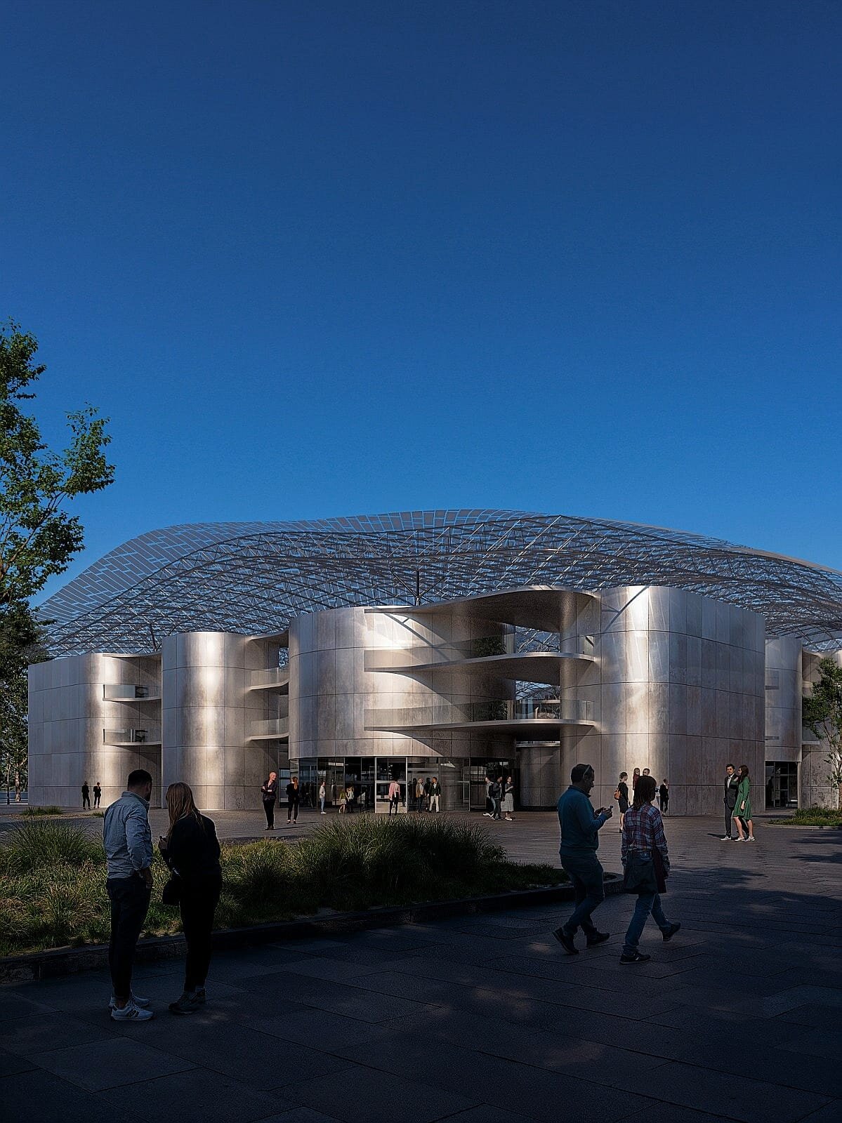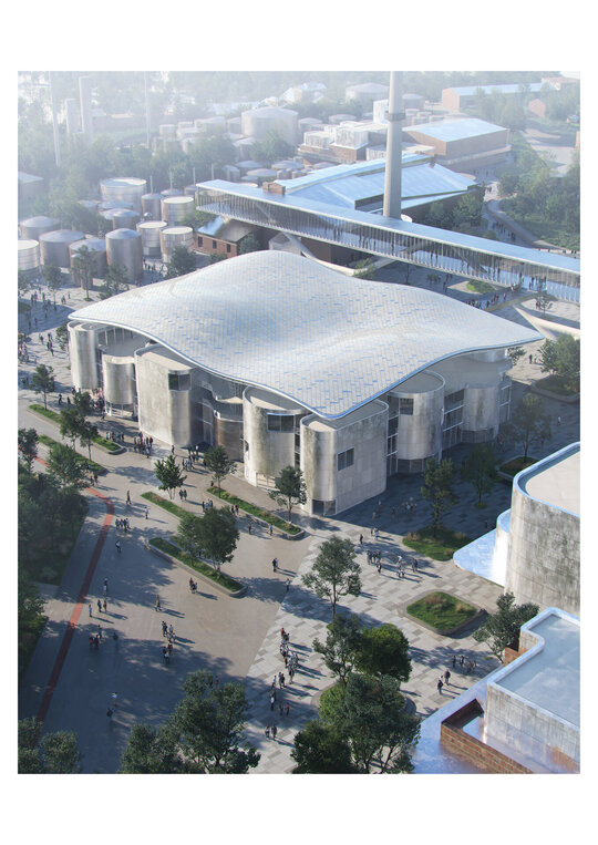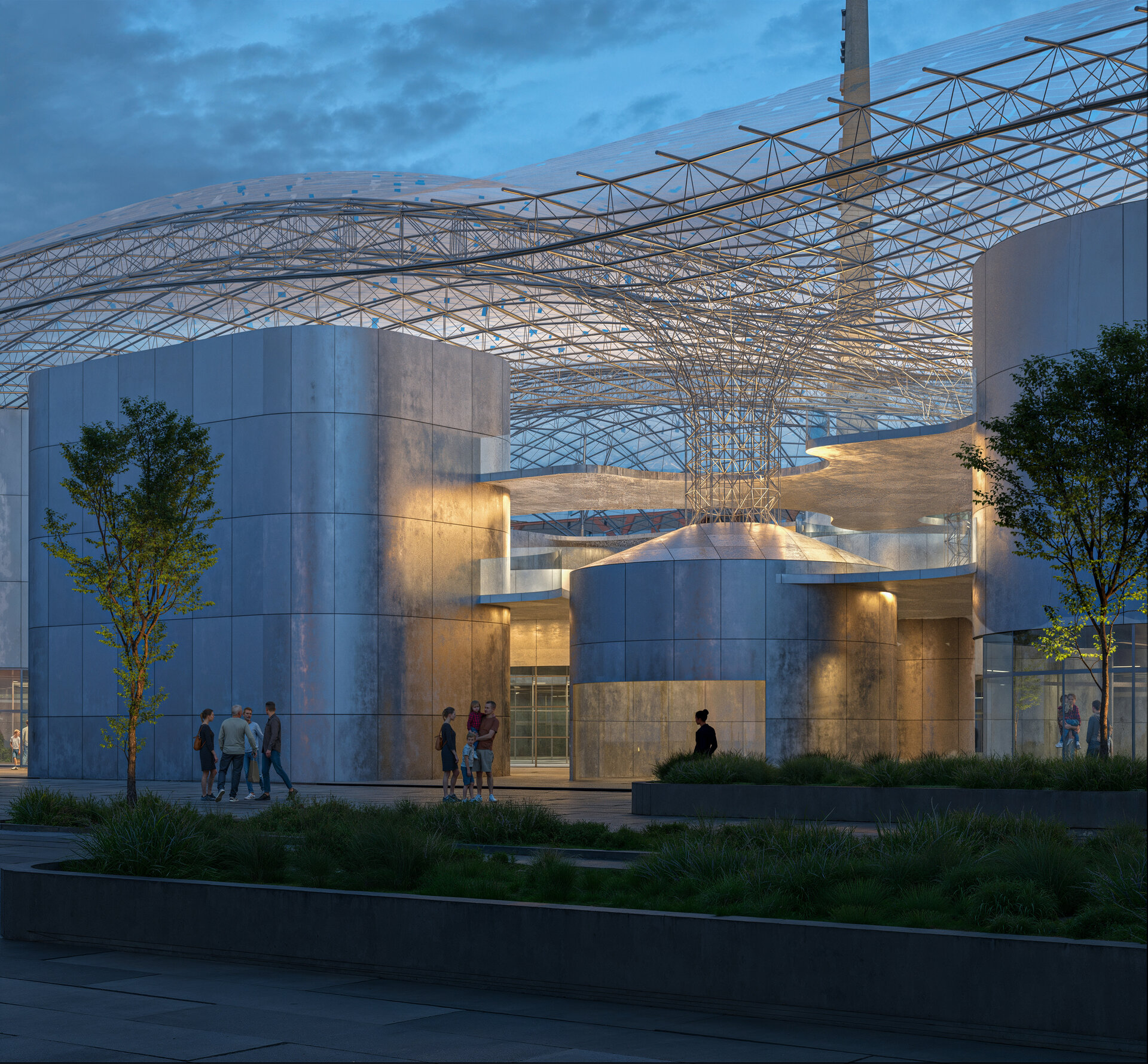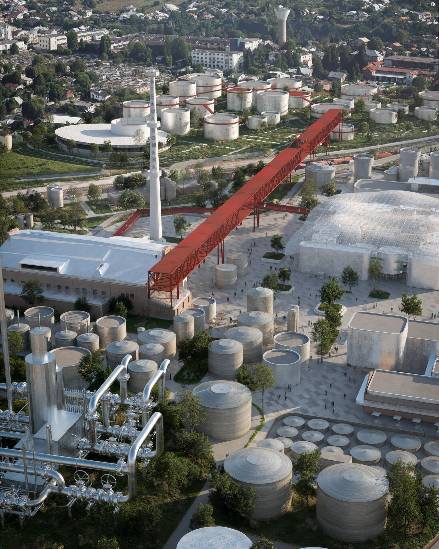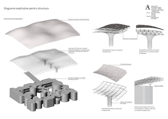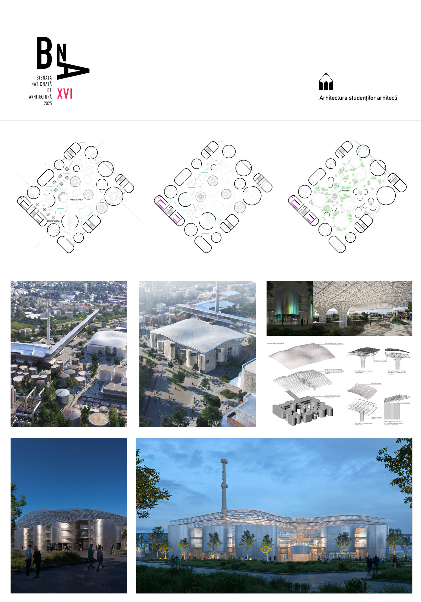 Proiectul prezentat face parte dintr-o propunere de regenerare urbana, pentru situl rafinariei "Steaua Romana", din cadrul concursului cu acelasi nume. Acesta s-a desfasurat in semestrul I al anului universitar 2024-2025, pentru grupele de an V din cadrul U.A.U.I.M. Tema interventiei generale propuse a fost de parc imersiv si punct puternic de atractie turistica. In cadrul acestei regenerari de mari dimensiuni, s-a pus si problema echilibarii balantei intre ce se construieste nou pe sit si cat se reabiliteaza. Cladirea de fata este emblematica pentru raspunsul la aceasta cerinta. Intreg conceptul propunerii, de la aspectul exterior pana la organizarea planimetrica, au avut ca baza de plecare o situatie deja existenta pe sit si reprezentativa acestuia: cilindrii de depozitare a petrolului. Acestia sunt metalici, prezenti in numar mare pe sit, in multe dimensiuni si grupari diferite. Dezvoltarea propunerii atat conceptuala cat si functionala si structurala, pleca de la 3 cilindrii existenti, din centrul carora "porneste" cladirea. Are functiunea de centru comercial, cu o gradina suspendata la ultimele etaje, astfel ca functiunea propusa rezolva unele din necesitatile reabilitarii, devenind un punct de interes turistic local, dar si economic, comercial. Este configurata pe baza a mai multor cilindrii metalici, de diverse dimensiuni, ce graviteaza unul in jurul celuilalt si toti in jurul celor trei reabilitati, peste care se aseaza o acoperire spectaculoasa, dintr-un sistem tridimensional de bari metalice, ce-si are centrul de pornire in cei trei stalpi, ce pornesc din cei trei cilindrii mentionati anterior. Acoperirea se sustine pe langa cei trei stalpi, perimetral, in colturi, in noduri structurale detaliate, pe cilindrii propusi si este acoperita cu o membrana subtire transparenta, ce permite patrunderea luminii. Functional, cilindrii existenti adapostesc sere climatizate, ce permit plantelor sa urce pe stalpii ce izvorasc din cilindrii respectivi, pana sus, la ultimul etaj, unde se afla o gradina suspendata cu inaltime dubla si pasarela perimetrala. Un spatiu pentru petrecerea timpului liber, cu activitati precum plimatul, mersul cu bicicleta, relaxarea la restaurante, cafenele, sau in spatiile amenajate de stat, adirarea plantelor. Primele doua etaje ale cladirii adapostesc magazine, restaurante si spatii cu activitati imersive. Spatiile sunt configurate adaptiv si diferntiat pe fiecare etaj, majoritatea fiind spatii libere, interconectate si adaptabile, insa principiile unitare sunt conformarea spatiilor dupa structura cilindrilor si pastrarea circulatiilor exclusiv exterioara acestora. Cladirea se leaga printr-o pasarela pozitionata pe latura din spate, de un al punct esential al proiectului de regenerare, o pietonala suspendata, si are frontal un landscape amenajat si integrat in proiectul general.