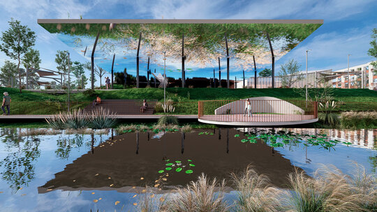 Un element definitoriu al filosofiei proiectului este relația cu râul Bâc. În loc să fie o barieră sau o problemă, acesta este transformat într-un partener al arhitecturii: malurile sunt reamenajate ca spații publice, promenade, zone de relaxare și sport. Astfel, ansamblul nu doar servește rezidenților, ci și comunității urbane, devenind un reper de regenerare ecologică și socială.