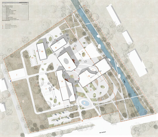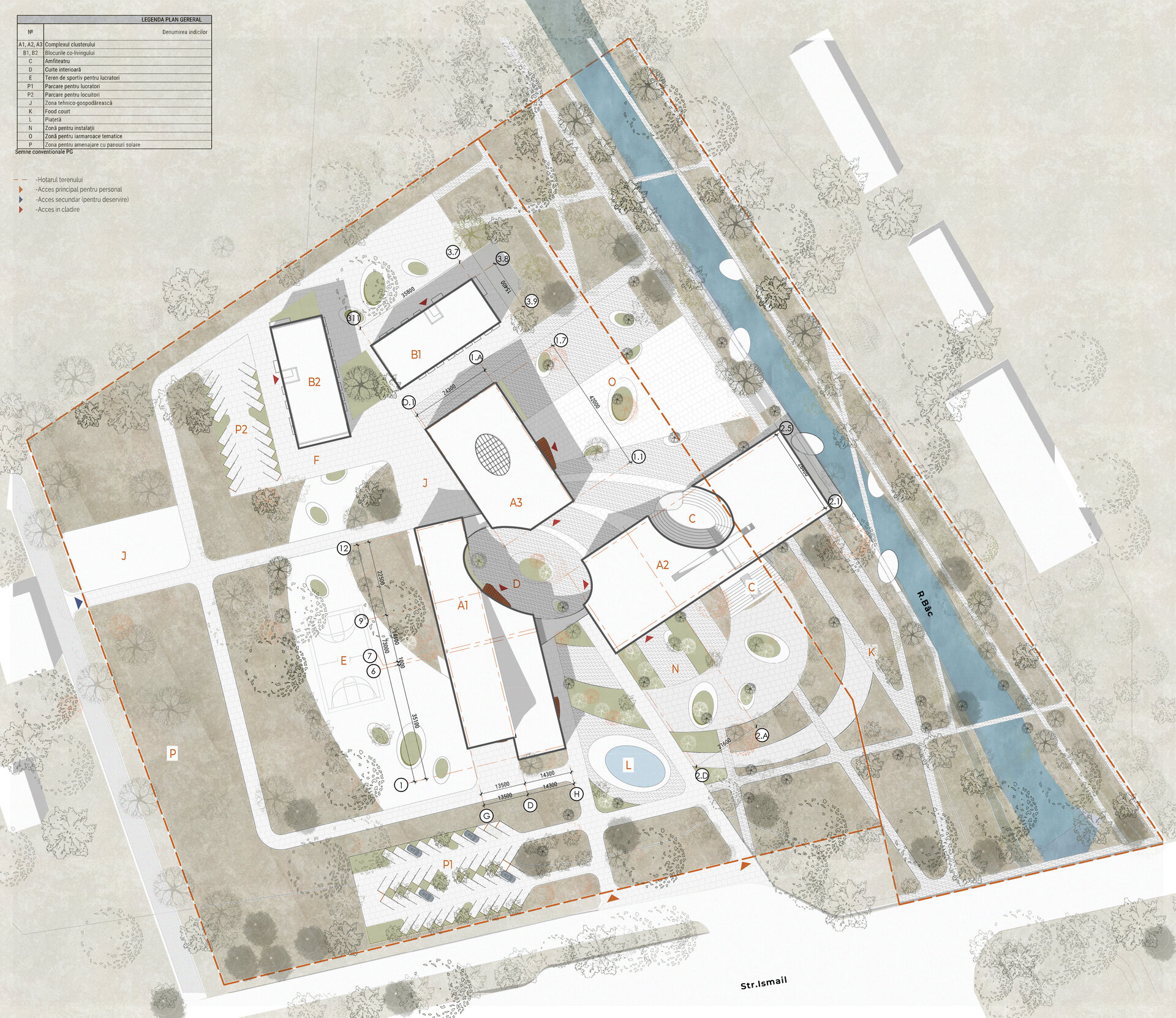 • Deschidere – ansamblul nu este o enclavă, ci un spațiu poros, integrat în oraș și deschis comunității. Relația cu râul Bâc și cu spațiile publice transformă proiectul într-un catalizator urban și social.
