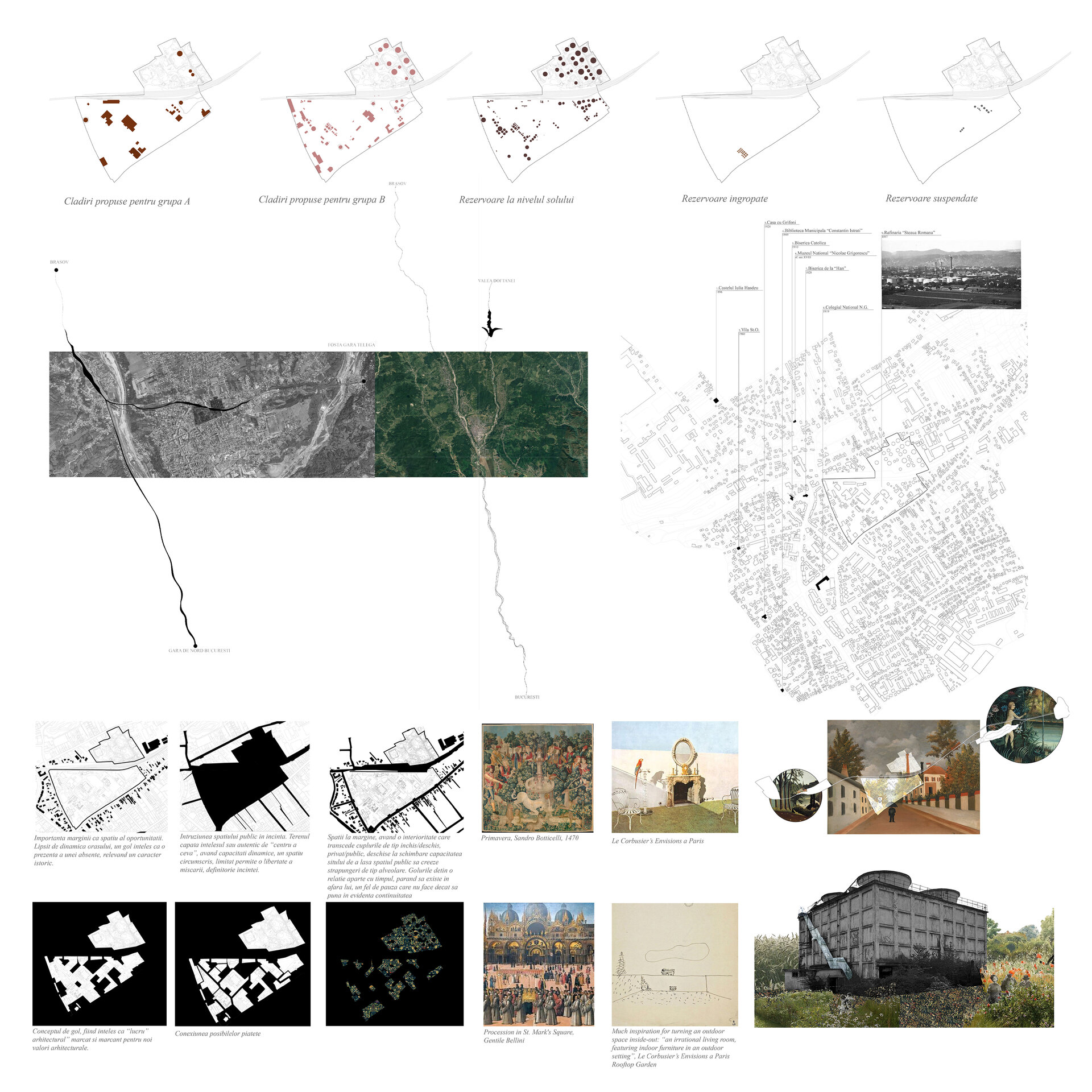 Prin refuncționalizarea căii ferate, aducem un traseu pietonal, o cale de legătura cu infrastructura orașului, ce străpunge platforma industrială și o fragmentează ierarhizând cele două zone: baza platformei în care sunt concentrate cele mai multe clădiri reprezentative pentru evoluția tehnologică și arhitecturală, revitalizate cu noi funcțiuni publice (culturale, sociale, comerț și administrative), și ,,Grădina de rezervoare’’ dominată de douăzeci și unu de rezervoare cu dimensiuni diverse, astfel cultivându-și caracterul de vestigii pierdute într-un tablou pitoresc de codrii.