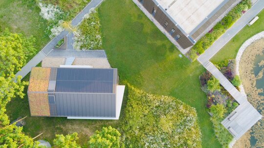 O casă sustenabilă și eficientă energetic, cu amprentă redusă de carbon cu mai puține emisii, mai mult carbon stocat în material, cu panouri solare integrate în sistemul constructiv al acoperișului și cu acoperiș verde cu plante perene. Atât plantele cât și casa în sine au un caracter peren care poate fi oricând reconvertită, relocată, sau recliclată, reprezentând o moștenire arhitecturală care poate fi și nepermanentă.