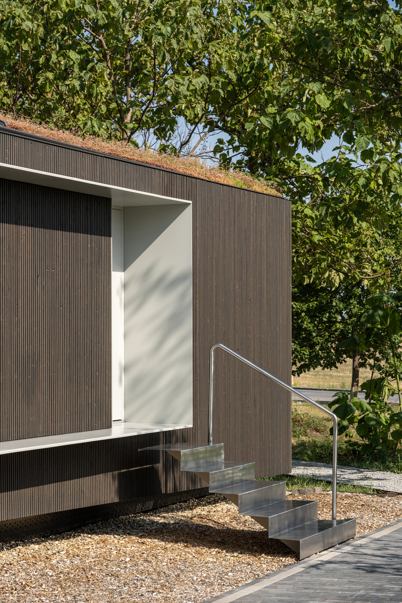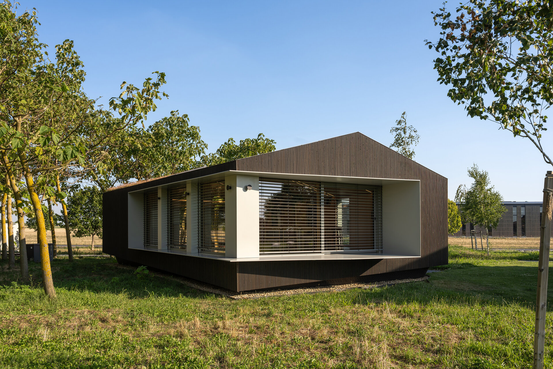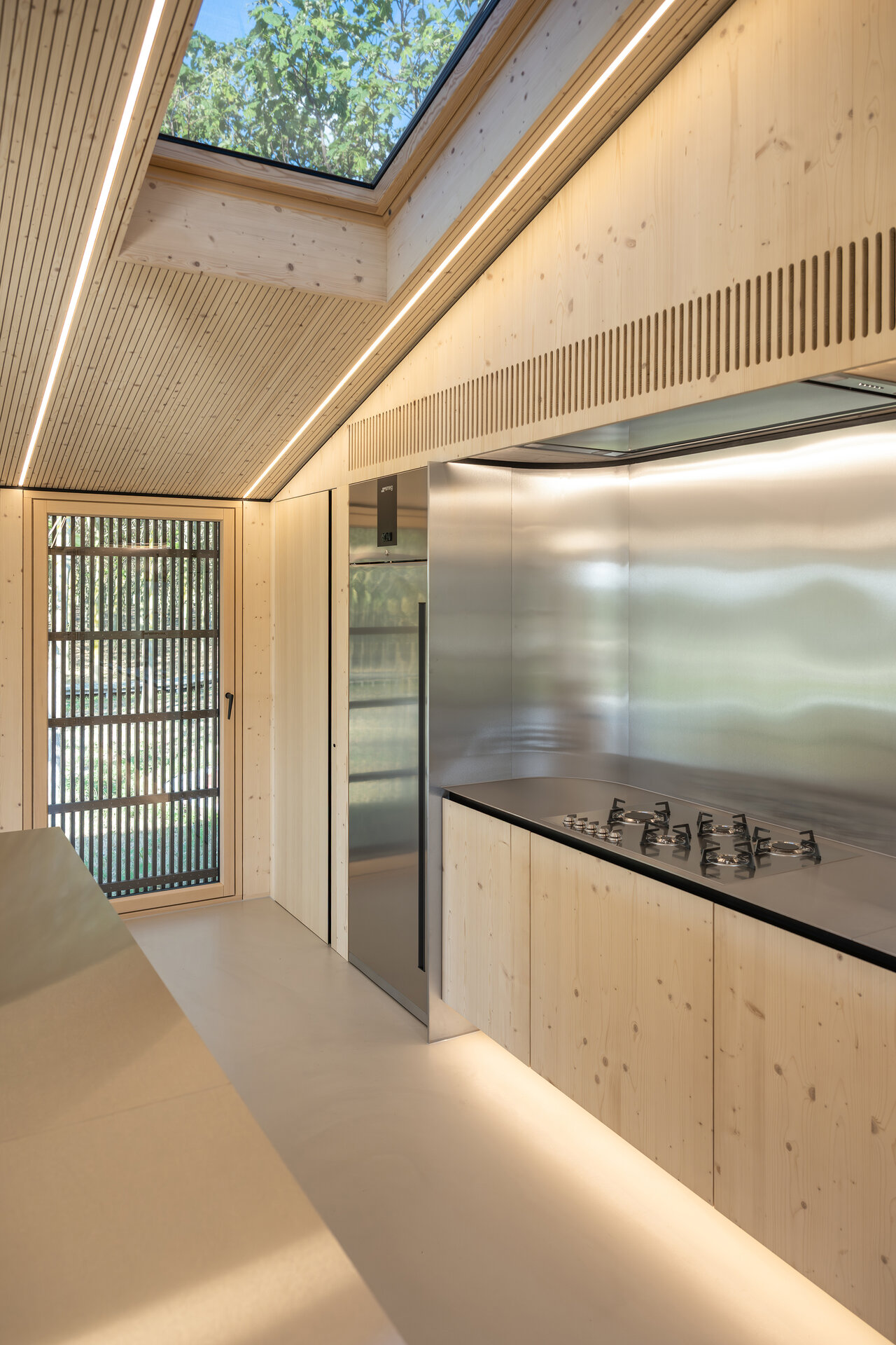 Arhitectura acestei case modulare se bazează pe o compoziție coerentă și durabilă, în care lemnul joacă un rol central, în care toate elementele structurale esențiale - pereții, acoperișul și podeaua — sunt realizate din lemn stratificat și CLT.