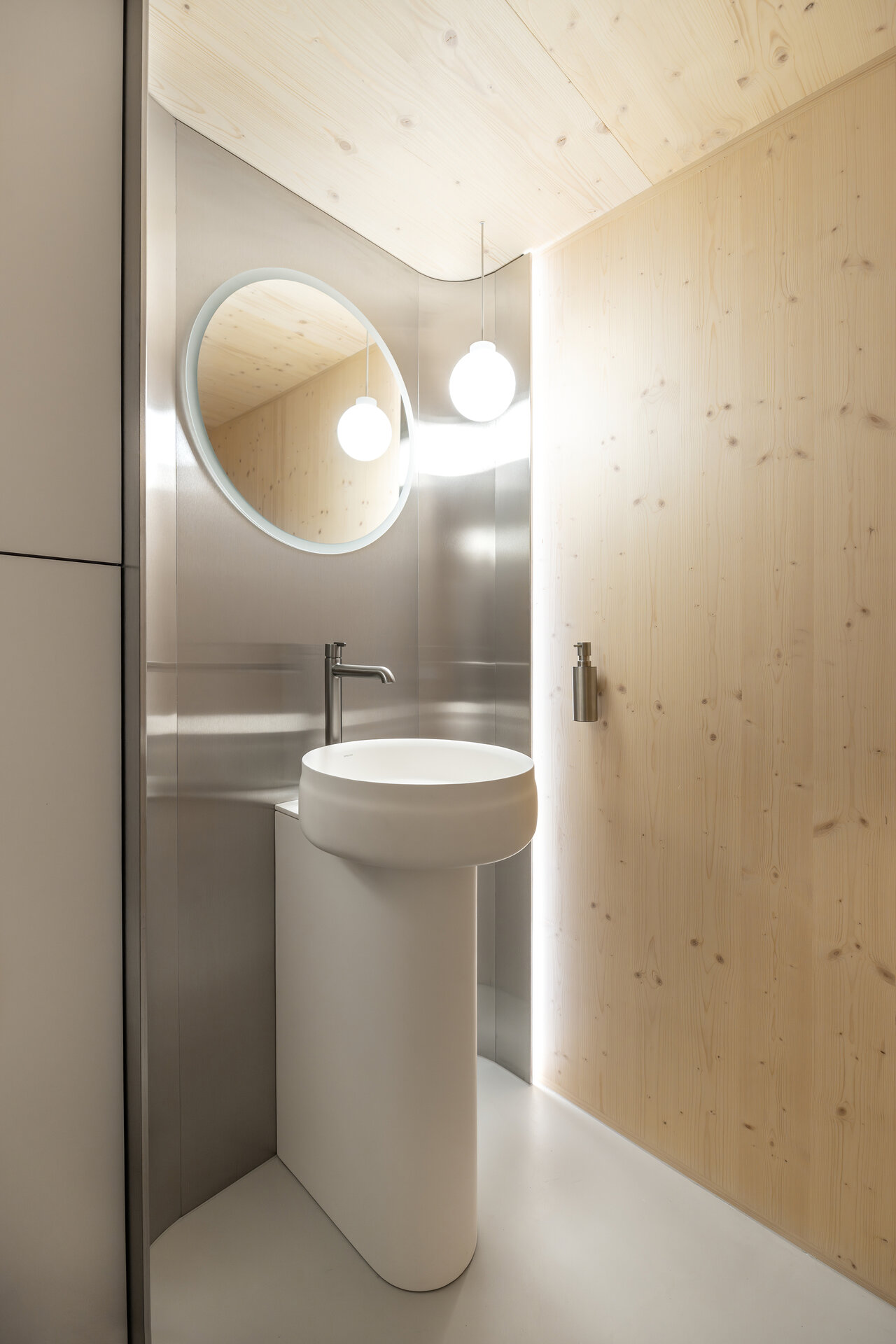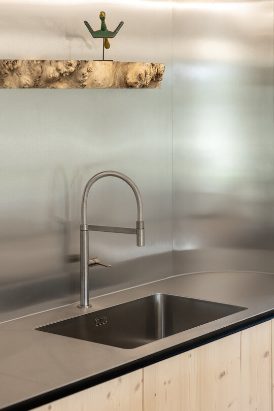 Inoxul conferă rezistență, durabilitate, precizie si rafinament, fiind ideal pentru detalii interioare din zona bucătăriei si a băii. În aceeași măsură contrabalansează căldura lemnului oferind și o reflexie subtilă a naturii reflectate în interior.