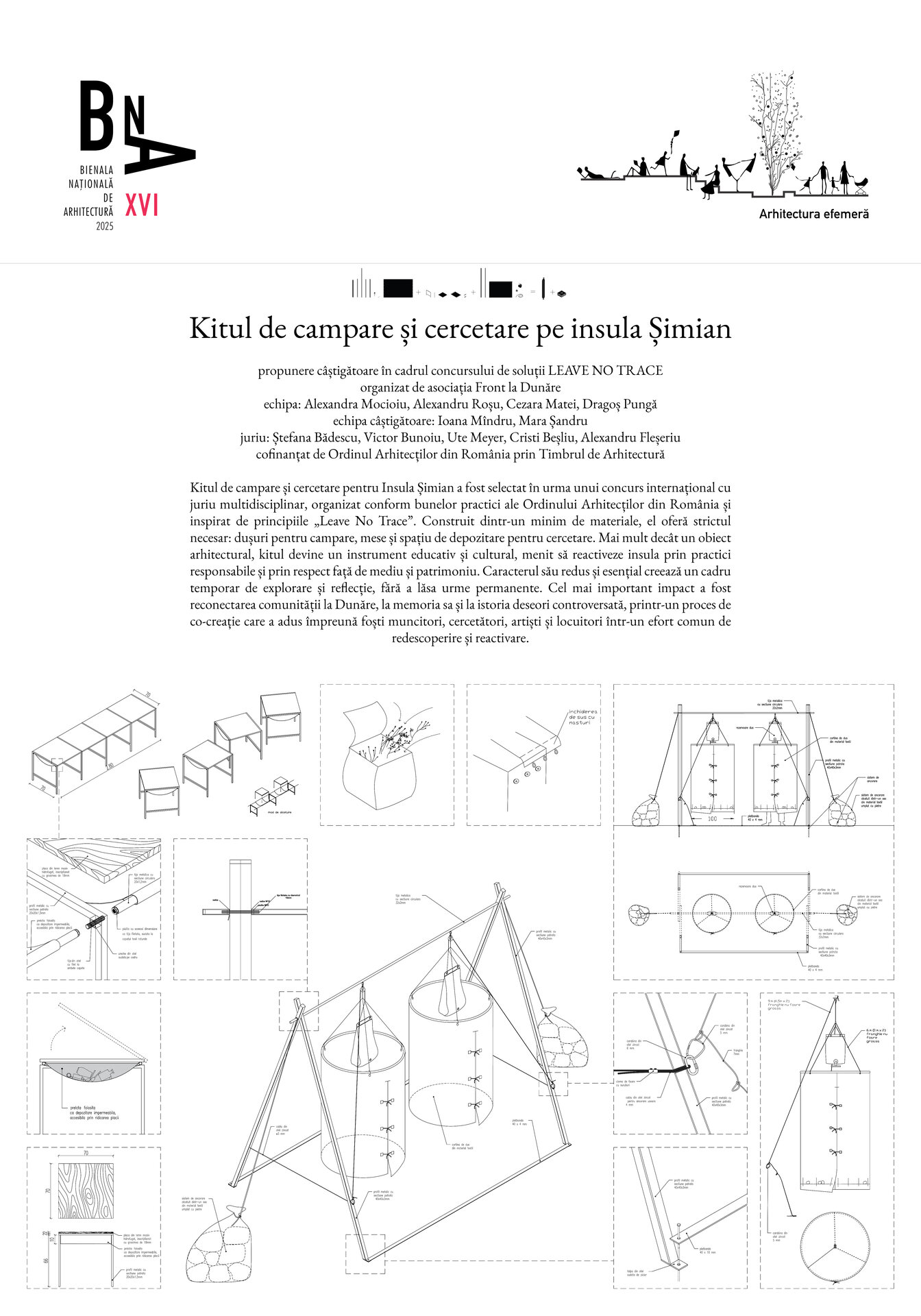 de campare și cercetare pentru Insula Șimian a fost selectat în urma unui concurs internațional cu juriu multidisciplinar, organizat conform bunelor practici ale Ordinului Arhitecților din România și inspirat de principiile „Leave No Trace”. Construit dintr-un minim de materiale, el oferă strictul necesar: dușuri pentru campare, mese și spațiu de depozitare pentru cercetare. Mai mult decât un obiect arhitectural, kitul devine un instrument educativ și cultural, menit să reactiveze insula prin practici responsabile și prin respect față de mediu și patrimoniu. Caracterul său redus și esențial creează un cadru temporar de explorare și reflecție, fără a lăsa urme permanente. Cel mai important impact a fost reconectarea comunității la Dunăre, la memoria sa și la istoria deseori controversată, printr-un proces de co-creație care a adus împreună foști muncitori, cercetători, artiști și locuitori într-un efort comun de redescoperire și reactivare.
