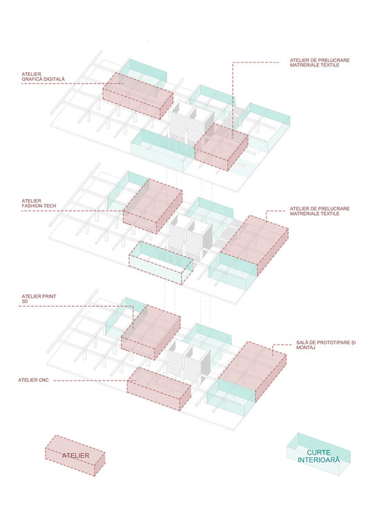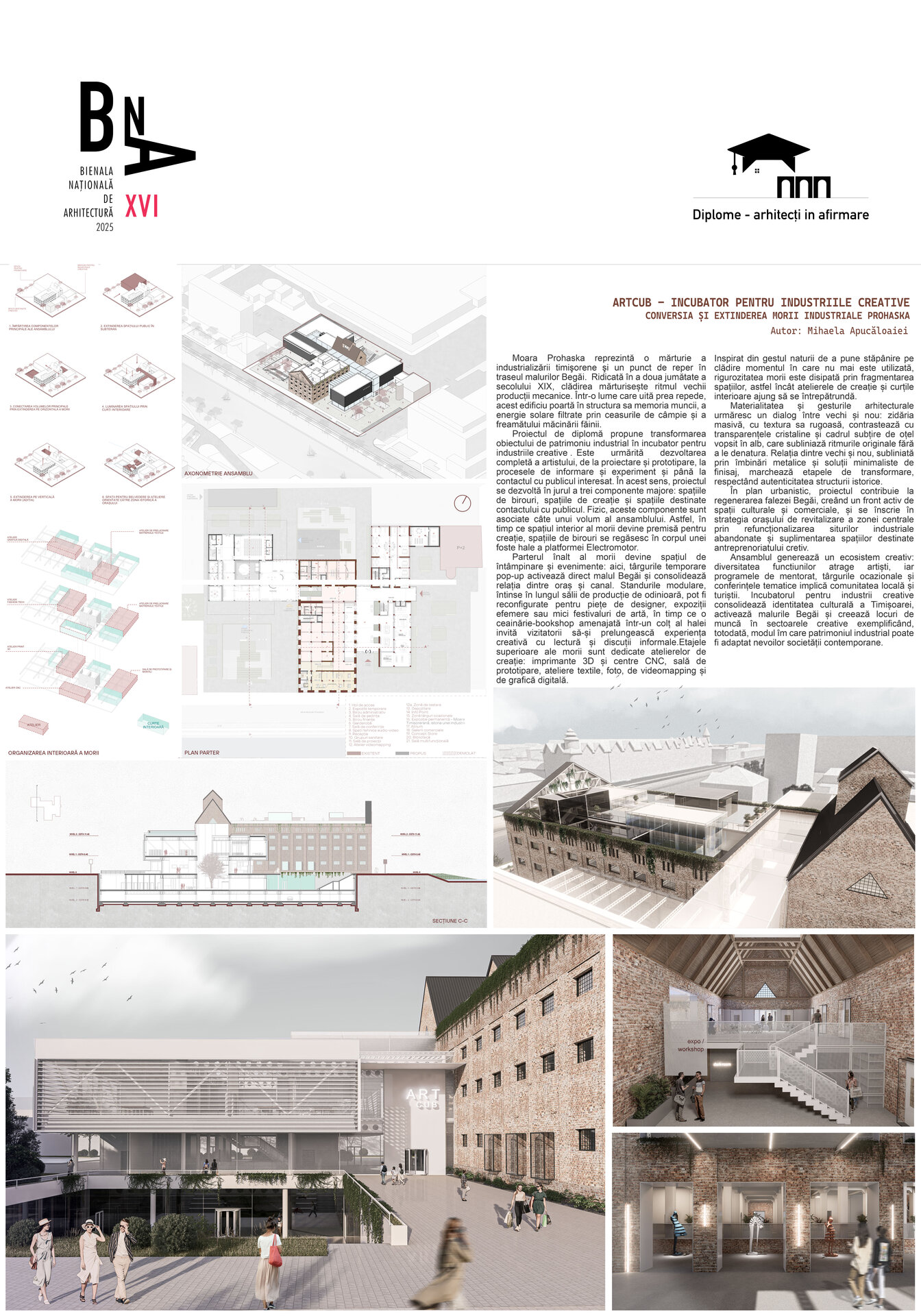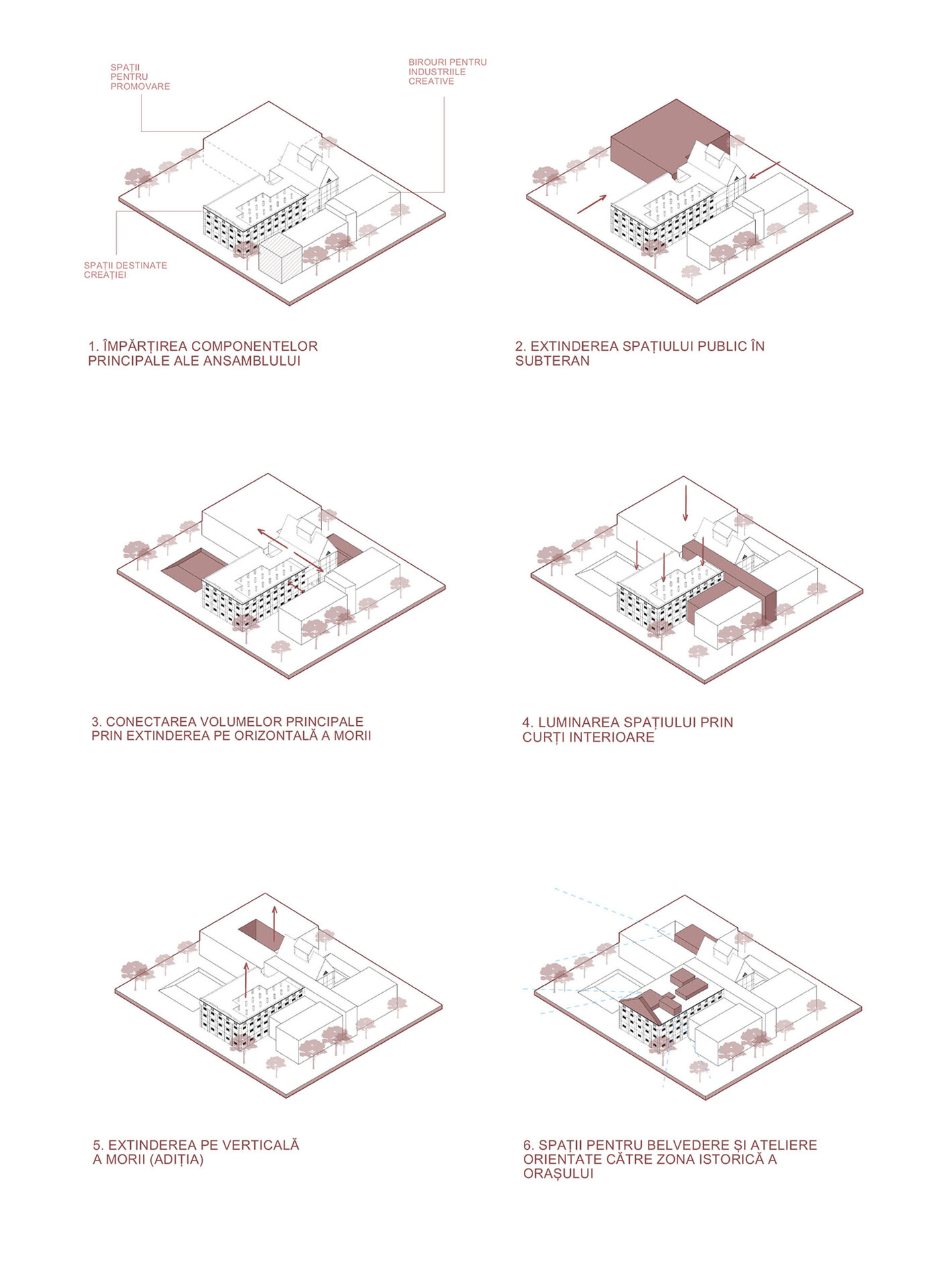 Proiectul de diplomă propune transformarea obiectului de patrimoniu industrial în incubator pentru industriile creative. Este urmărită dezvoltarea completă a artistului, de la proiectare și prototipare, la procesele de informare și experiment și până la contactul cu publicul interesat. În acest sens, proiectul se dezvoltă în jurul a trei componente majore: spațiile de birouri, spațiile de creație și spațiile destinate contactului cu publicul. Fizic, aceste componente sunt asociate câte unui volum al ansamblului. Astfel, în timp ce spațiul interior al morii devine premisă pentru creație, spațiile de birouri se regăsesc în corpul unei foste hale a platformei Electromotor.