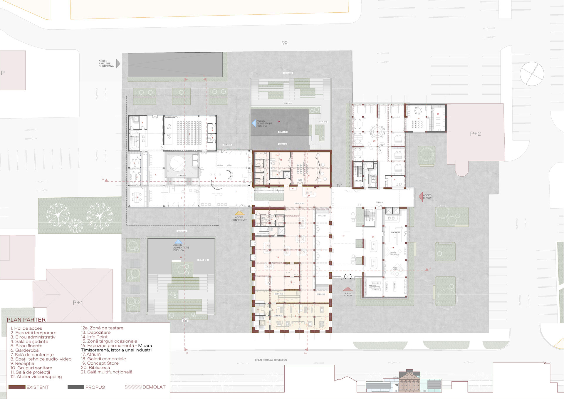 Parterul înalt al morii devine spațiul de întâmpinare și evenimente: aici, târgurile temporare pop-up activează direct malul Begăi și consolidează relația dintre oraș și canal. Standurile modulare, întinse în lungul sălii de producție de odinioară, pot fi reconfigurate pentru piețe de designer, expoziții efemere sau mici festivaluri de artă, în timp ce o ceainărie-bookshop amenajată într-un colț al halei invită vizitatorii să-și prelungească experiența creativă cu lectură și discuții informale.