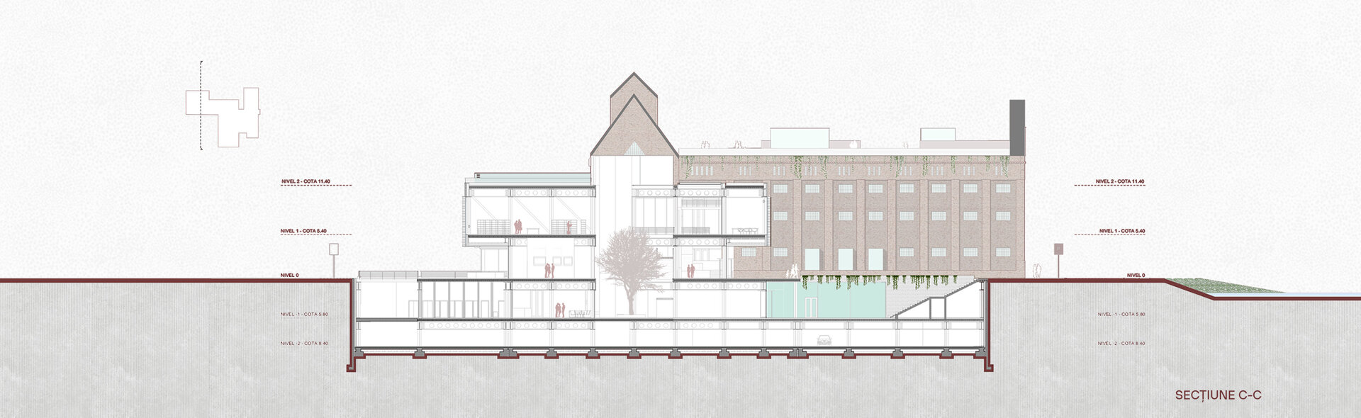 Materialitatea și gesturile arhitecturale urmăresc un dialog între vechi și nou: zidăria masivă, cu textura sa rugoasă, contrastează cu transparențele cristaline și cadrul subțire de oțel vopsit în alb, care subliniază ritmurile originale fără a le denatura. Relația dintre vechi și nou, subliniată prin îmbinări metalice și soluții minimaliste de finisaj, marchează etapele de transformare, respectând autenticitatea structurii istorice.
