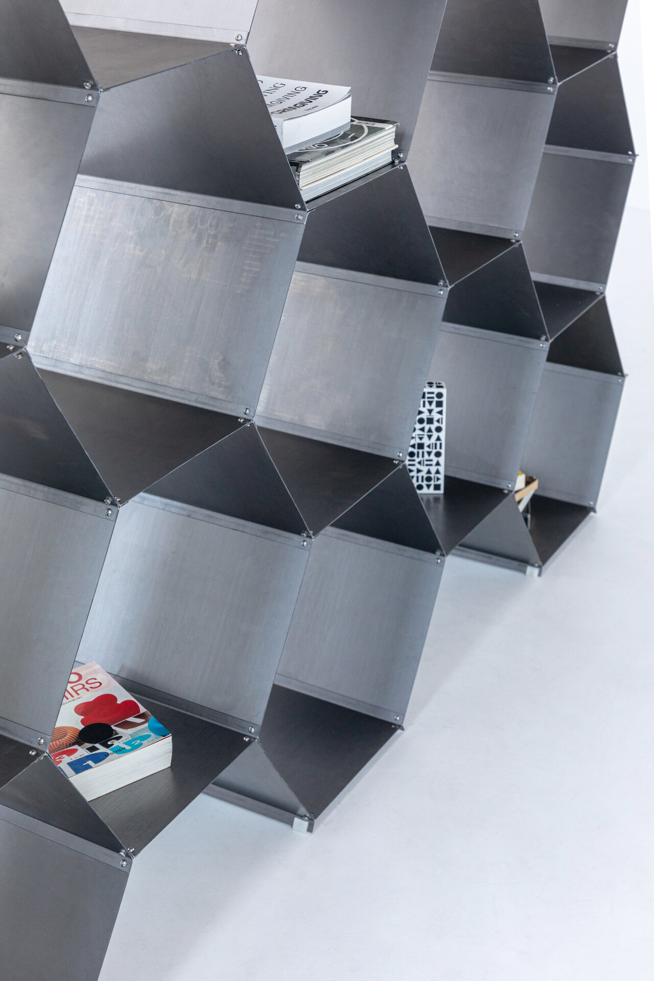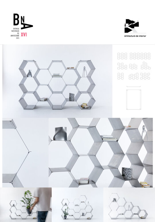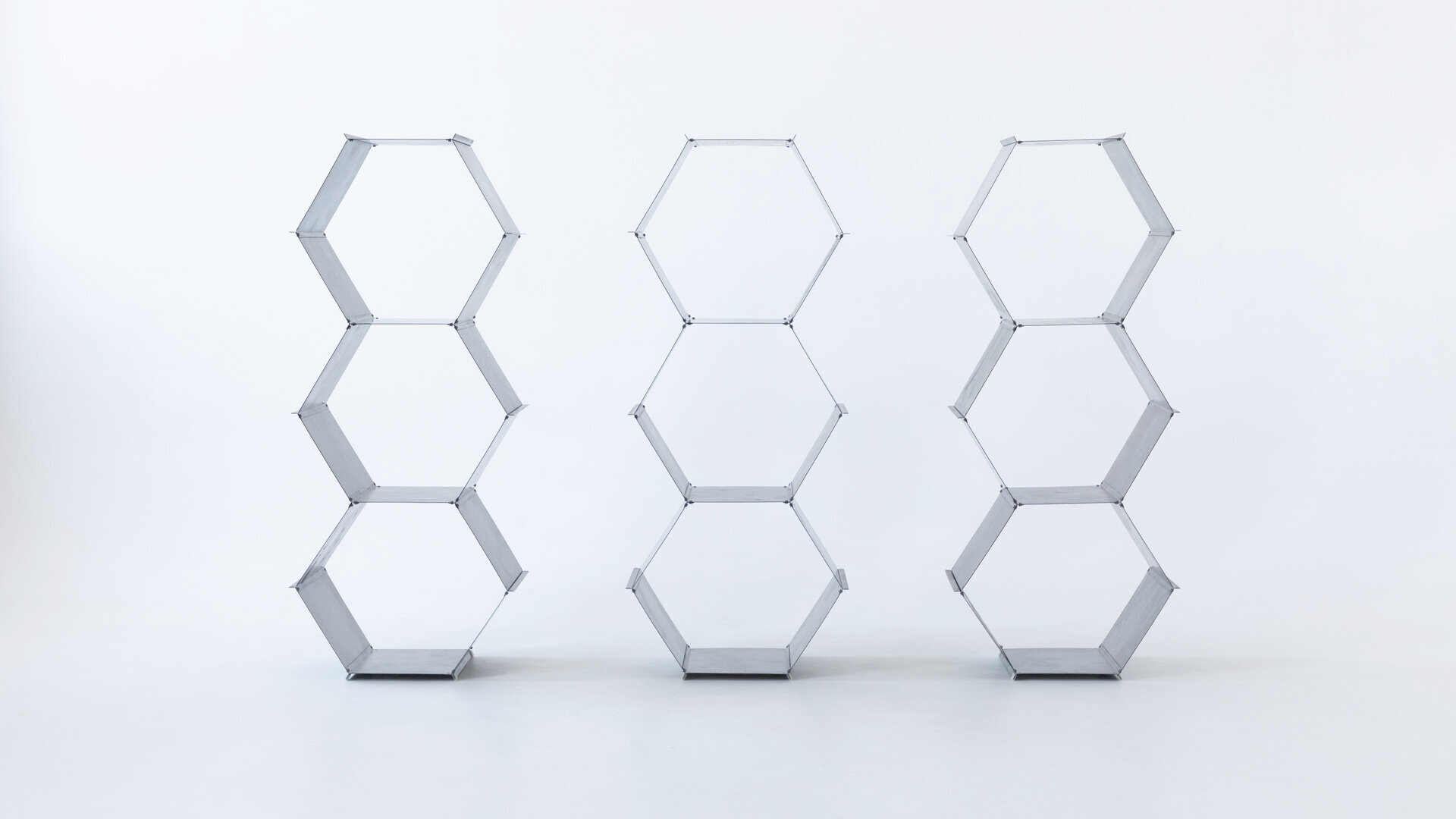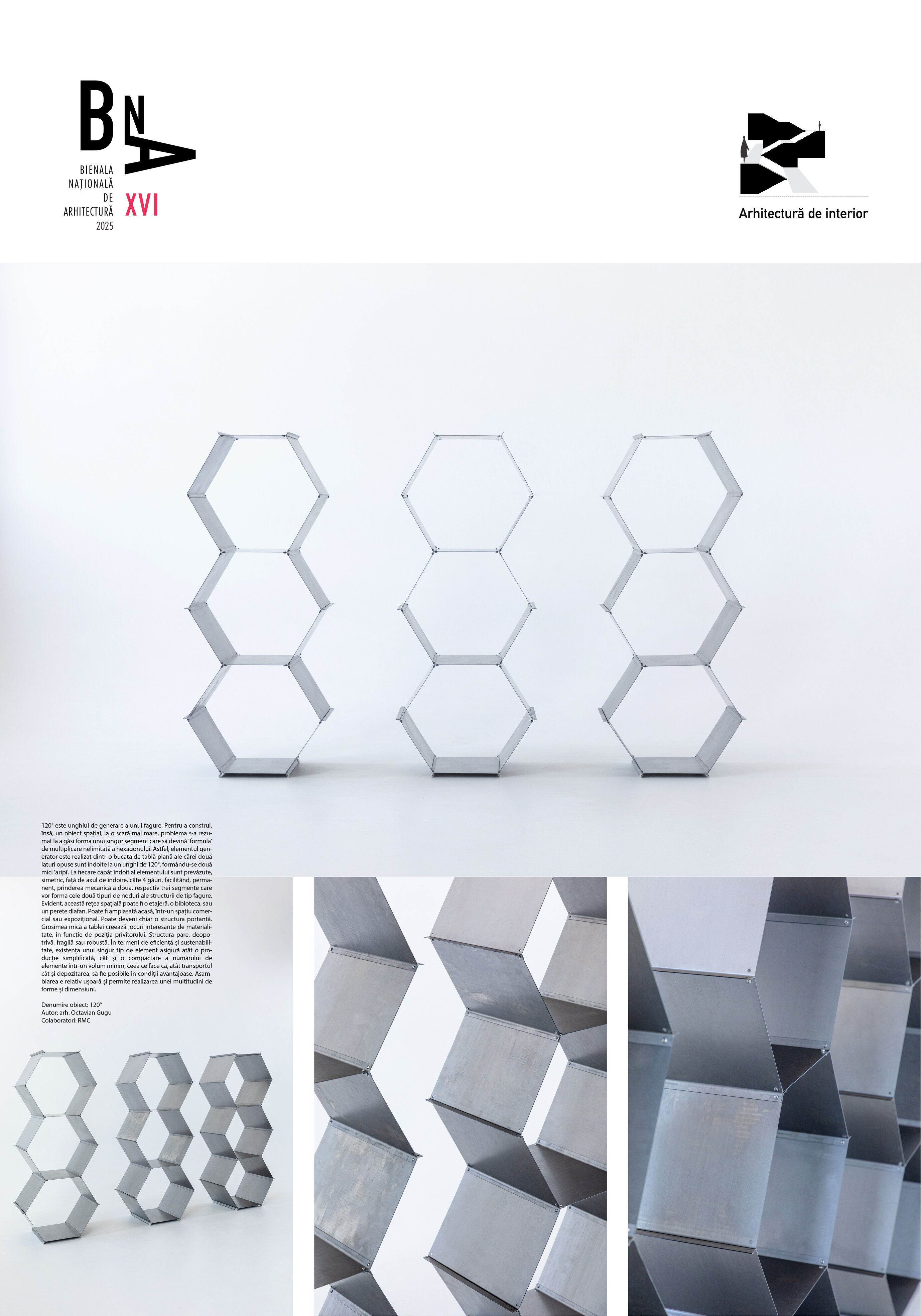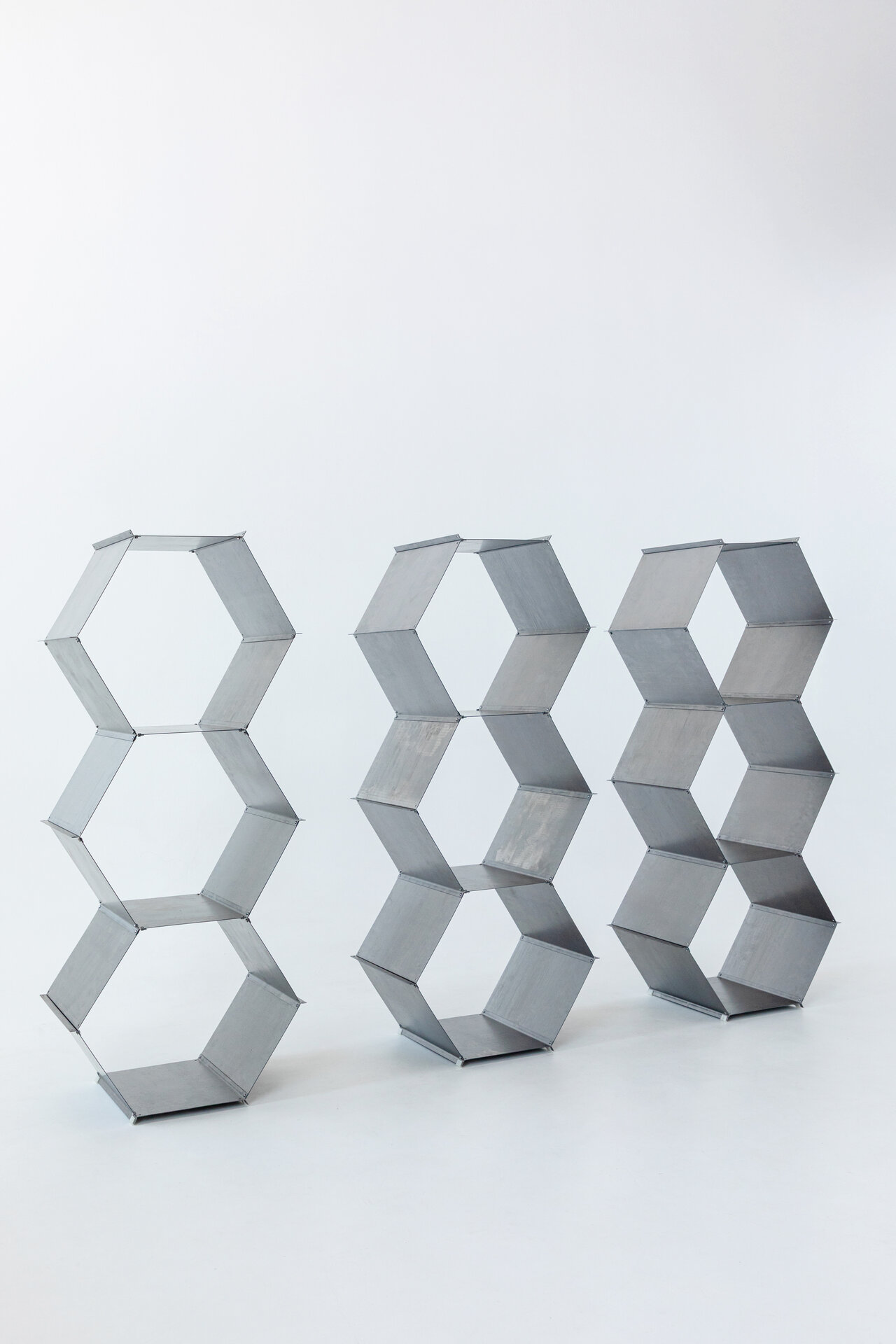 120° este unghiul de generare a unui fagure. Pentru a construi, însă, un obiect spațial, la o scară mai mare, problema s-a rezumat la a găsi forma unui singur segment care să devină 'formula' de multiplicare nelimitată a hexagonului. Astfel, elementul generator este realizat dintr-o bucată de tablă plană ale cărei două laturi opuse sunt îndoite la un unghi de 120°, formându-se două mici 'aripi'. La fiecare capăt îndoit al elementului sunt prevăzute, simetric, față de axul de îndoire, câte 4 găuri, facilitând, permanent, prinderea mecanică a doua, respectiv trei segmente care vor forma cele două tipuri de noduri ale structurii de tip fagure. Evident, această rețea spațială poate fi o etajeră, o bibioteca, sau un perete diafan. Poate fi amplasată acasă, într-un spațiu comercial sau expozițional. Poate deveni chiar o structura portantă. Grosimea mică a tablei creează jocuri interesante de materialitate, în funcție de poziția privitorului. Structura pare, deopotrivă, fragilă sau robustă. În termeni de eficiență și sustenabilitate, existența unui singur tip de element asigură atât o producție simplificată, cât și o compactare a numărului de elemente într-un volum minim, ceea ce face ca, atât transportul cât și depozitarea, să fie posibile în condiții avantajoase. Asamblarea e relativ ușoară și permite realizarea unei multitudini de forme și dimensiuni.