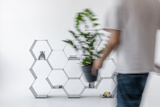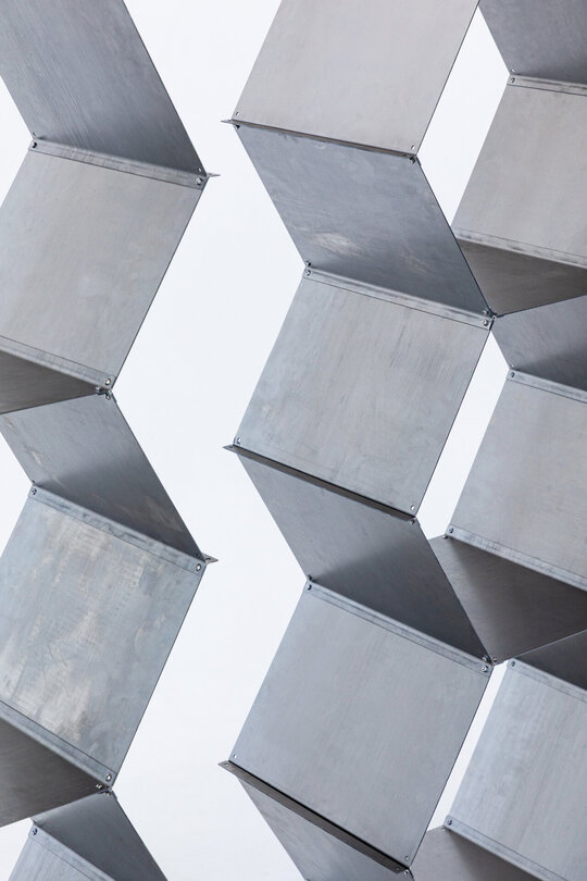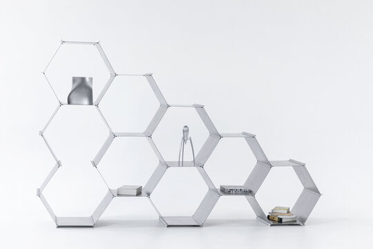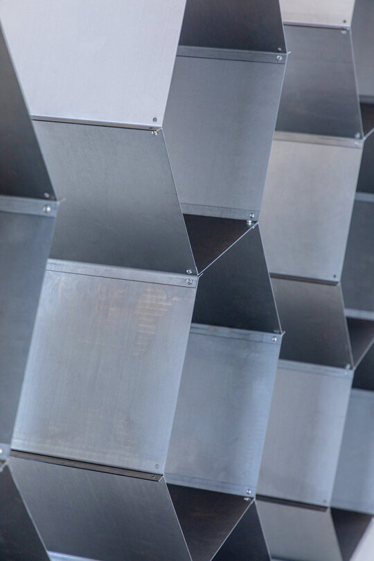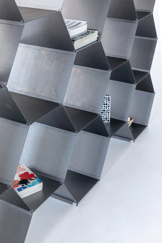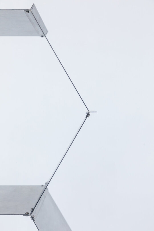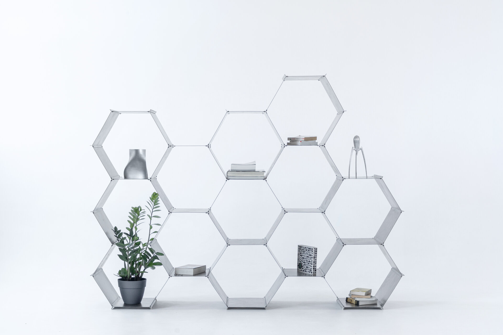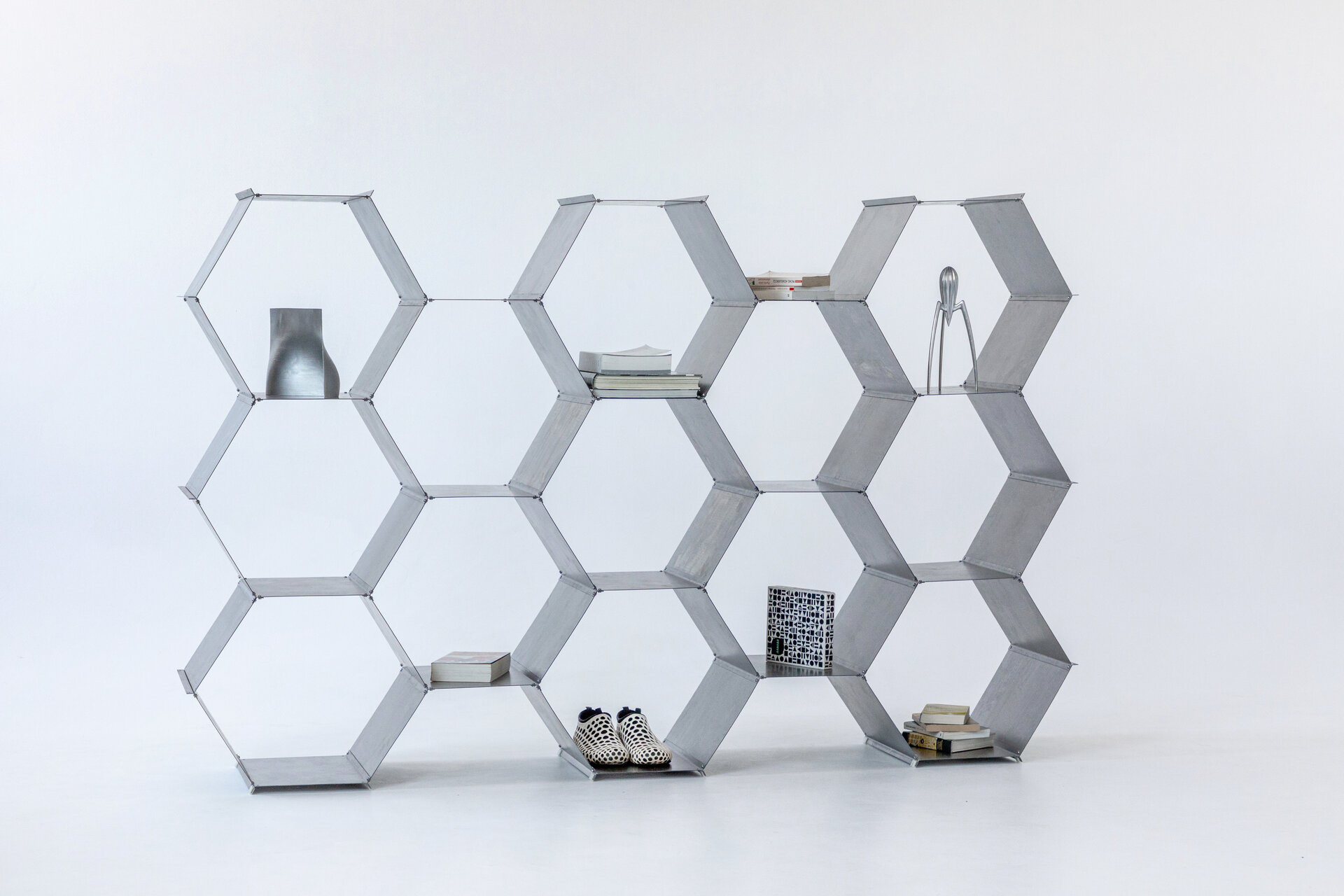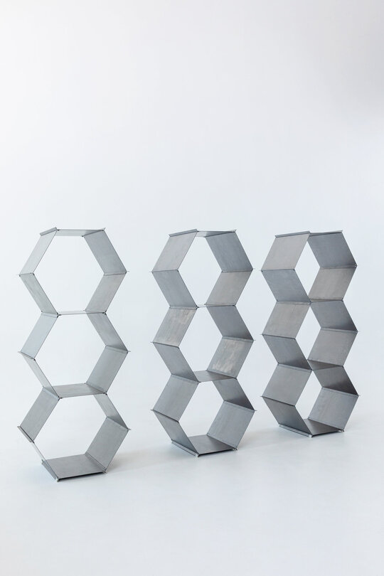 120° este unghiul de generare a unui fagure. Pentru a construi, însă, un obiect spațial, la o scară mai mare, problema s-a rezumat la a găsi forma unui singur segment care să devină 'formula' de multiplicare nelimitată a hexagonului. Astfel, elementul generator este realizat dintr-o bucată de tablă plană ale cărei două laturi opuse sunt îndoite la un unghi de 120°, formându-se două mici 'aripi'. La fiecare capăt îndoit al elementului sunt prevăzute, simetric, față de axul de îndoire, câte 4 găuri, facilitând, permanent, prinderea mecanică a doua, respectiv trei segmente care vor forma cele două tipuri de noduri ale structurii de tip fagure. Evident, această rețea spațială poate fi o etajeră, o bibioteca, sau un perete diafan. Poate fi amplasată acasă, într-un spațiu comercial sau expozițional. Poate deveni chiar o structura portantă. Grosimea mică a tablei creează jocuri interesante de materialitate, în funcție de poziția privitorului. Structura pare, deopotrivă, fragilă sau robustă. În termeni de eficiență și sustenabilitate, existența unui singur tip de element asigură atât o producție simplificată, cât și o compactare a numărului de elemente într-un volum minim, ceea ce face ca, atât transportul cât și depozitarea, să fie posibile în condiții avantajoase. Asamblarea e relativ ușoară și permite realizarea unei multitudini de forme și dimensiuni.