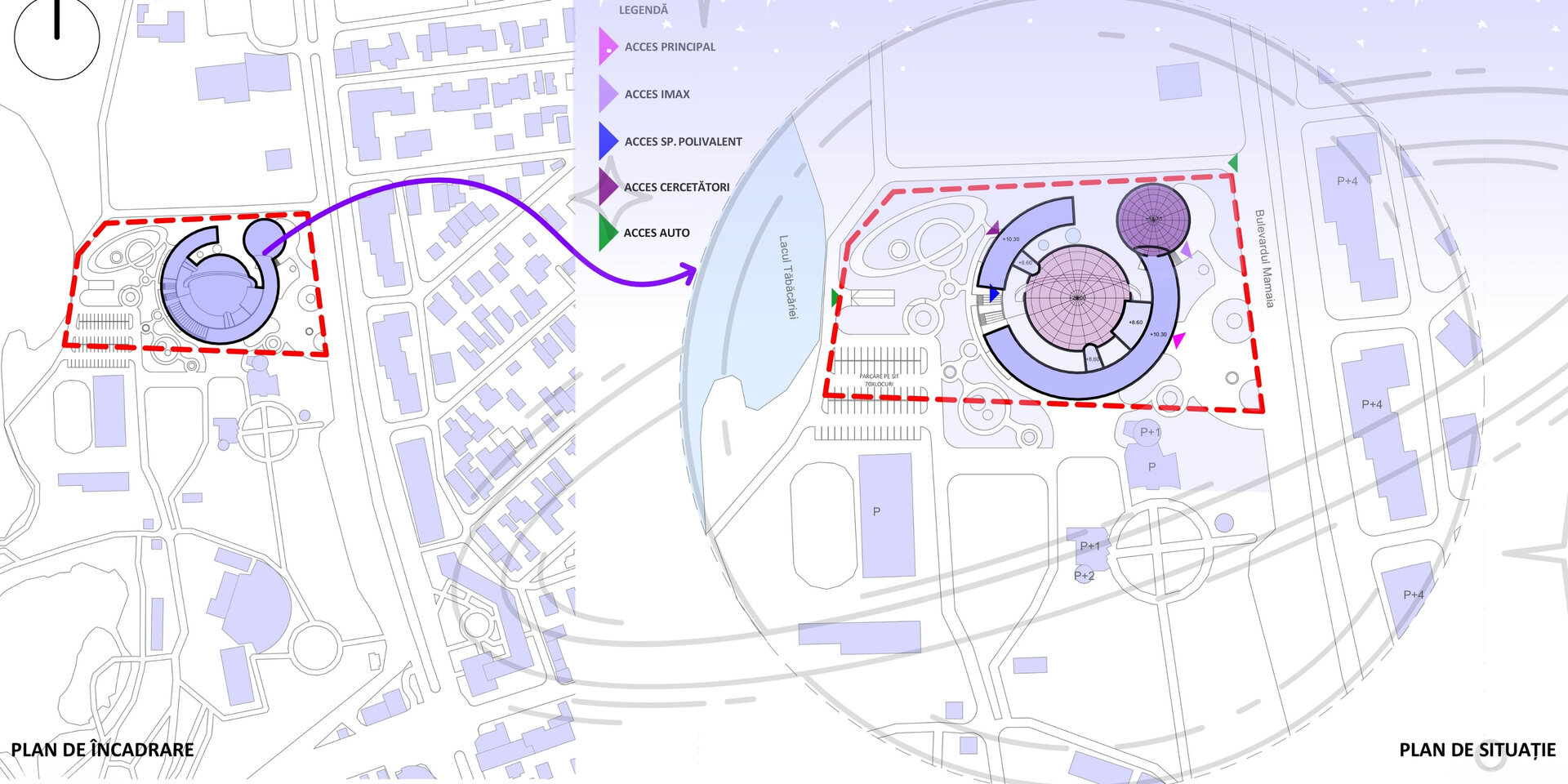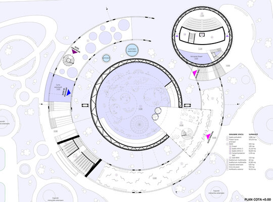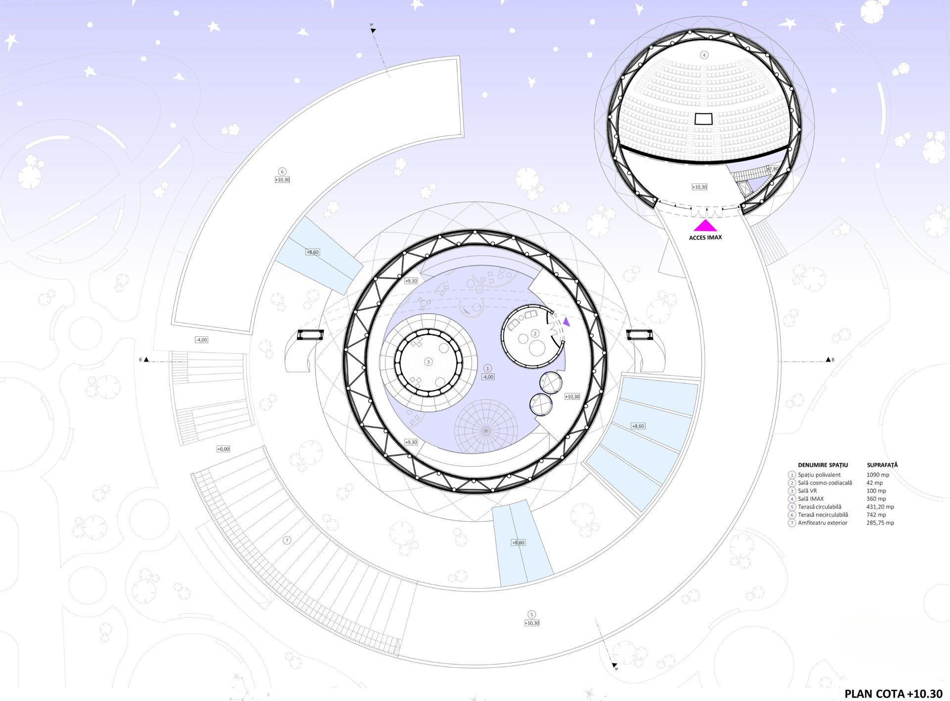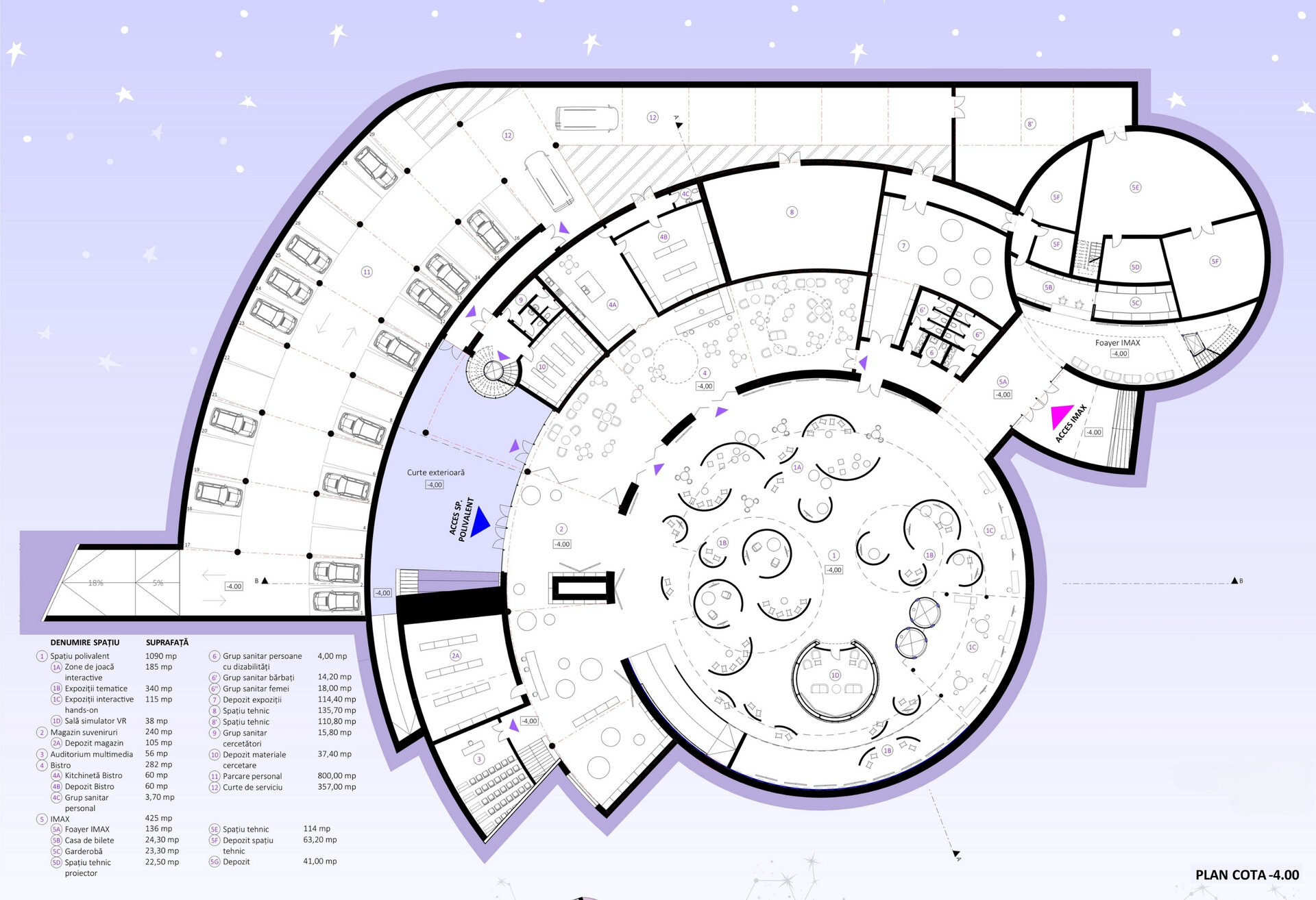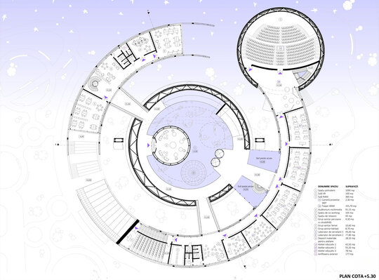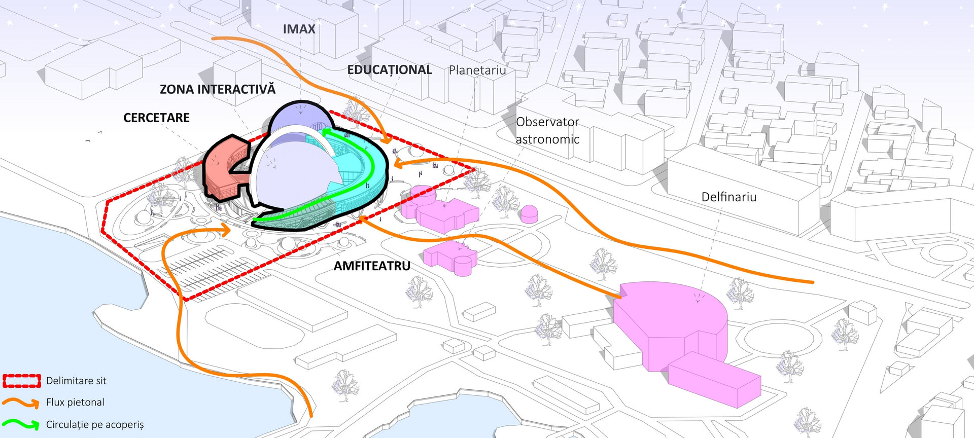 La nivelul conceptului de proiectare, structura propusă se organizează în jurul a trei zone majore: spațiul polivalent distributiv, zona educațională și interactivă și zona de cercetare. Întregul demers volumetric pornește de la aceste funcțiuni clar delimitate, dar și de la simboluri inspirate din astronomie, transcrise într-o compoziție de tip radial.
