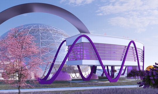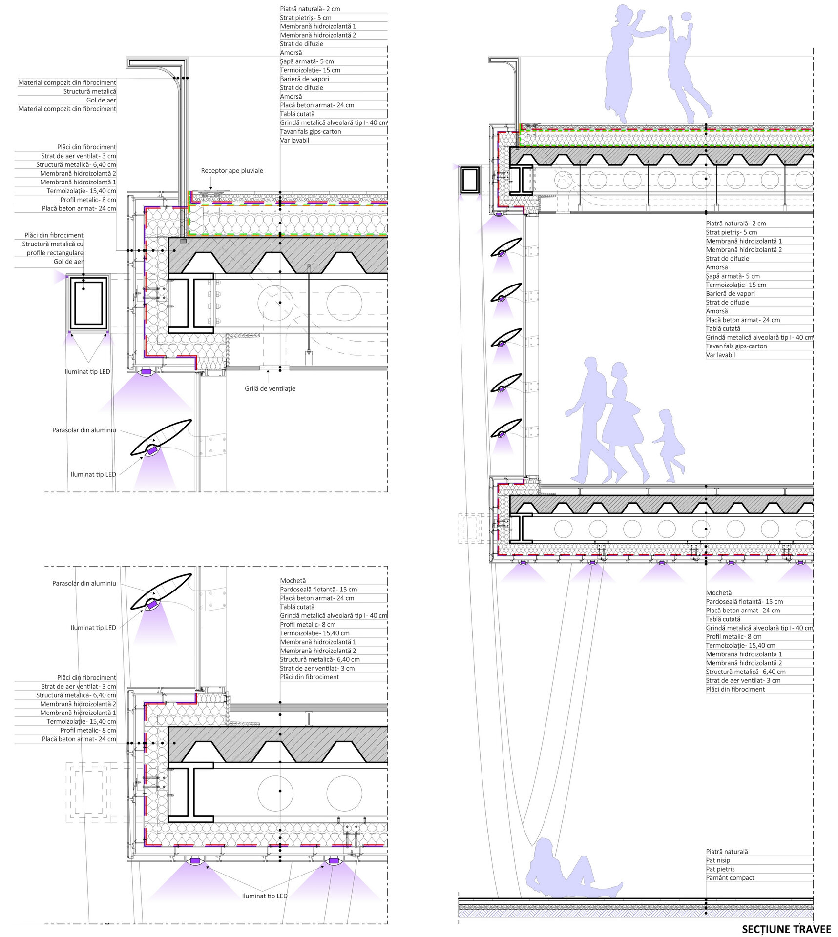 Cele două semisfere exterioare sunt realizate dintr- o structură metalică tridimensională, cu înveliș format din panouri pregătite pentru proiecții media. În interior, cele trei sfere suspendate au o structură metalică alcătuită din profile rulate, fixate prin tiranți de structura spațială a semisferei. Pentru volumele liniare dispuse radial, am ales integrarea unor elemente fluide sinusoidale cu rol de susținere. Acestea, detașate de bare și continuate prin grinzi metalice de tip I, creează o dinamică structurală vizibilă în detaliul de travee, acolo unde se intersectează cu planșeele.