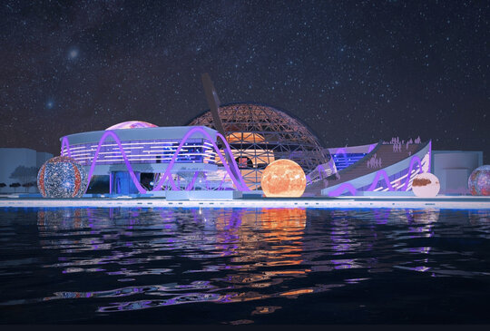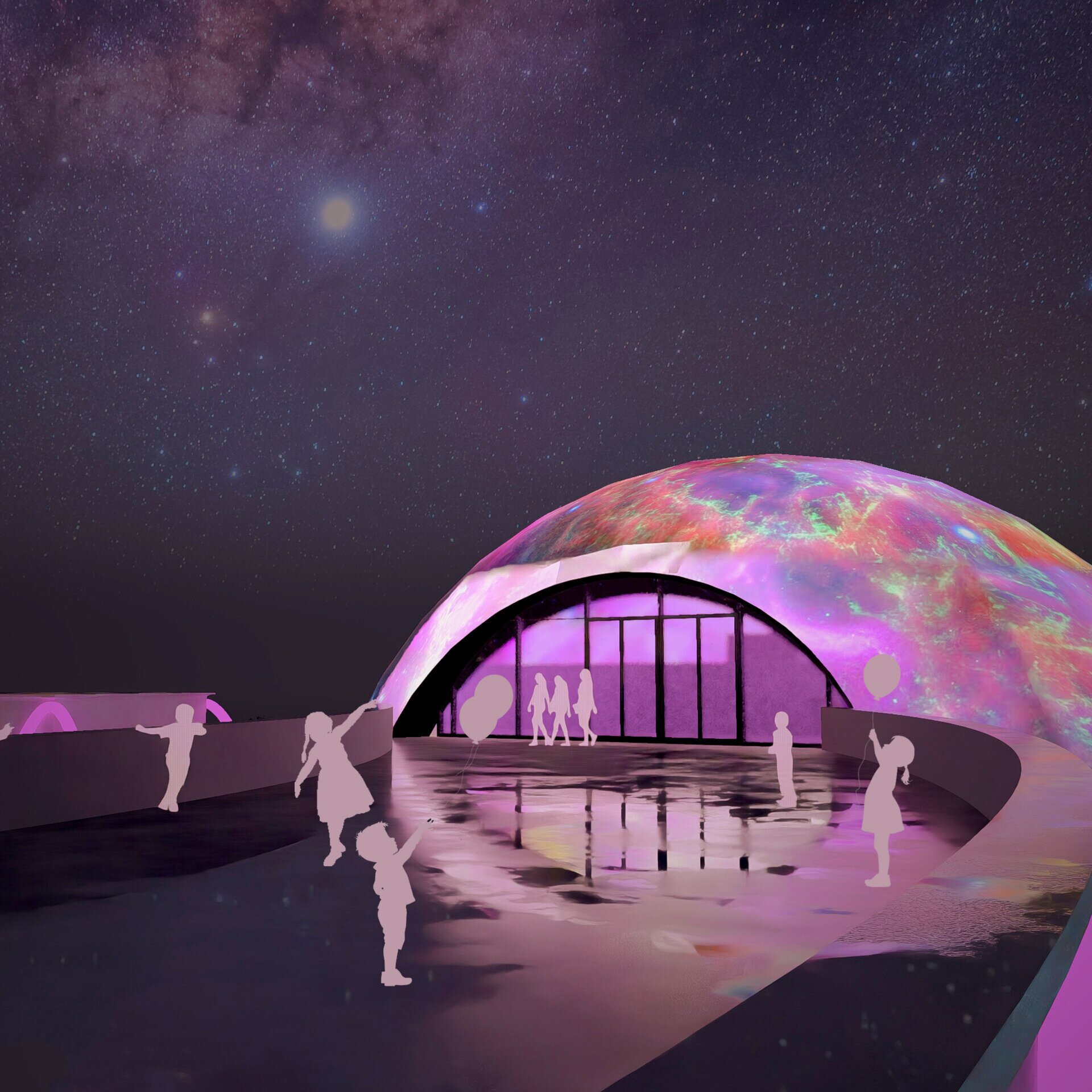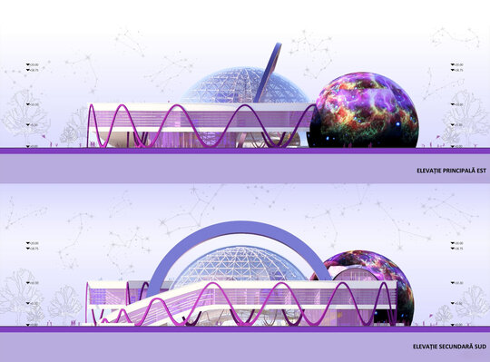 Având în vedere că astronomia se dezvăluie mai ales pe timp de noapte, am imaginat o iluminare arhitecturală cu LED-uri care pune în valoare atât sinusoidalele, cât și fațadele multimedia. IMAX-ul, amplasat strategic către bulevardul Mamaia și zona de acces principal, devine un reper vizual ce atrage privirea și invită publicul spre explorare.