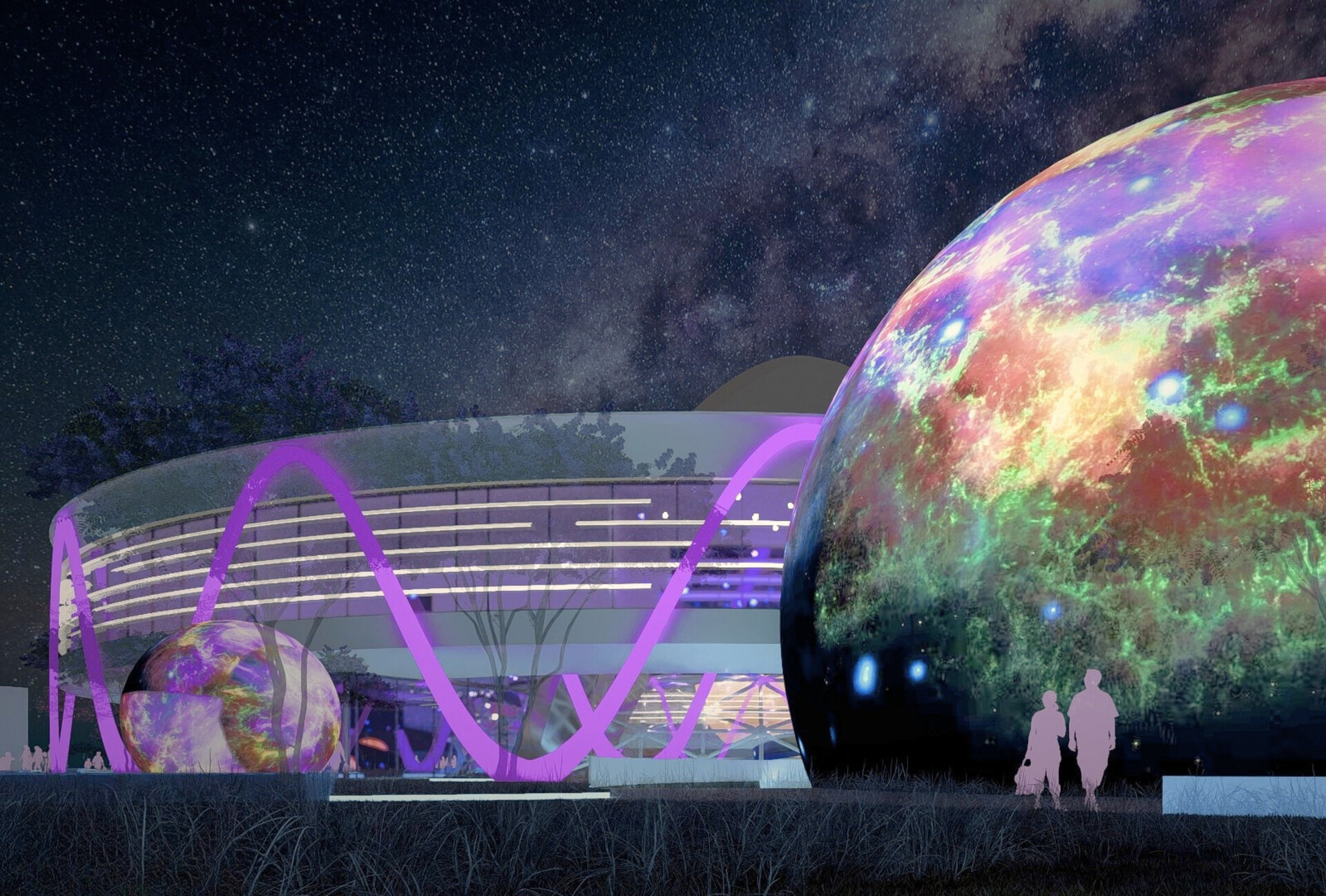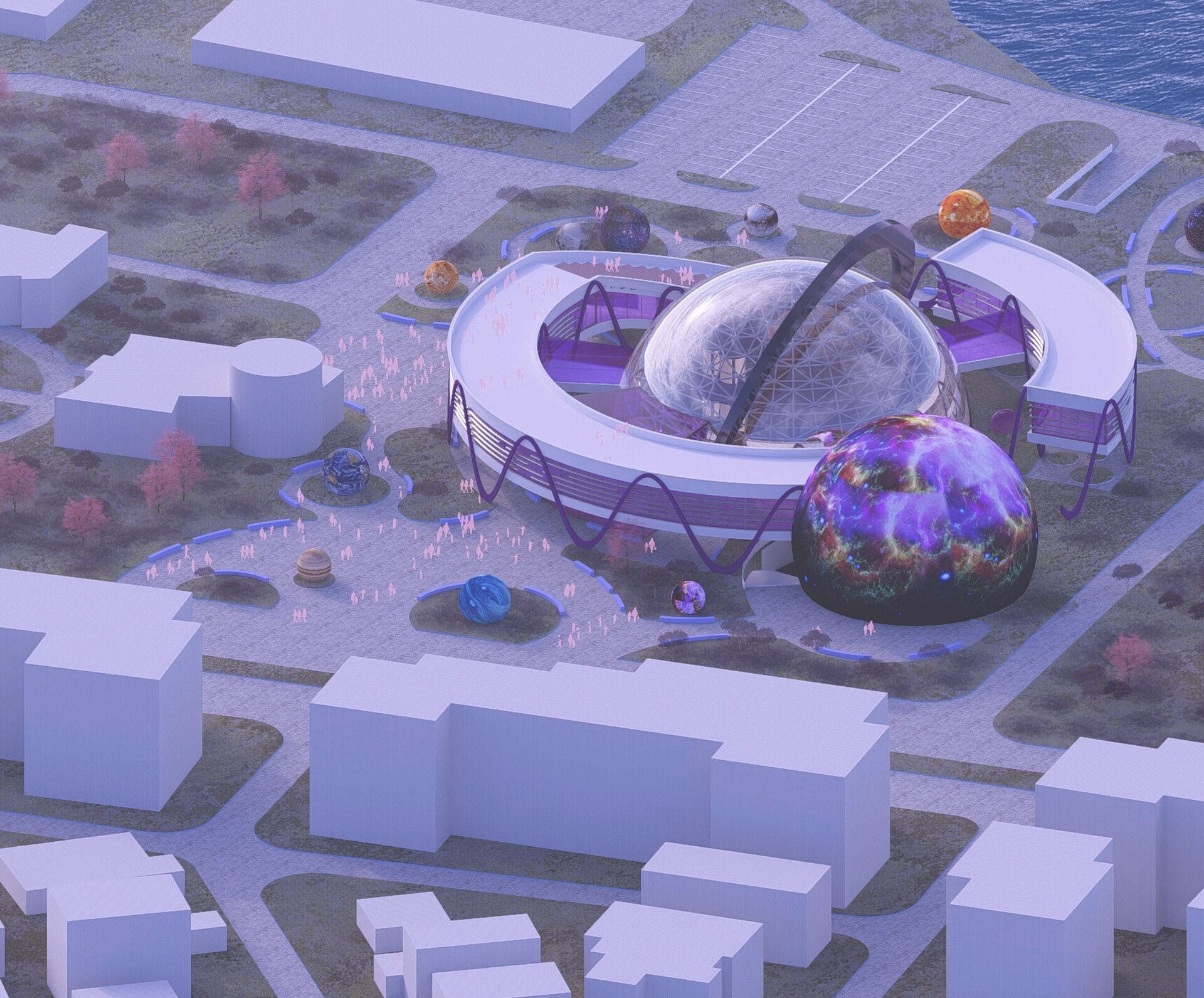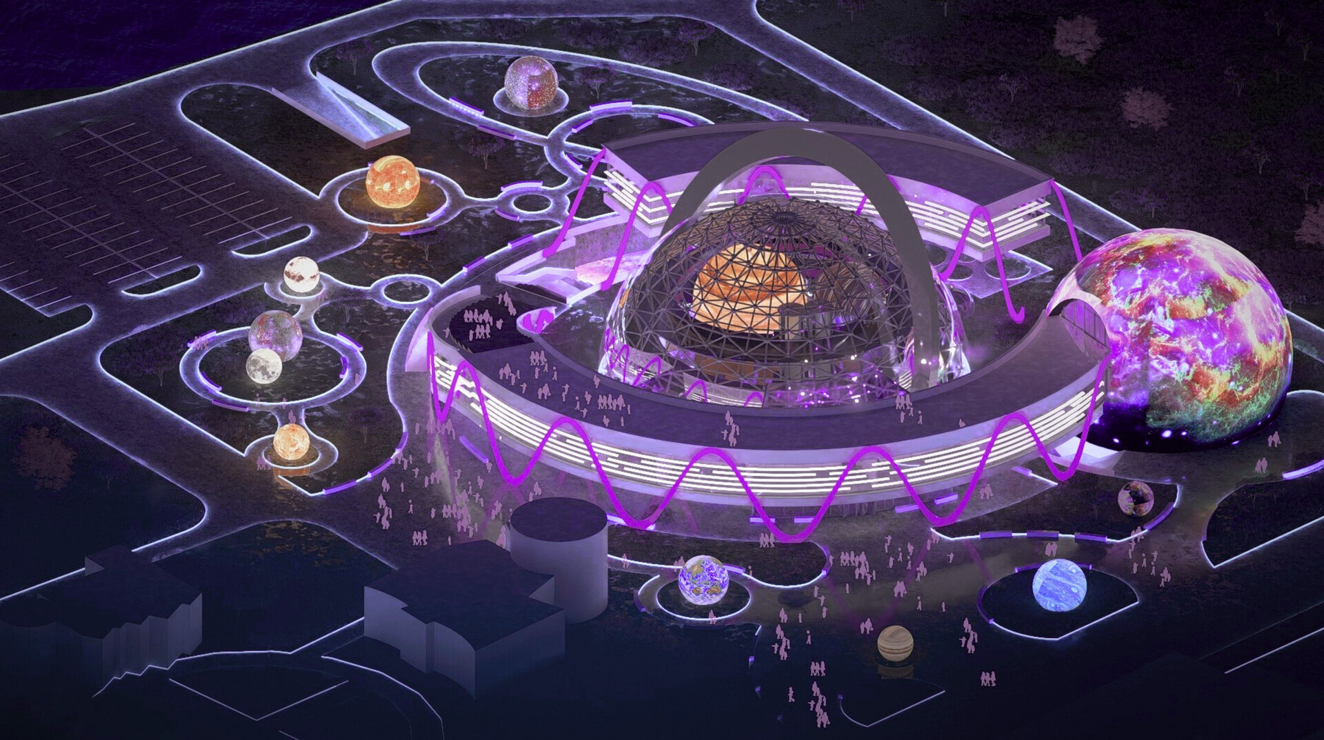 Spațiul central, nucleul de interes al proiectului, este definit de un volum semisferic ce adăpostește zona polivalentă. În jurul acestuia „gravitează” două volume liniare care concentrează funcțiunile educaționale și de cercetare. Această organizare trimite metaforic la imaginea planetei Saturn și a inelelor sale, construind o referință directă între arhitectură și univers. În completarea ansamblului, un al doilea corp sferic, configurat ca sală de tip IMAX, aduce o experiență spectaculoasă, imersivă.