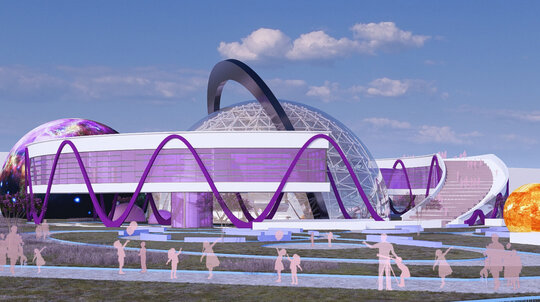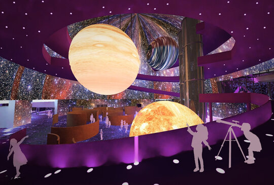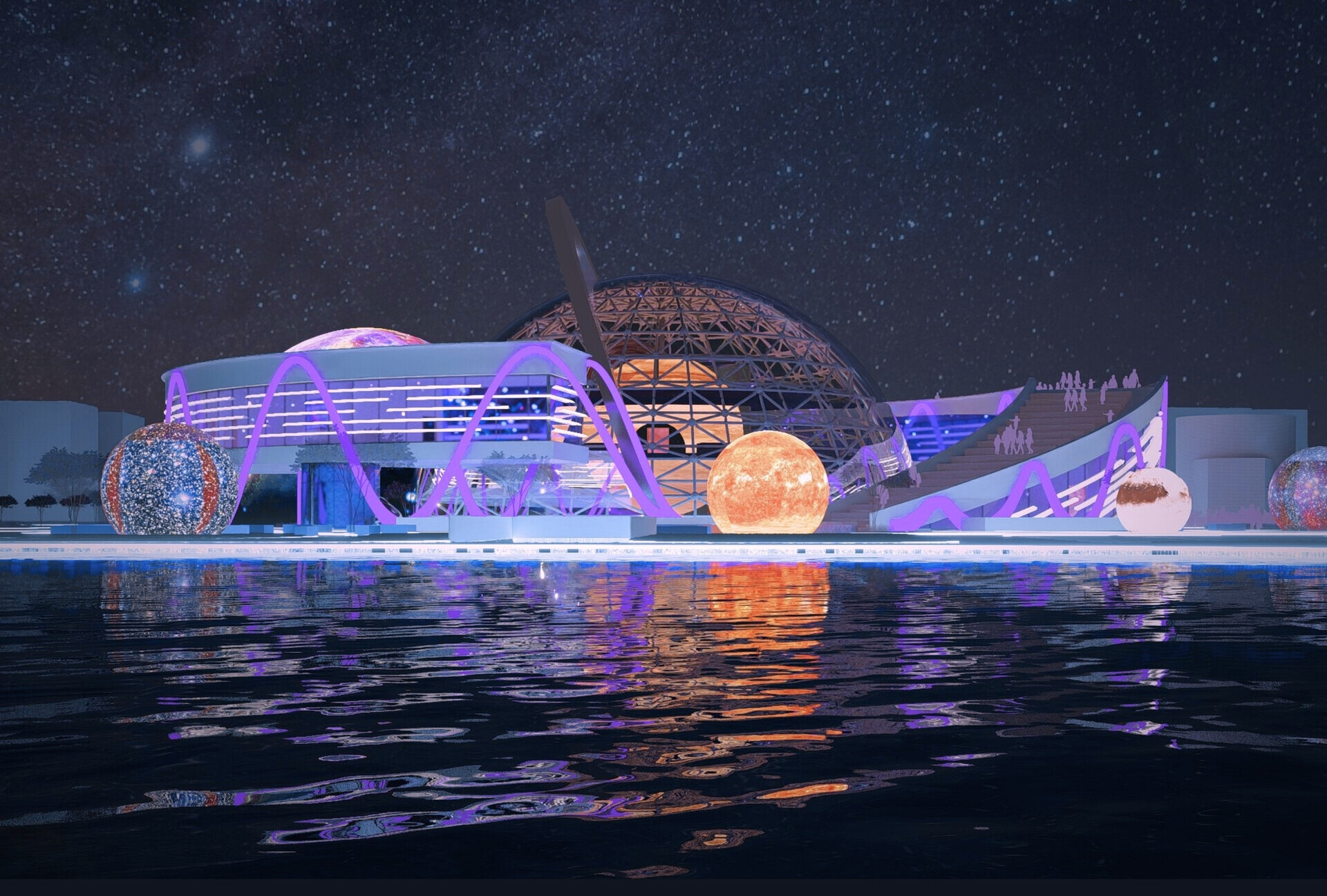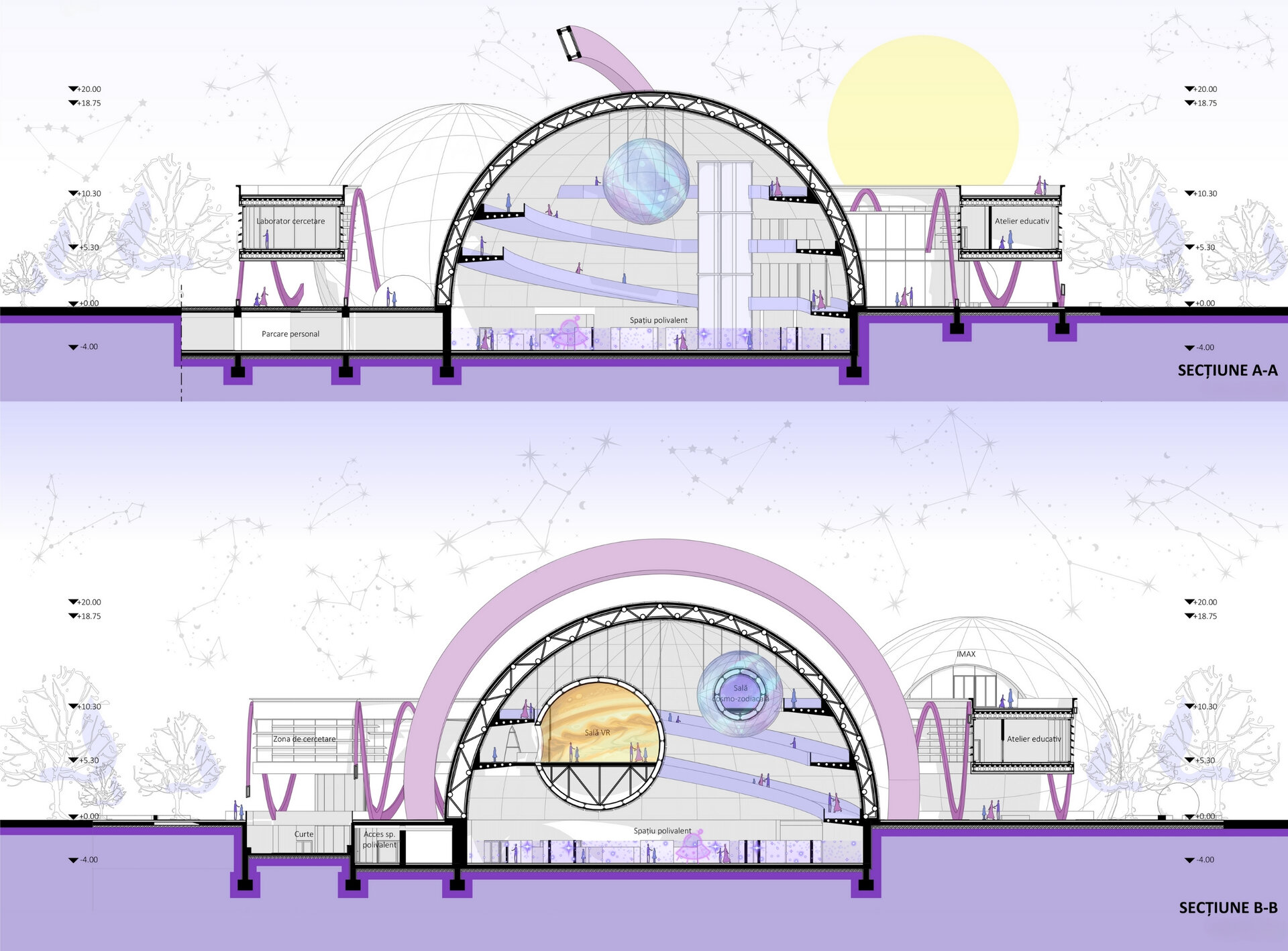 Spațiul central, nucleul de interes al proiectului, este definit de un volum semisferic ce adăpostește zona polivalentă. În jurul acestuia „gravitează” două volume liniare care concentrează funcțiunile educaționale și de cercetare. Această organizare trimite metaforic la imaginea planetei Saturn și a inelelor sale, construind o referință directă între arhitectură și univers. În completarea ansamblului, un al doilea corp sferic, configurat ca sală de tip IMAX, aduce o experiență spectaculoasă, imersivă.