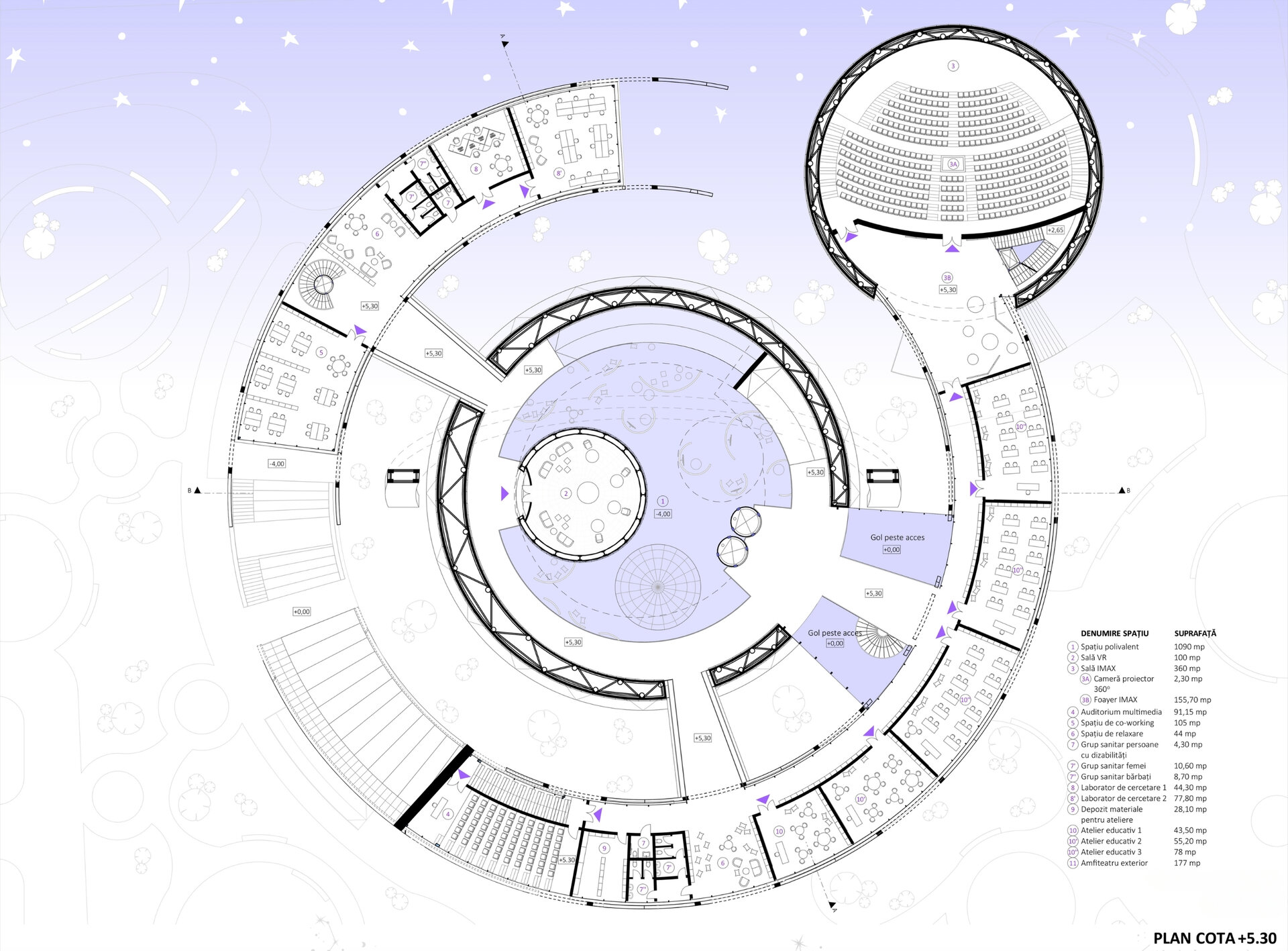 În spațiul central – sala polivalentă – am conceput o rampă ce pornește de la nivelul inferior și se desfășoară ascendent până la cota celor două sfere suspendate în interiorul semisferei. Fixate prin cabluri tensionate, aceste volume plutesc simbolic într-un „mic univers” integrat într-unul mai vast. Parcursul pe rampă devine astfel o experiență inițiatică: o metaforă a ascensiunii intelectuale și educaționale, dar și o trecere de la exoteric spre ezoteric. În același timp, rampa are rol funcțional, asigurând conexiunea către zona de cercetare și către spațiile interactive de la nivelurile superioare.