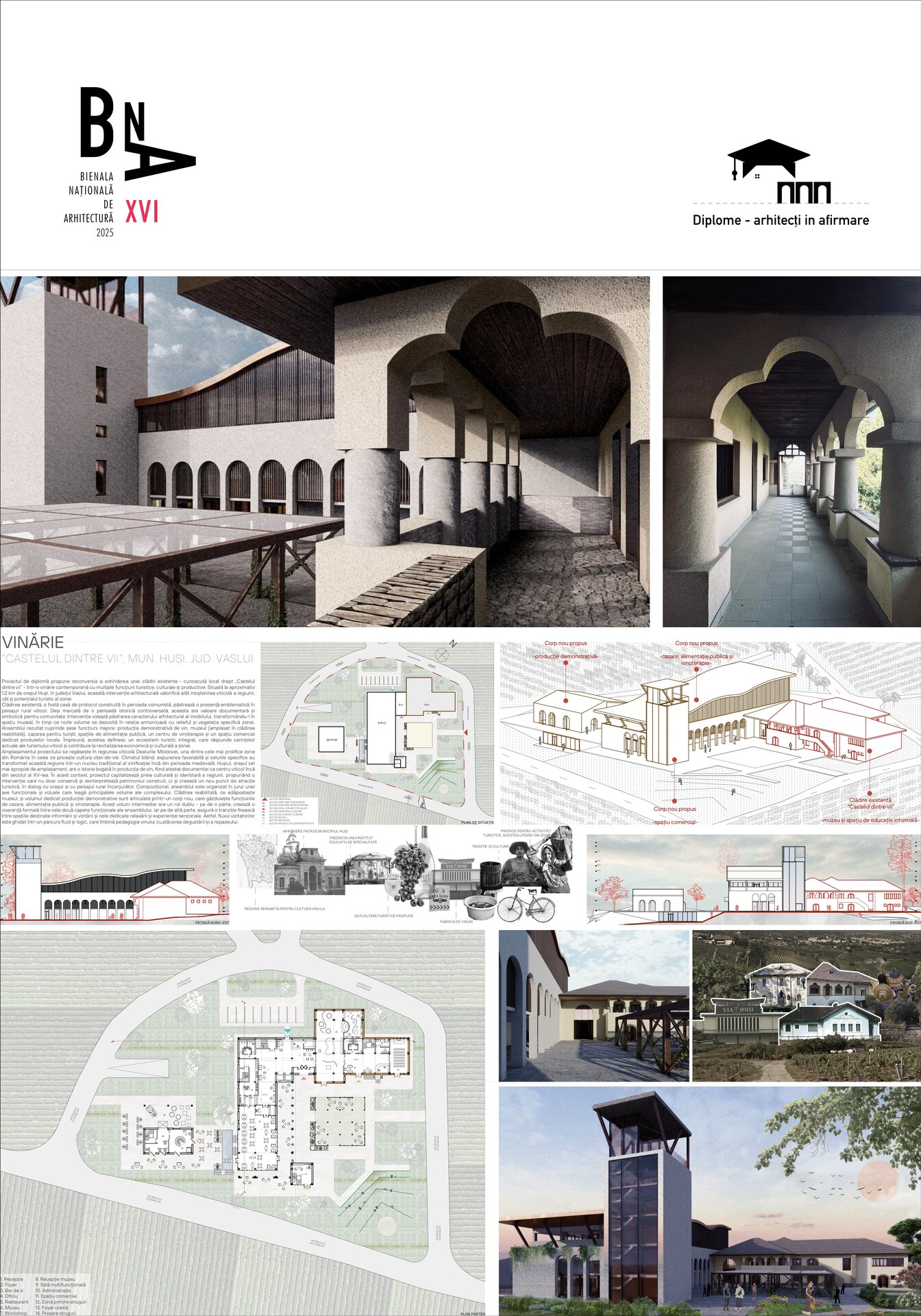 Proiectul de diplomă propune reconversia și extinderea unei clădiri existente - cunoscută local drept „Castelul dintre vii” - într-o vinărie contemporană cu multiple funcțiuni turistice, culturale și productive. Situată la aproximativ 1,2 km de orașul Huși, în județul Vaslui, această intervenție arhitecturală valorifică atât moștenirea viticolă a regiunii, cât și potențialul turistic al zonei.