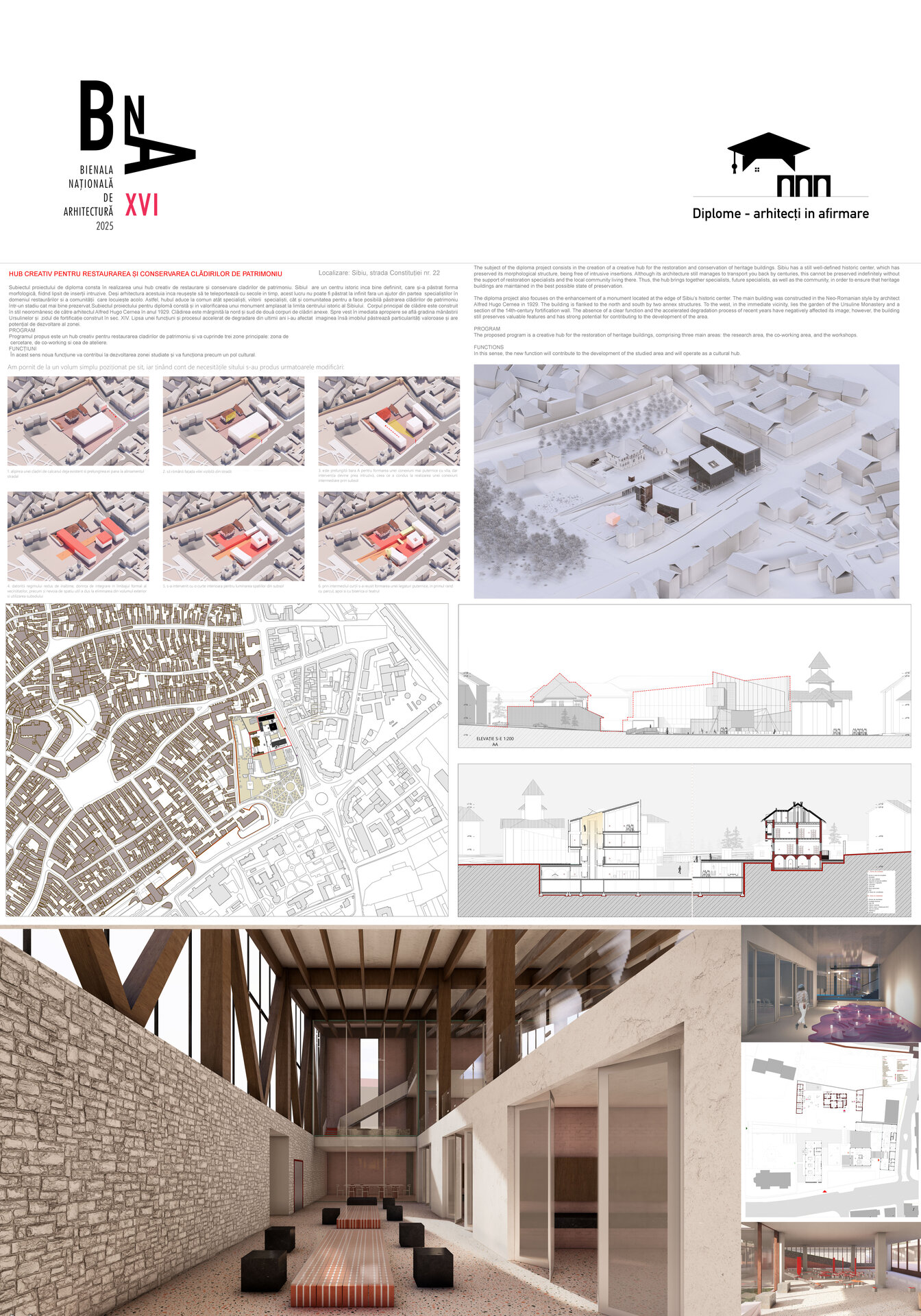 Subiectul proiectului de diploma consta în realizarea unui hub creativ de restaurare și conservare cladirilor de patrimoniu. Sibiul are un centru istoric inca bine defininit, care și-a păstrat forma morfologică, fiidnd lipsit de inserții intruzive. Deși arhitectura acestuia inca reușește să te teleportează cu secole in timp, acest lucru nu poate fi păstrat la infinit fara un ajutor din partea specialiștilor în domeniul restaurărilor si a comunității care locuiește acolo. Astfel, hubul aduce la comun atât specialiști, viitorii specialiști, cât și comunitatea pentru a face posibilă păstrarea clădirilor de patrimoniu într-un stadiu cat mai bine prezervat.Subiectul proiectului pentru diplomă constă și in valorificarea unui monument amplasat la limita centrului istoric al Sibiului. Corpul principal de clădire este construit în stil neoromânesc de către arhitectul Alfred Hugo Cernea în anul 1929. Clădirea este mărginită la nord și sud de două corpuri de clădiri anexe. Spre vest în imediata apropiere se află gradina mănăstirii Ursulinelor și zidul de fortificație construit în sec. XIV. Lipsa unei funcțiuni și procesul accelerat de degradare din ultimii ani i-au afectat imaginea însă imobilul păstrează particularități valoroase și are potențial de dezvoltare al zonei.