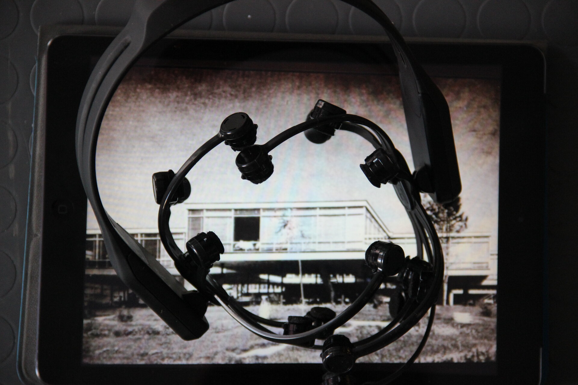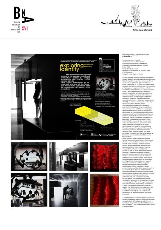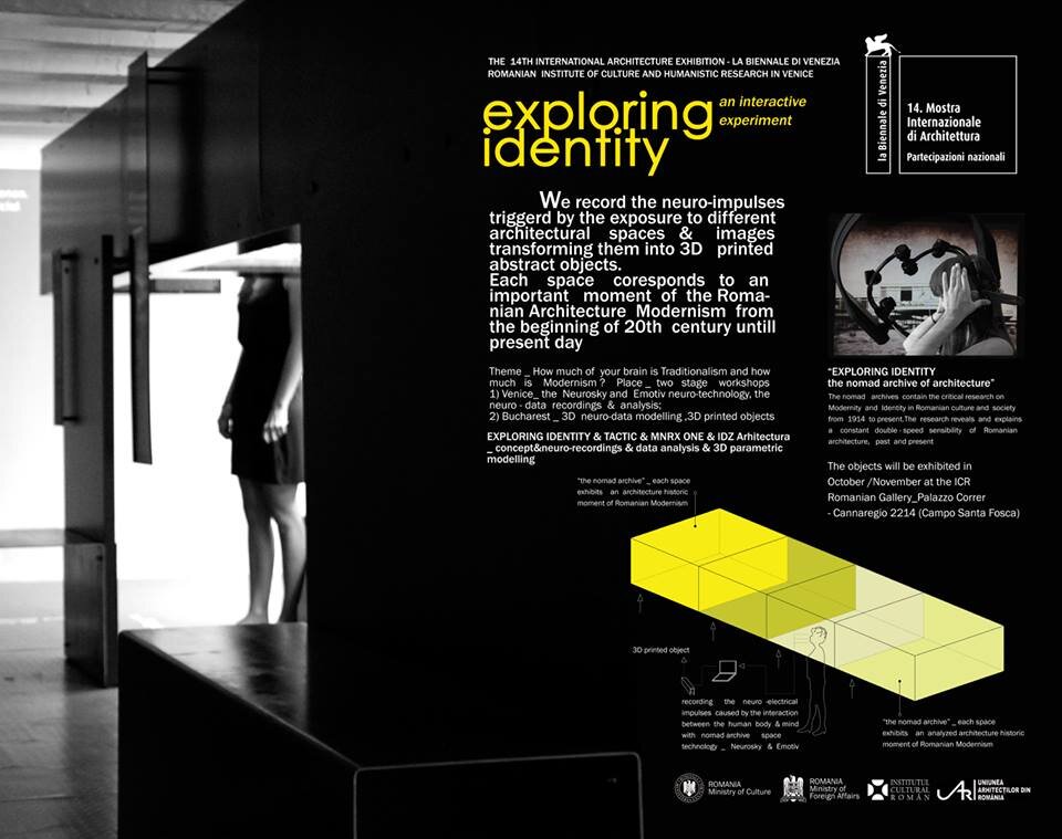 În cadrul instalației Exploring Identity ce a reprezentat România la Bienala de Arhitectură de la Veneția în spațiul ICR, a fost gândit un experiment de neuro-analiză ce avea la baza un echipament apărut în ultimii ani, Castile Emotiv EPOC cu 14 canale EEG wireless căștile neuronale fiind dedicate publicului larg, care, în condiții protejate, puteau înregistra activitatea cerebrală a subiectului la un moment dat si cu o anumita acuratețe. Echipa a aplicat aceste dispozitive în legătură cu cartarea stimulilor față de imaginile arhitecturale ce expuneau un stil puternic reprezentat. Subiectul era invitat să privească un șir de imagini cu arhitectură românească modernistă, alternată cu arhitectură neo-românească pentru a vedea dacă există un stimul diferit față de cele două stiluri și dacă există un răspuns neuronal la un stimul imagistic - stilistic.