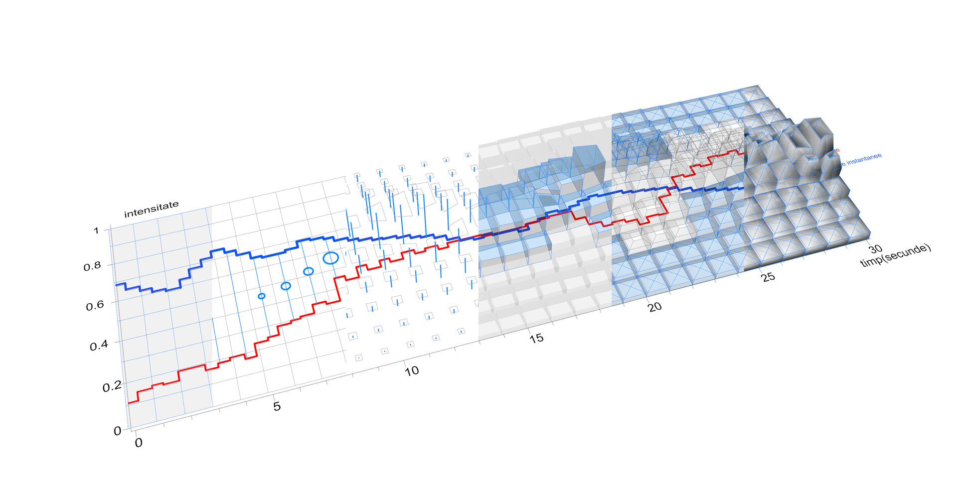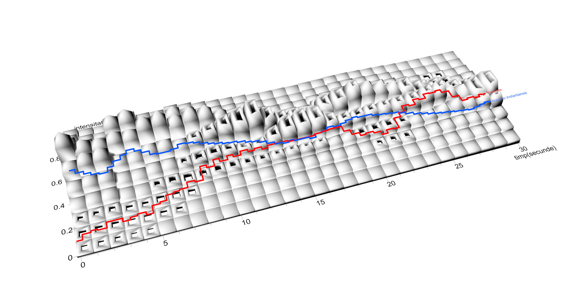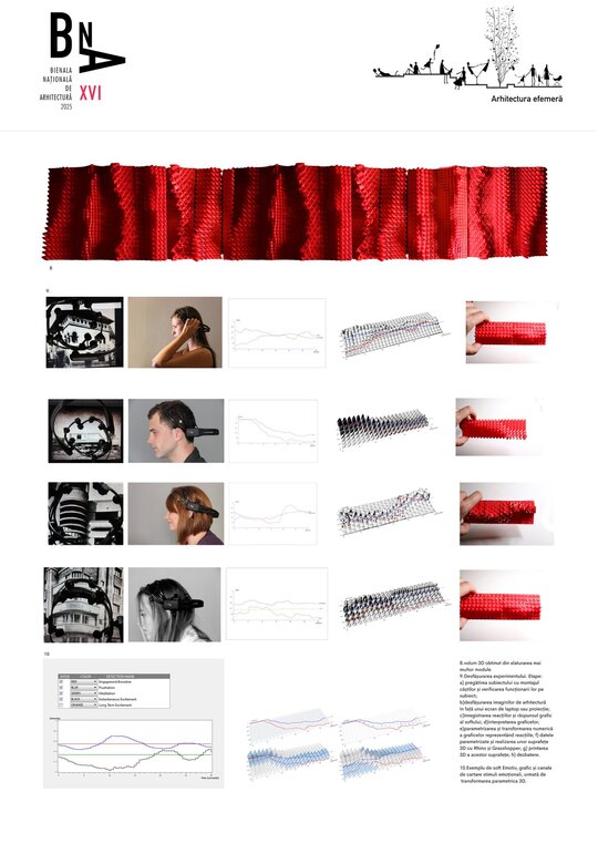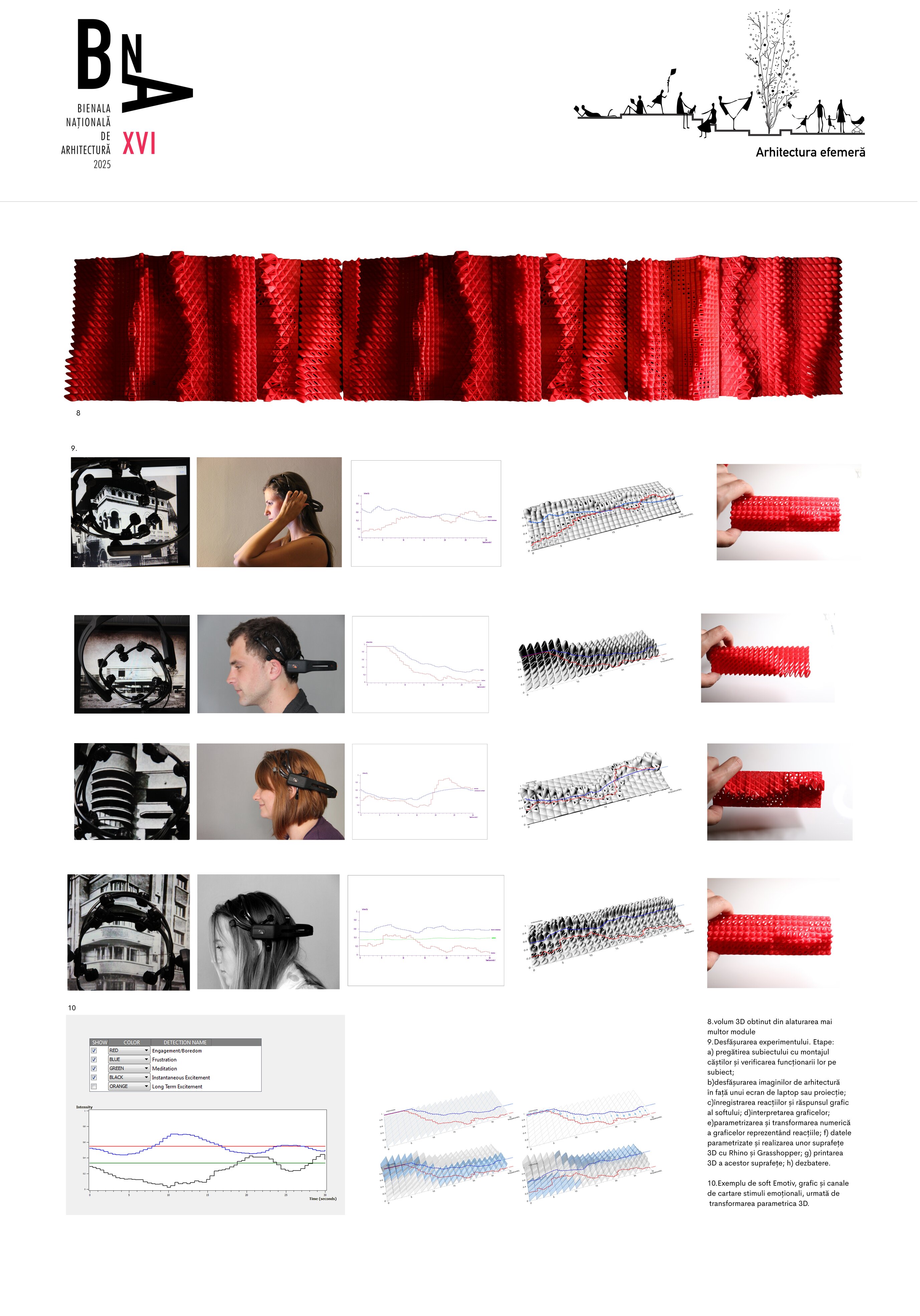 Toate imaginile erau cu arhitectură românească ( mai ales interbelică, dar și contemporană). Softul echipamentului avea o interfață care prezenta grafic pe 5 componente, reacția neuronală pe o perioada de 30 minute, cât a durat fiecare experiment.Componentele emoționale erau: Plictis/Implicare, Frustrare/Neplăcere, Meditație, Bucurie Instantanee, Bucurie îndelungată. Fiecare subiect a ales să facă parte din experiment, și fiecare experiment a fost în cadrul Galeriei ICR, fără ca subiecții să se intersecteze în același timp. Datele obținute, graficele respective, au fost interpretate și secvențe din ele au fost transformate pe baza numerica, utilizând sotfurile Rhino și Grasshopper, în suprafețe tridimensionale, care au fost printate 3D. Reprezentarile reactiilor neuronale au fost codificate numeric si cu acest set de date, introduse in cele doua softuri, a putut sa fie construit cate un model abstract 3D cu reactia fiecarui subiect.