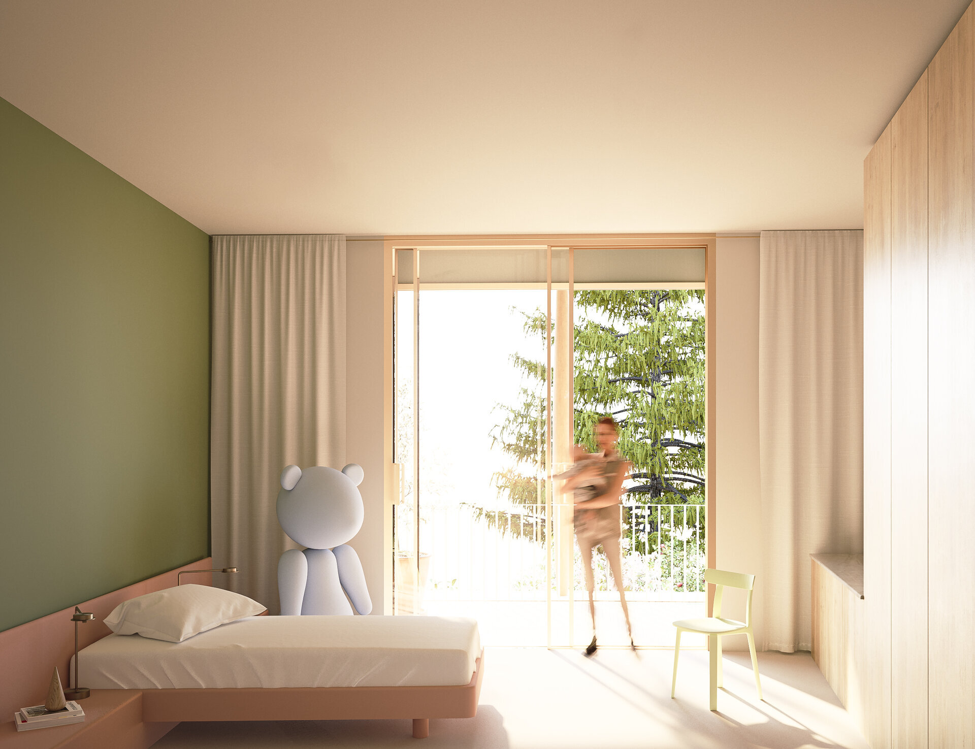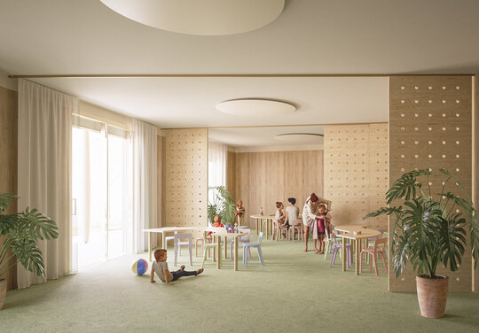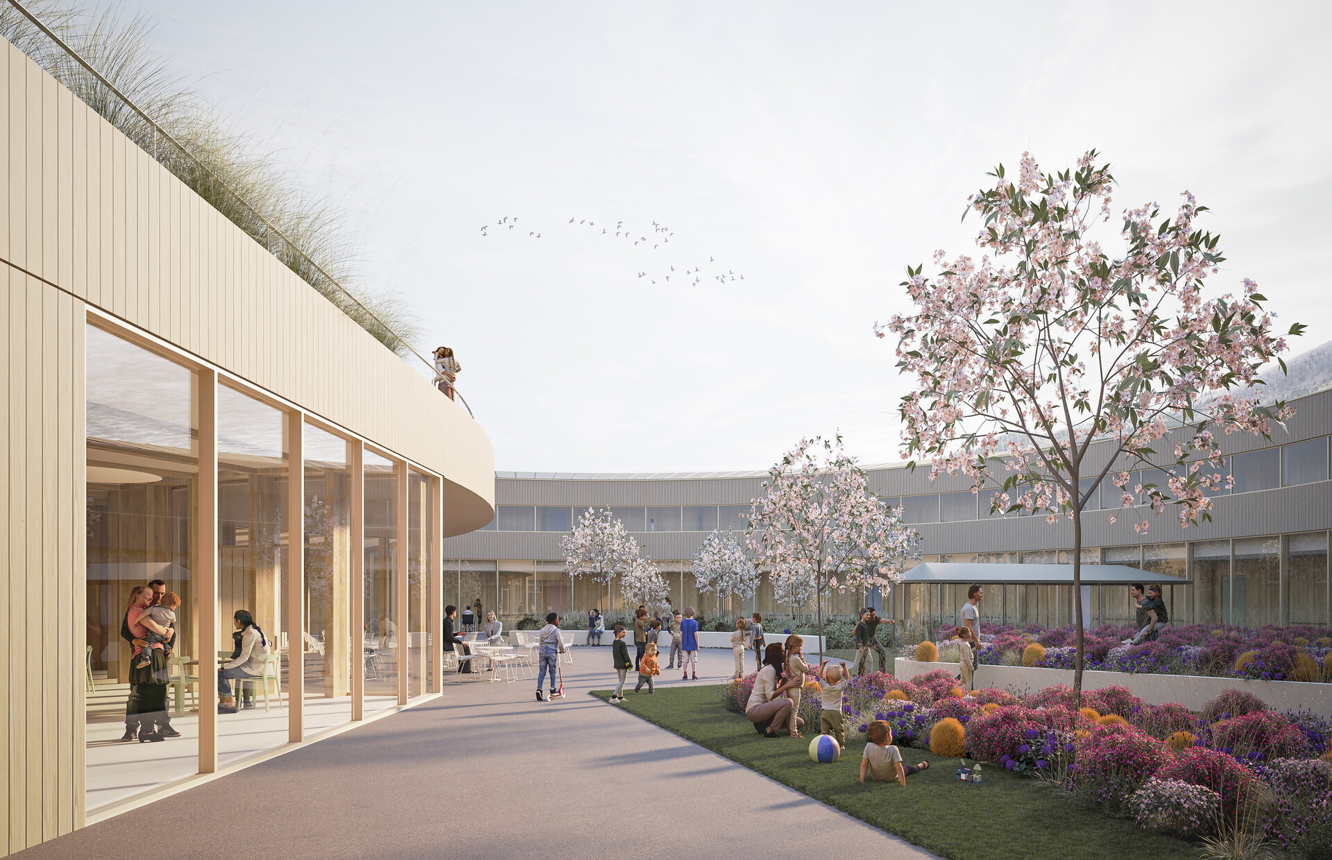 Aflându-ne într-un context natural atât de bogat, ne-am dorit ca natura să primeze și arhitectura să se contopească în peisaj. Am gândit un volum aplatizat ce se întinde organic pe platoul larg al sitului, cu înălțime redusă (P+1) și o geometrie liberă care se apropie de scara umană și creează un mediu cât mai prietenos copiilor.
