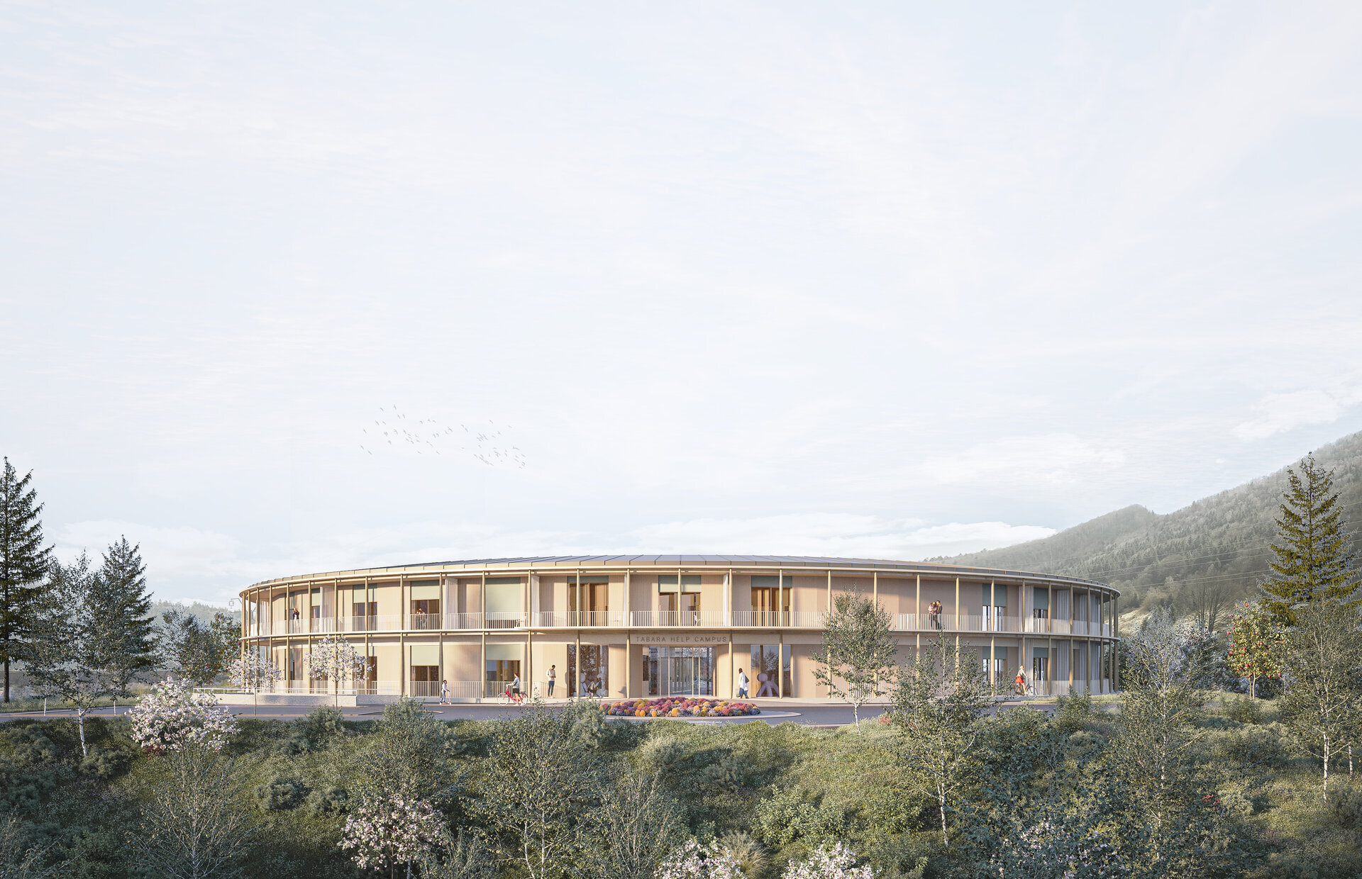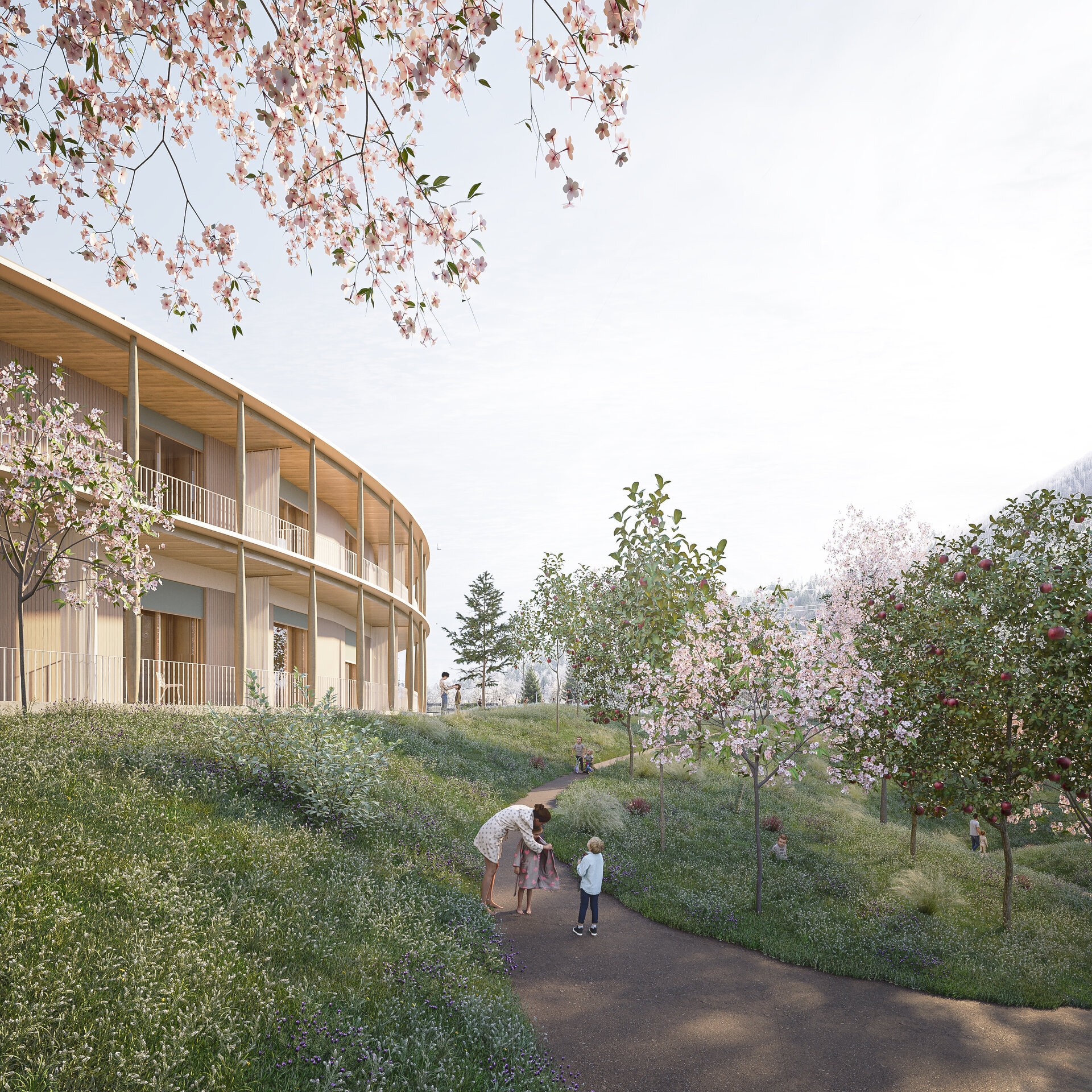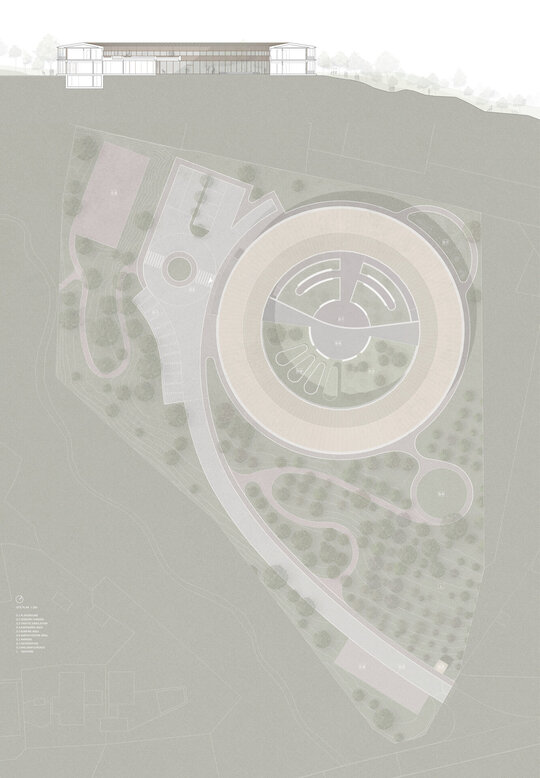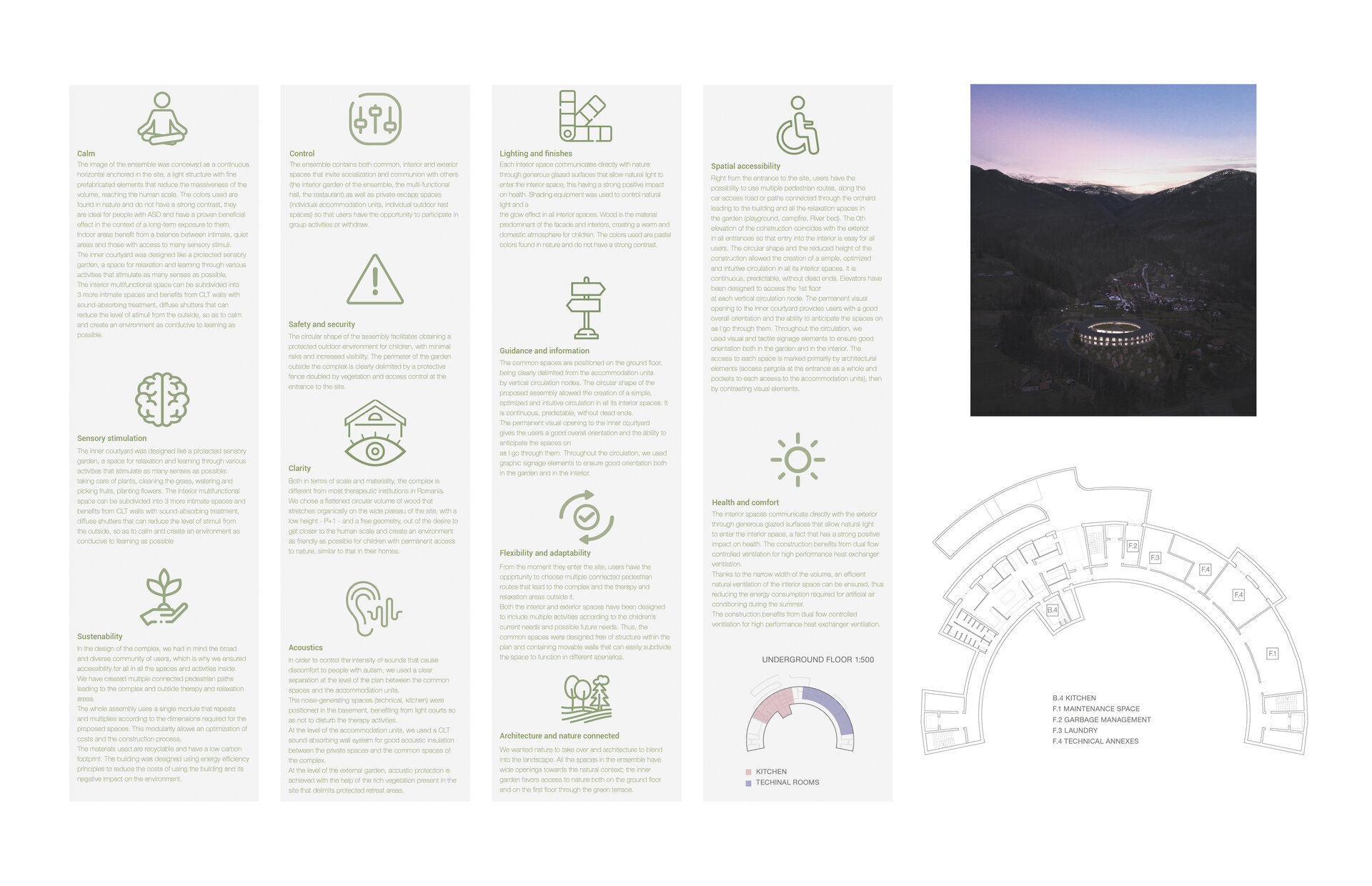 Volumul circular propus, o formă perfectă, are capacitatea de a deveni un reper pentru contextul în care se află. Cercul se orientează spre peisajele spectaculoase din împrejurimi. Spre centrul său dezvoltă o grădină senzorială amplă ce favorizează pătrunderea luminii naturale în spațiile interioare. Aceasta a fost gandită ca fiind un spațiu protejat de relaxare și activități de terapie pentru utilizatori atât iarna cât și vara. Construcția funcționează ca o barieră împotriva vânturilor montane și creează un microclimat mai blând în anotimpul rece.