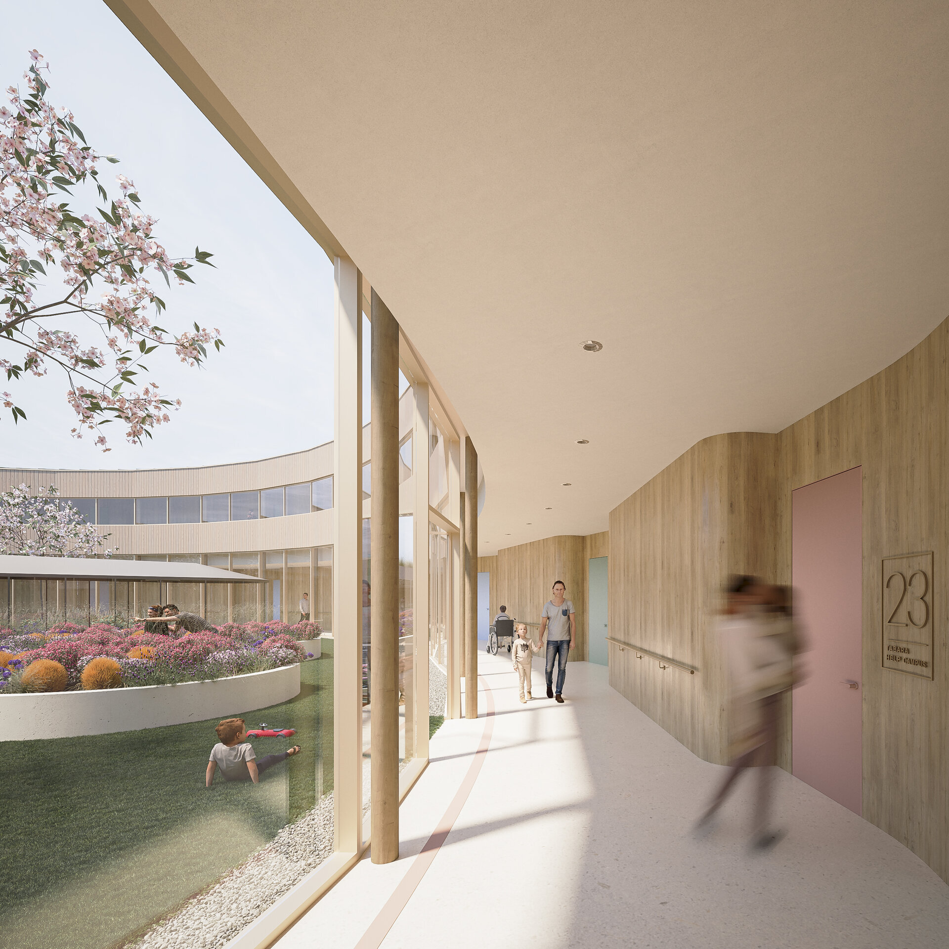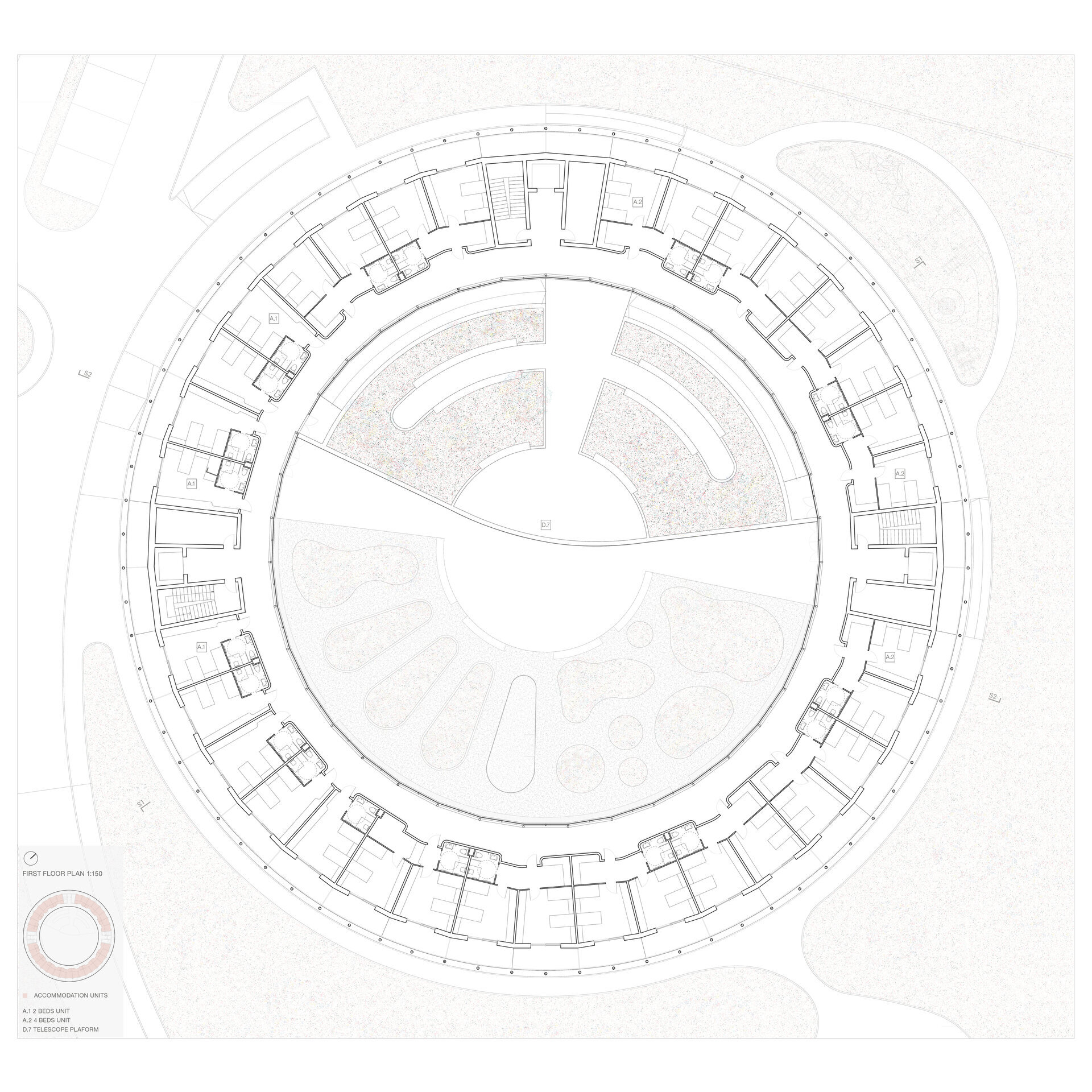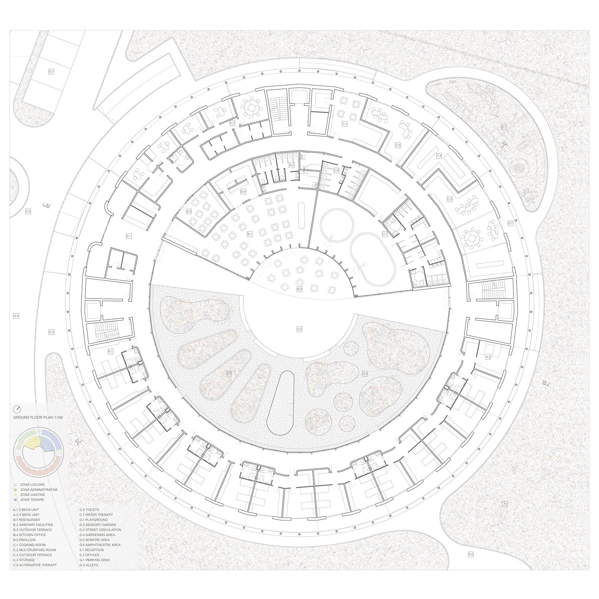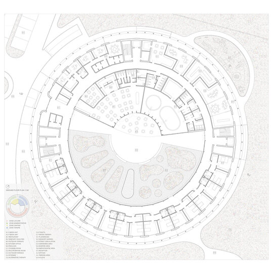 Forma circulară a ansamblului propus a permis crearea unei circulații simple, optimizate și intuitive. Aceasta este predictibilă și fără fundături, benefică pentru pacienții cu TSA. Deschiderea vizuală permanentă spre curtea interioară le oferă o orientare bună în ansamblu și capacitatea de a anticipa spațiile pe masură ce le parcurg.