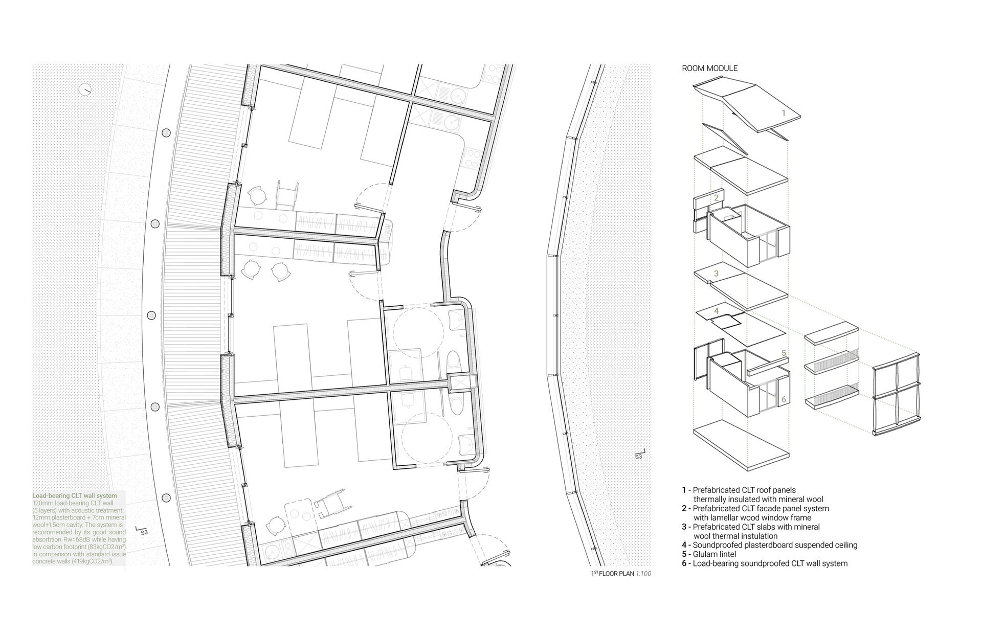 Întreg ansamblul folosește un singur modul care se repetă și se multiplică în funcție de gabaritul necesar spațiilor propuse. Această modularitate permite o optimizare a costurilor și a procesului de construire. Materialele folosite sunt reciclabile și reuitilizabile, contribuind la ciclul de viață sustenabil al clădirii. Lemnul este materialul predominant al fațadei și al interioarelor, creând o atmosferă caldă și domestică pentru copii. Totodată, acesta este ecoul împrejurărilor rurale din Uricani.