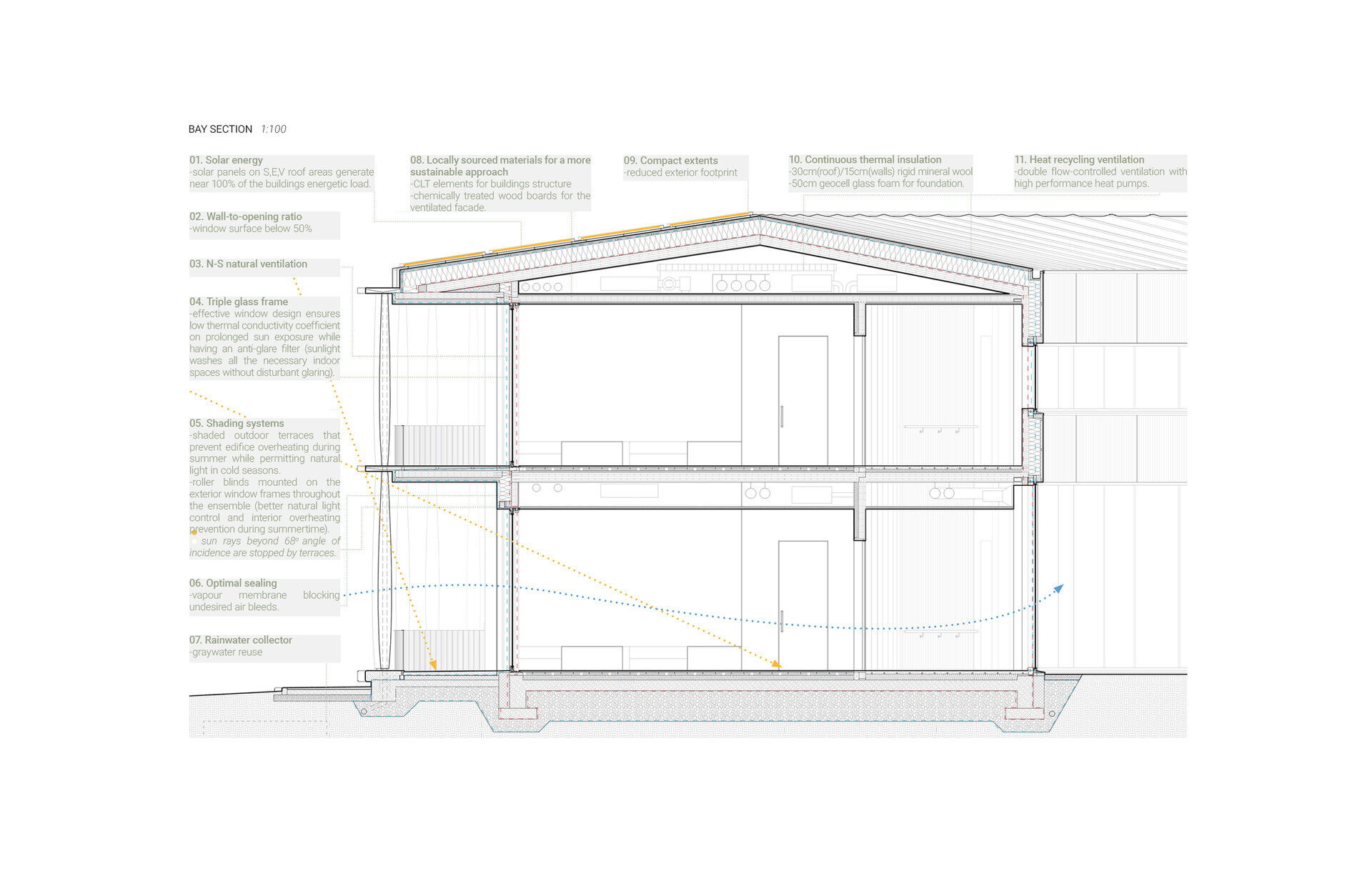 Am gândit un ansamblu sustenabil, cu un grad ridicat de eficiență prin principii clare de proiectare. Volumul compact are un raport optim de plin gol în care fiecare spațiu al ansamblului este iluminat natural. Terasele exterioare acoperite permit pătrunderea razelor blânde ale soarelui în perioada de iarnă, încălzind spațiul interior și vara previn supraîncălzirea prin umbrire.