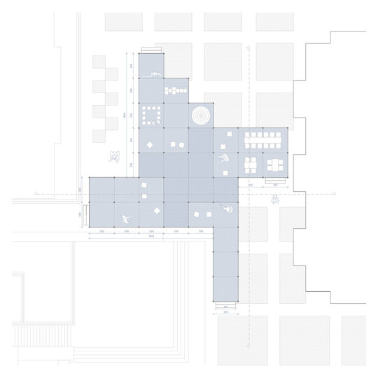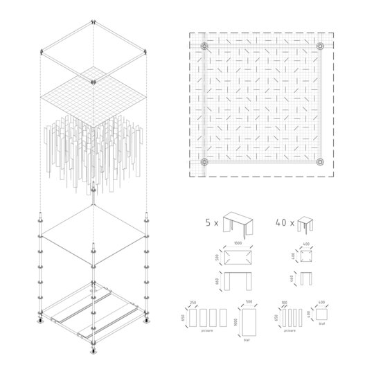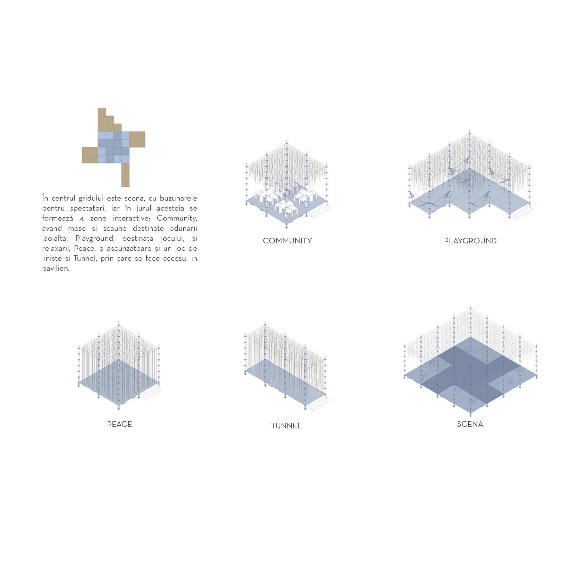 Conceptul modular pornește de la scenă, aceasta extinzându-se prin repetarea unui modul de 2x2m, generând zone cu funcțiuni distincte. Pavilionul nu este doar un loc de performance, ci devine un catalizator urban, un spațiu de întâlnire și descoperire.