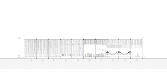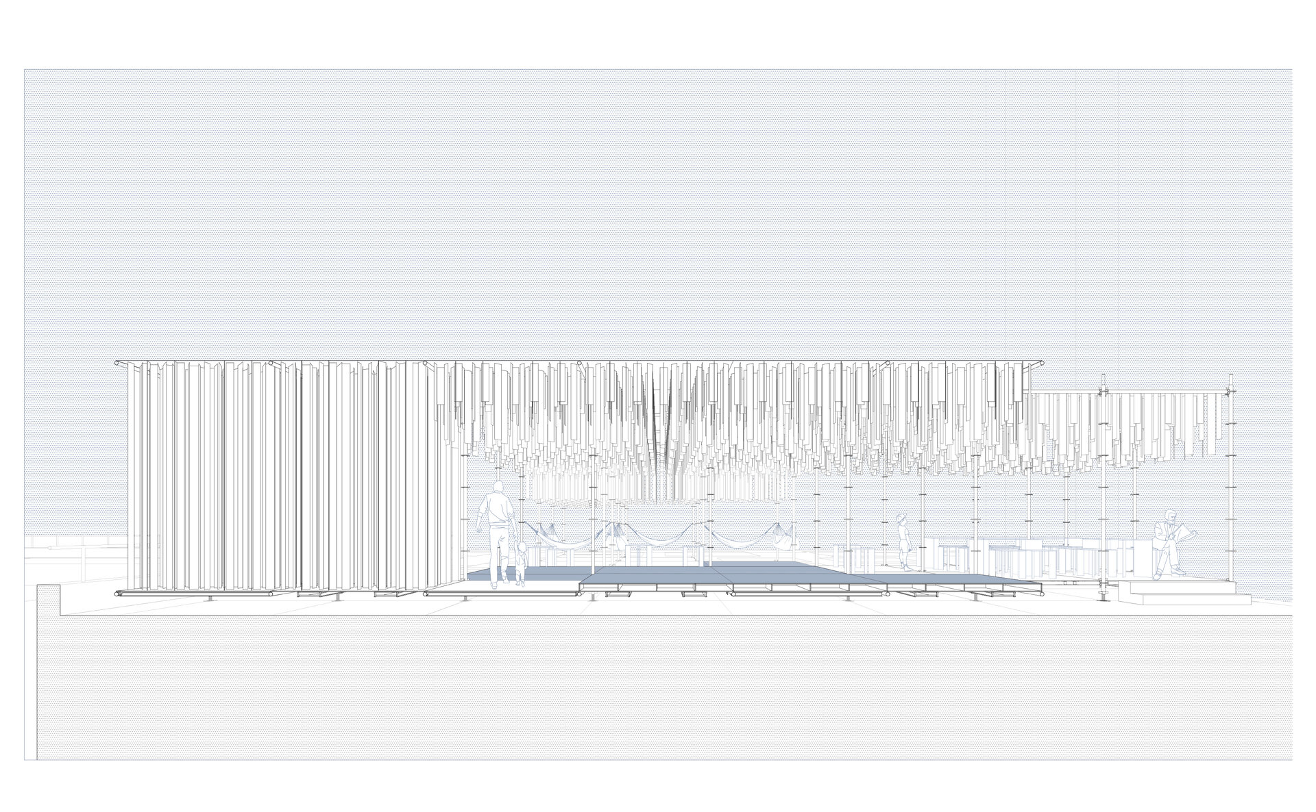 Structura sa din schelă multidirecțională permite un montaj și demontaj rapid, oferind mobilitate și adaptabilitate. Acoperirea este realizată cu ajutorul unei plase metalice albe, care filtrează lumina și creează un joc subtil de umbre. De asemenea, deasupra sunt suspendate fâșii translucide din material reciclabil și rezistent (membrană microporoasă), care, prin mișcarea lor în vânt și variațiile de înălțime, conturează spații fluide.