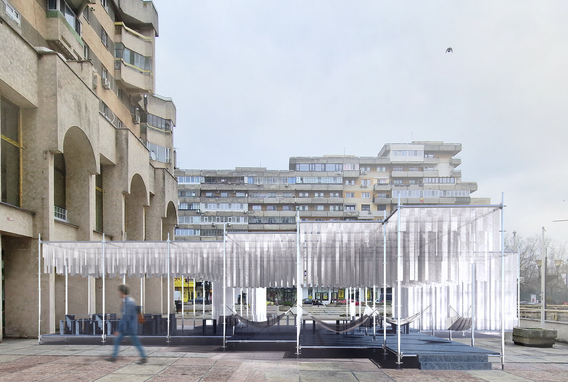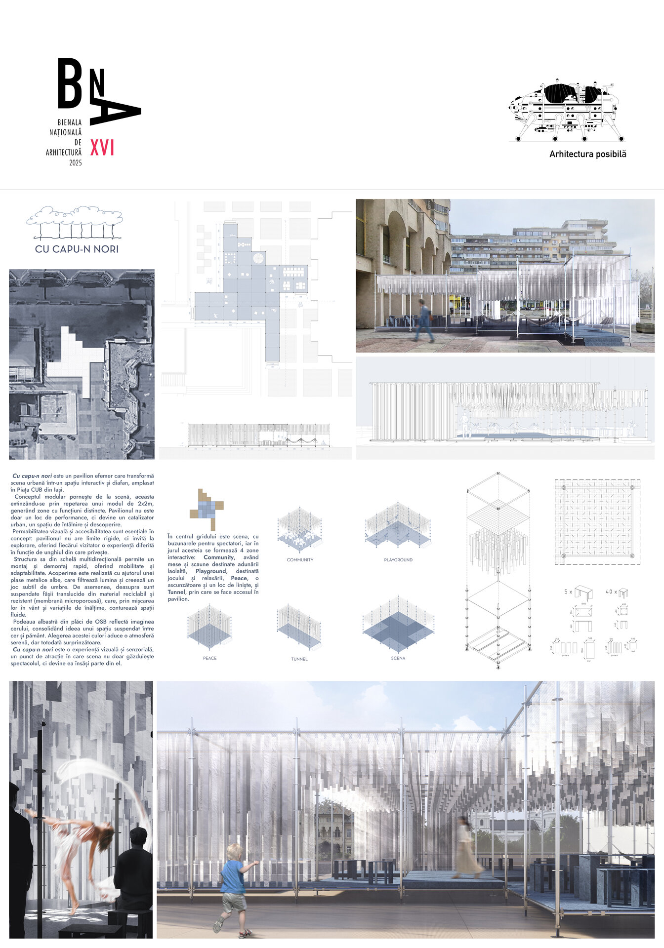 "Cu capu-n nori" este un pavilion efemer care transformă scena urbană într-un spațiu interactiv și diafan, amplasat în Piața CUB din Iași.