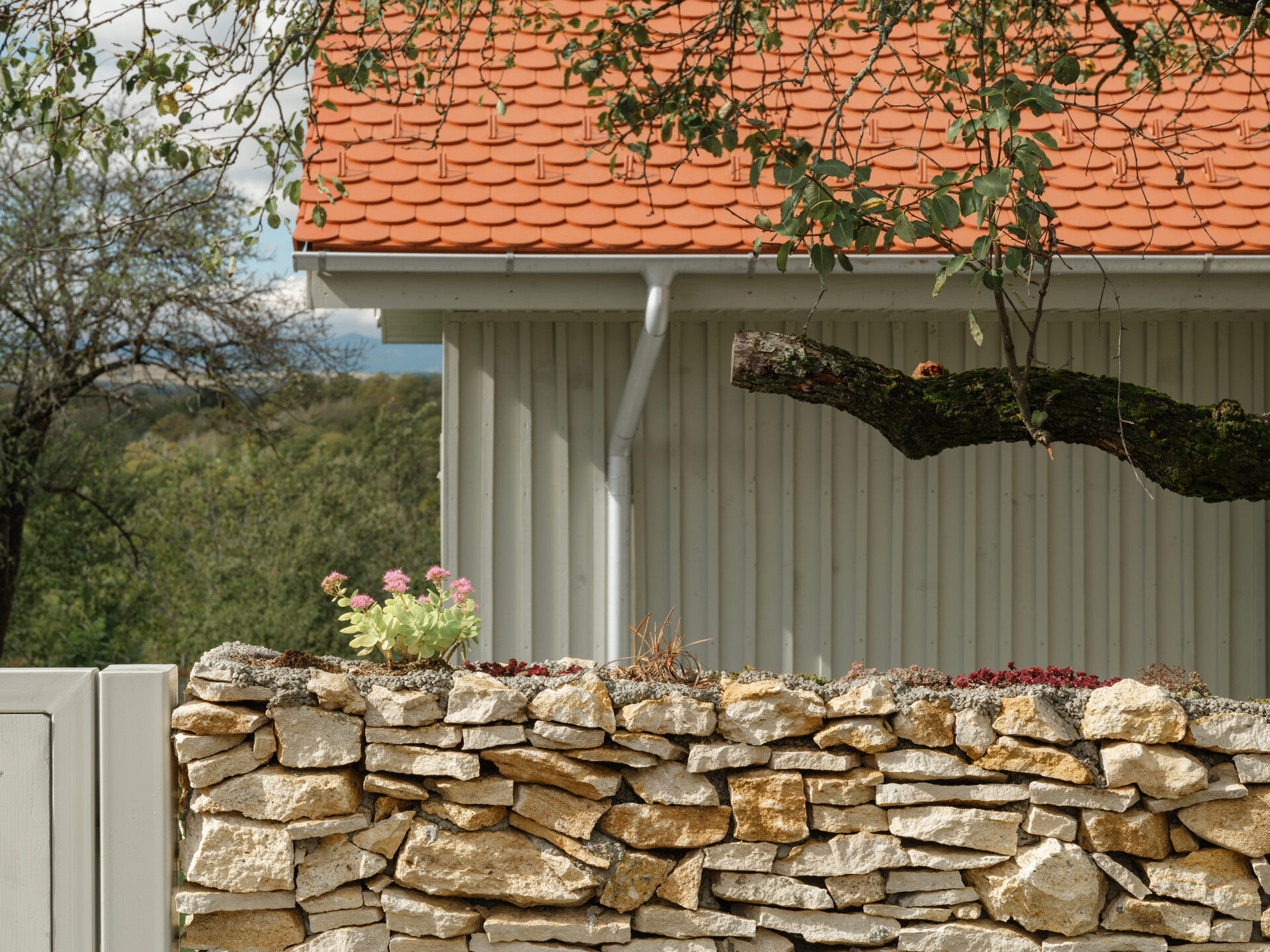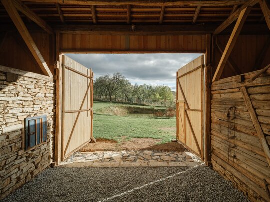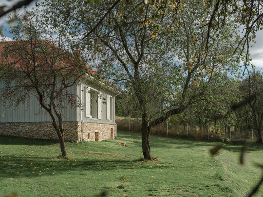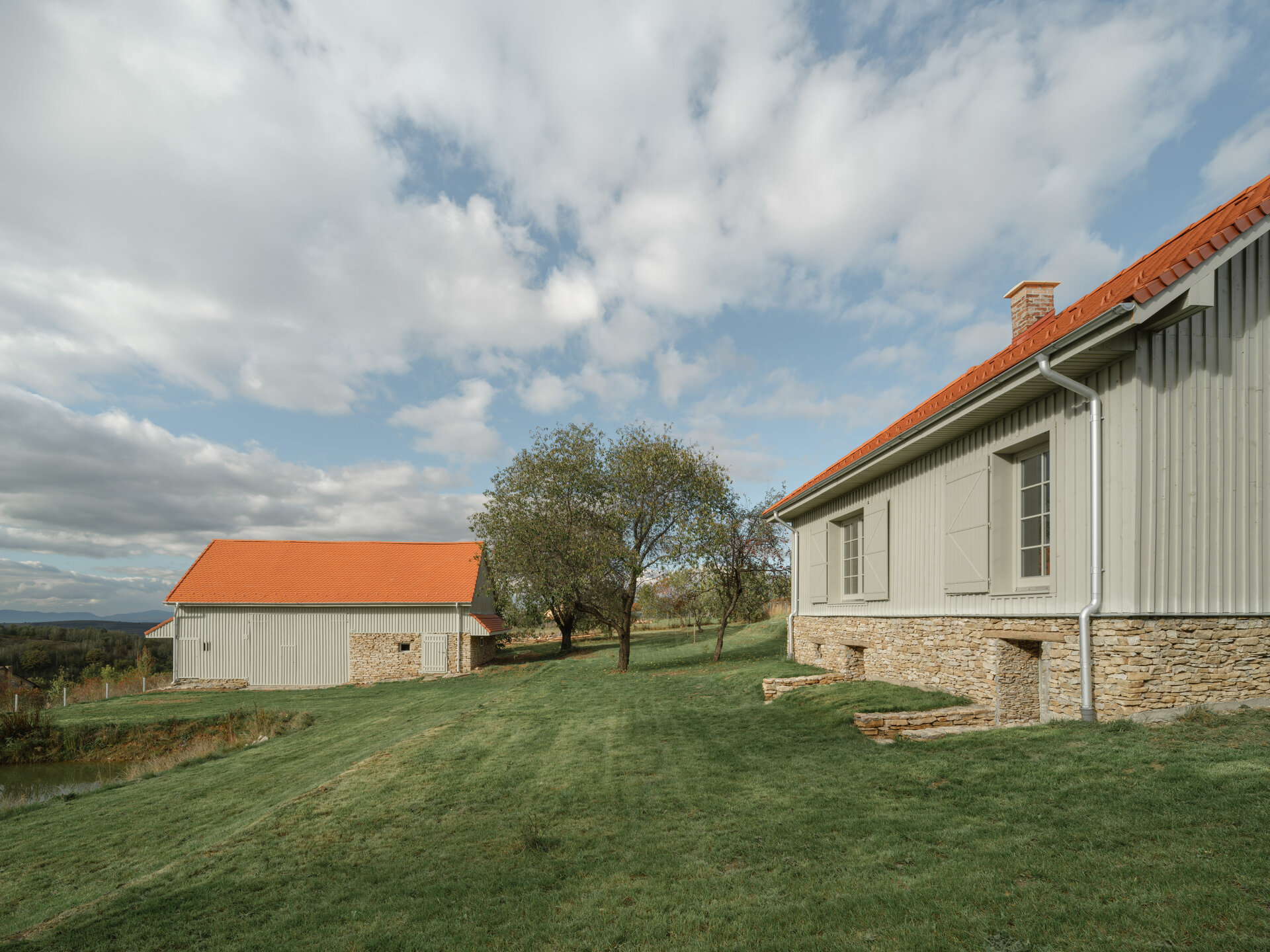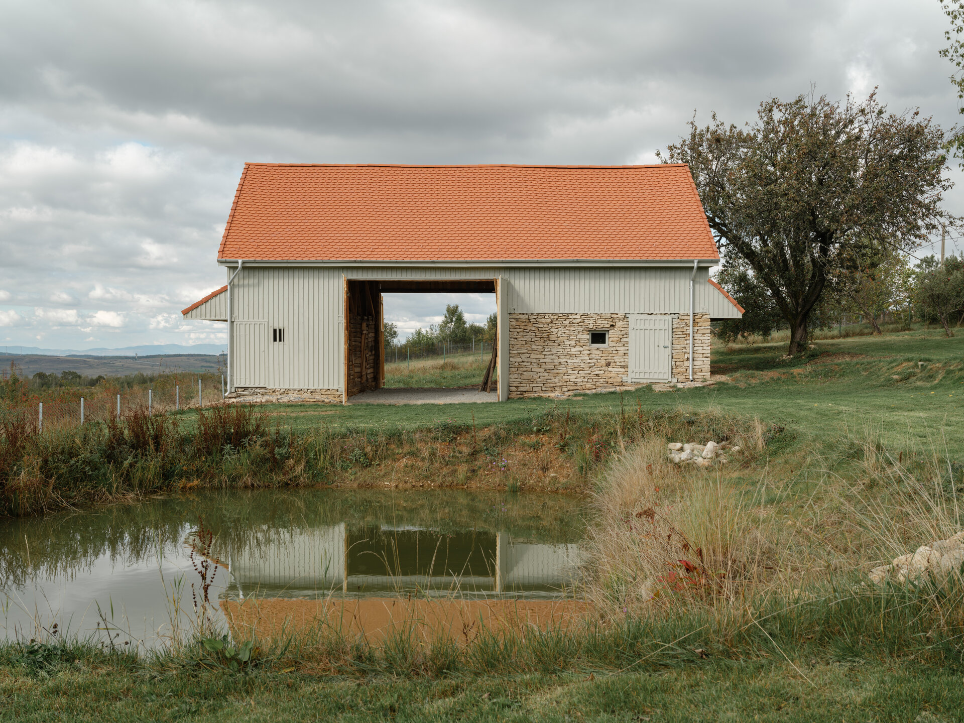 Amenajarea terenului a inclus și o componentă ecologică importantă: apele pluviale au fost dirijate gravitațional către o zonă joasă a parcelei, unde a fost creat un mic iaz, populat cu pești și vegetație acvatică specifică. Această intervenție discretă regenerează o zonă umedă preexistentă și contribuie la microclimatul general al locului. La finalul procesului de restaurare, locuința și șura își păstrează în continuare discreția și firescul integrării în peisajul rural. Intervenția nu încearcă să rescrie o narațiune modernizatoare, ci să ofere o nouă viață unei tipologii tradiționale. Casa va fi locuită permanent de noii beneficiari, în timp ce hambarul, păstrându-și caracterul utilitar, va fi folosit pentru depozitarea uneltelor de grădinărit – o funcțiune firească, în continuitate cu istoria locului.