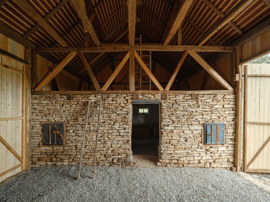 Materialitatea inițială a fost completată cu intervenții minimale, dar riguroase: soclurile și porțiunile deteriorate ale zidăriei au fost reparate și completate cu piatră de calcar provenită dintr-o carieră locală, asigurând astfel o coerență geologică și estetică între construcție și sit.