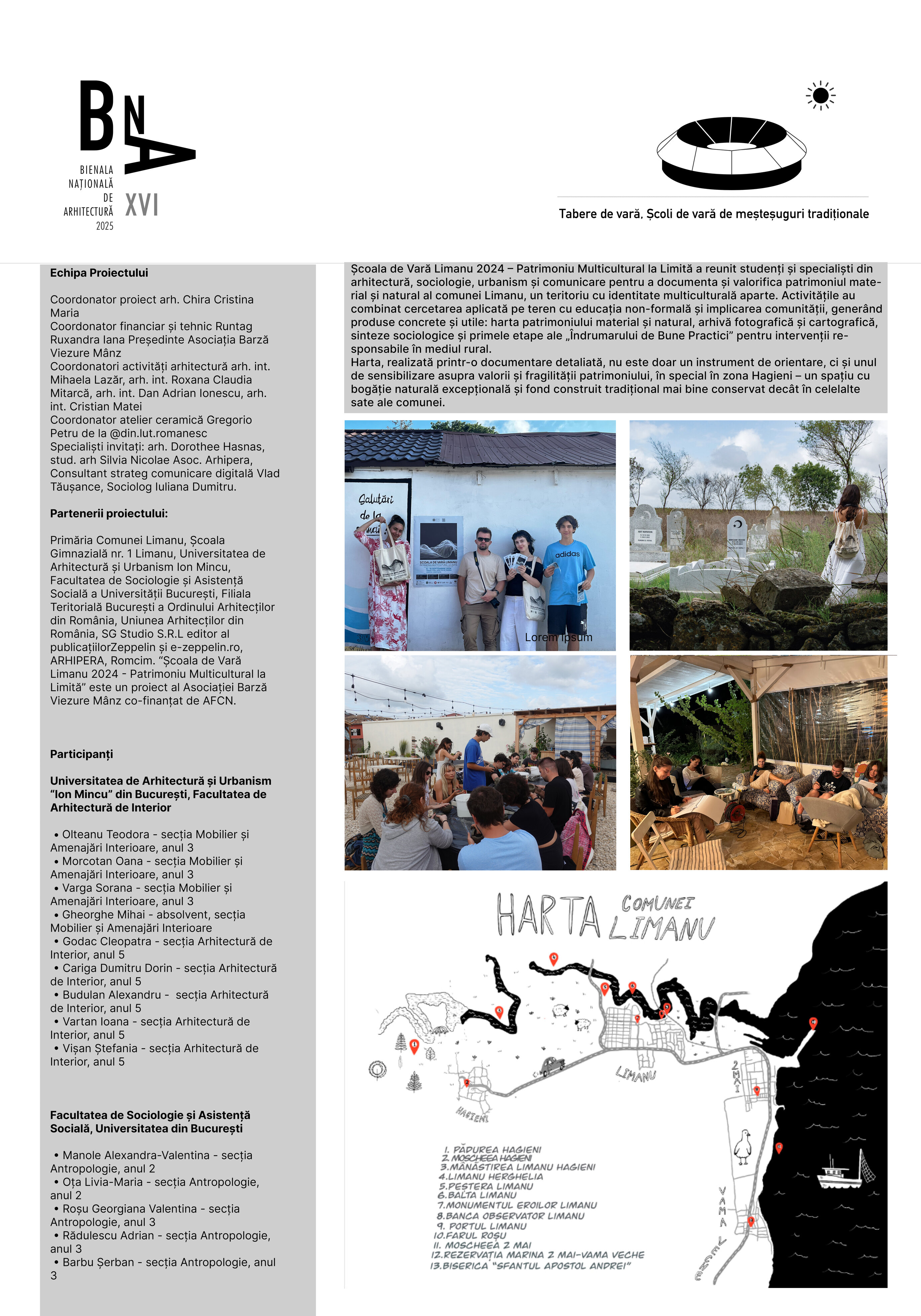 Organizată de Asociația Barză Viezure Mânz și co-finanțată de AFCN, Școala de Vară Limanu 2024 a funcționat ca un laborator interdisciplinar, reunind studenți și specialiști în arhitectură, urbanism, sociologie și comunicare. Activitățile au vizat documentarea patrimoniului material și natural, consolidarea cunoștințelor despre specificul multicultural al zonei și inițierea unor resurse utile pentru intervenții responsabile.