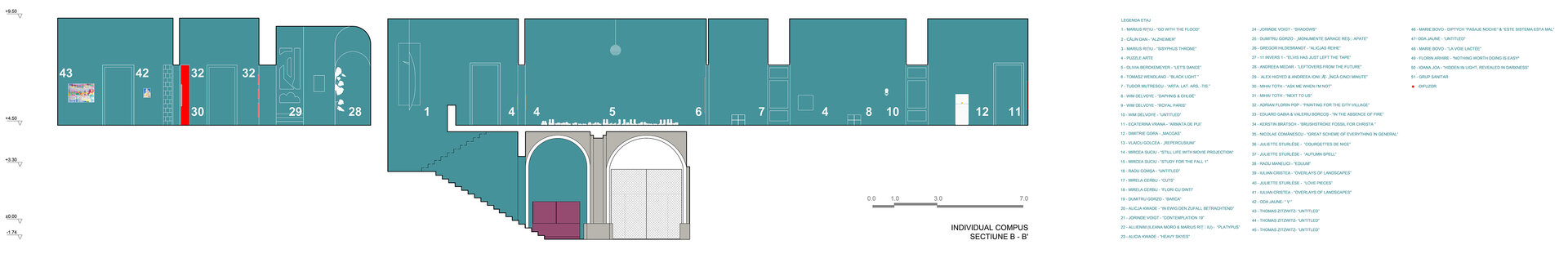 În total, au fost instalate aproximativ 200 de lucrări. Au fost identificate (împreună cu Justin Baroncea și Cristian Boltres) și păstrate elemente arhitecturale cu valoare istorică: pardoselile din mozaic de la parter, treptele din piatră ale scării care leagă parterul de primul etaj, precum și balustrada realizată din același material (închisă cu gips-carton și vopsită RAL 5018).