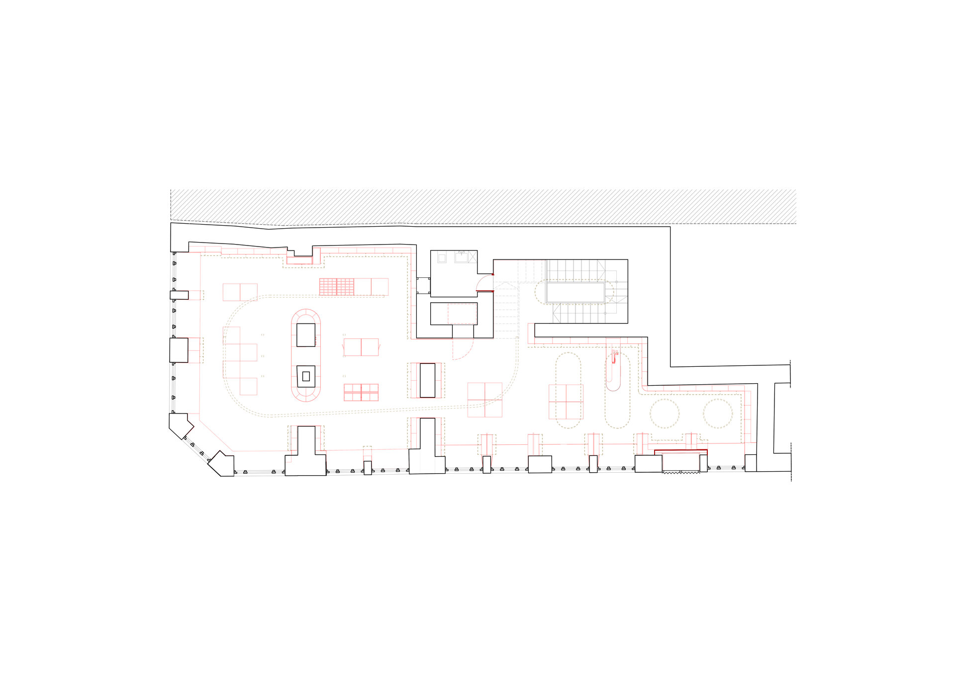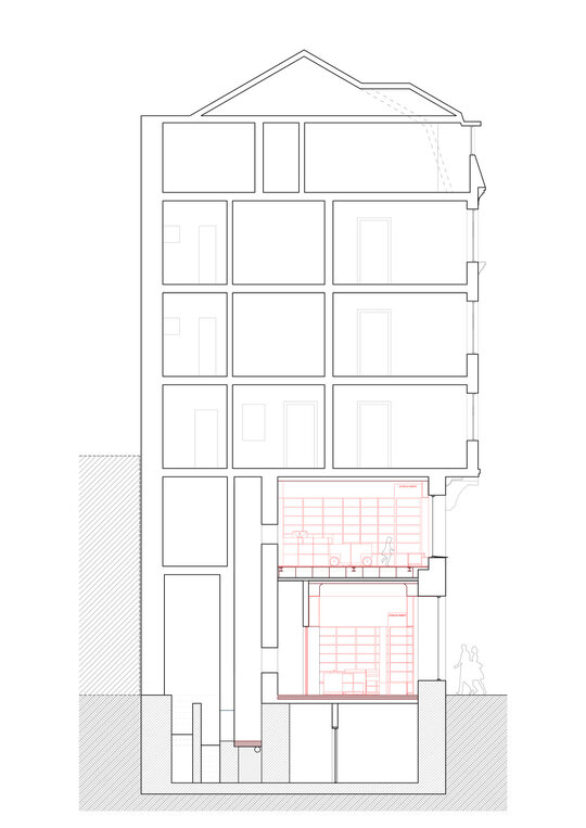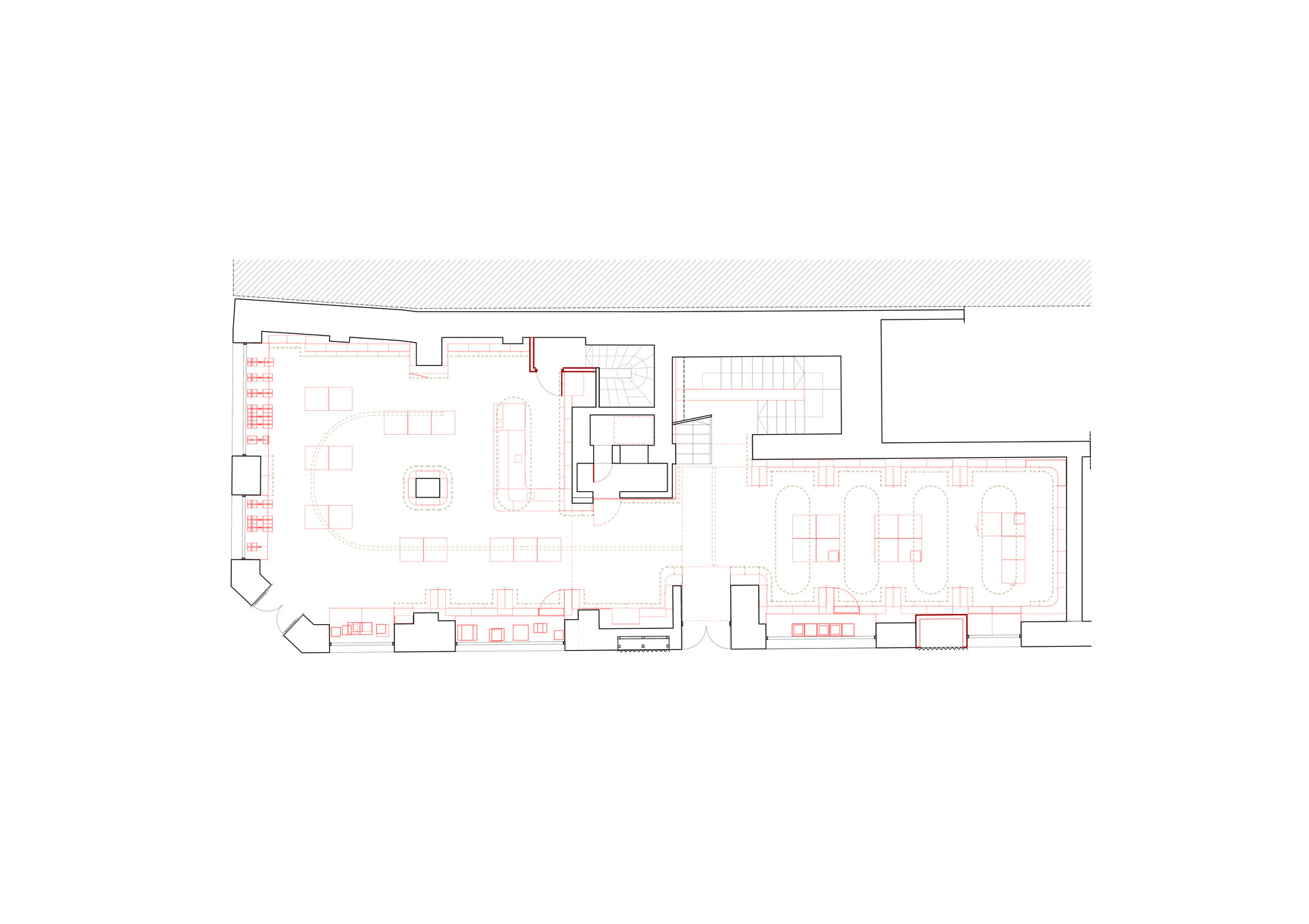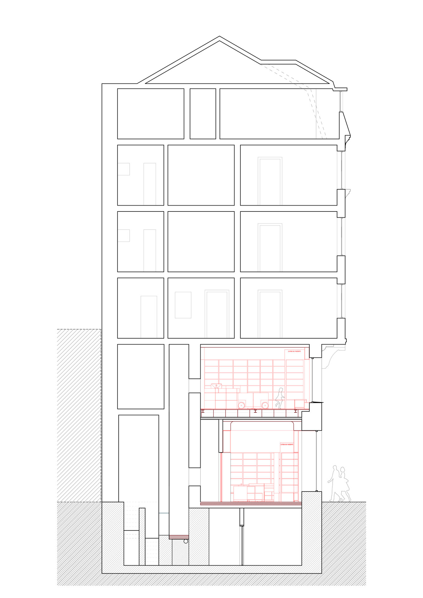 Intervenția arhitecturală a avut ca obiectiv principal integrarea armonioasă a noii funcțiuni în contextul valorilor patrimoniale ale imobilului. Demersul nu s-a limitat la adaptarea funcțională și estetică a spațiului pentru vânzarea și lectura cărților, ci a vizat o recuperare atentă a calităților intrinseci ale spațiului originar. Prin eliminarea straturilor adăugate în timp – materiale, compartimentări și finisaje necorespunzătoare – proiectul a readus la lumină logica arhitecturală inițială, completată de o consolidare structurală și de refacerea tâmplăriilor originale din lemn la etaj, în locul închiderilor din PVC instalate anterior.