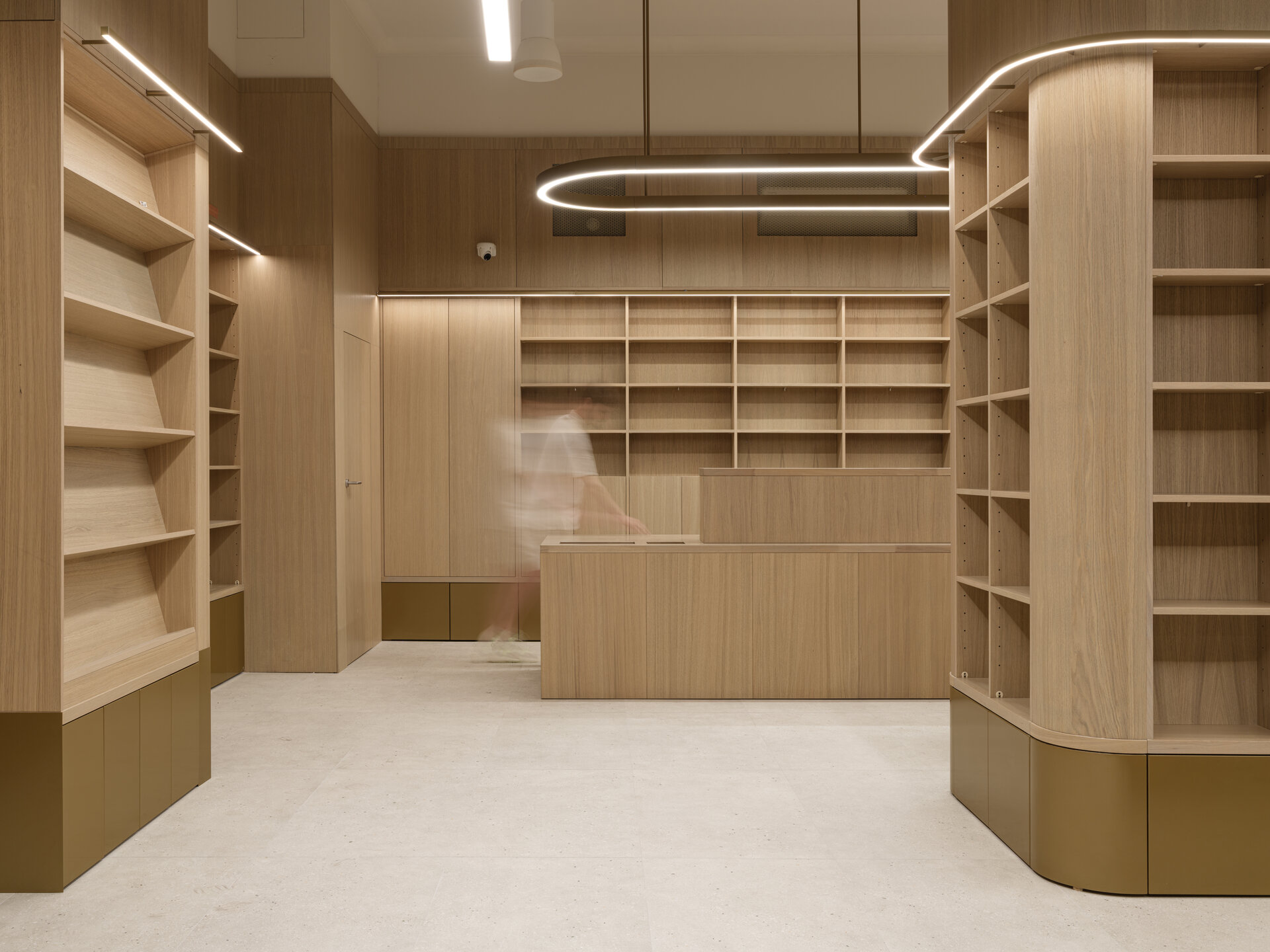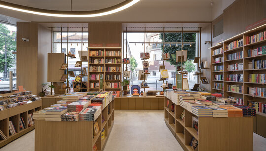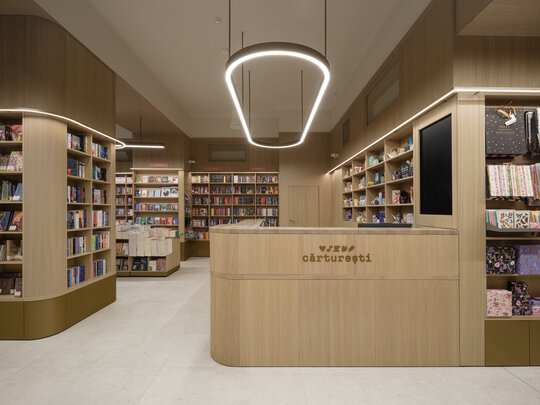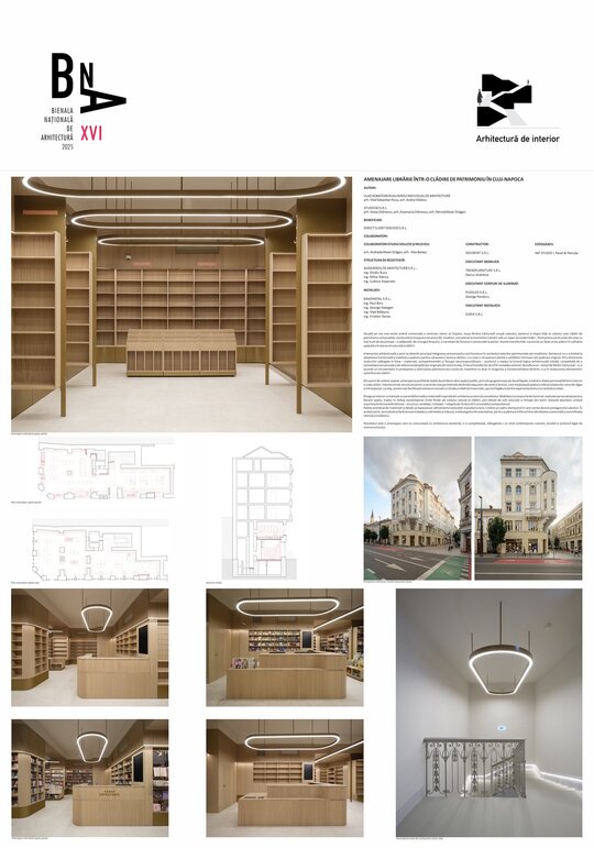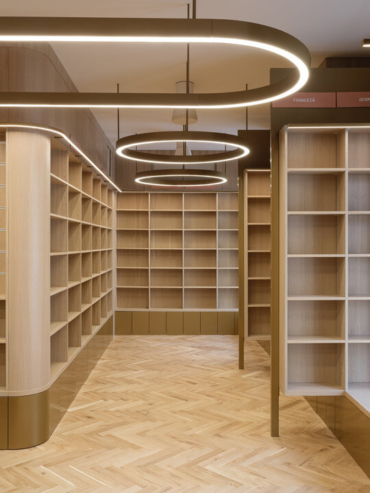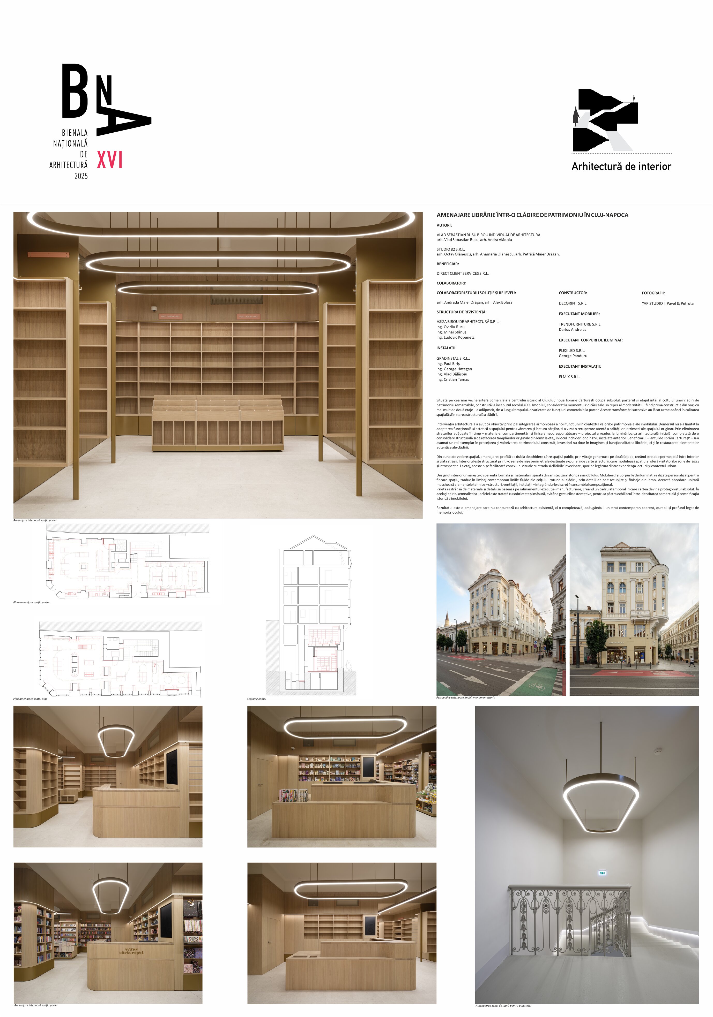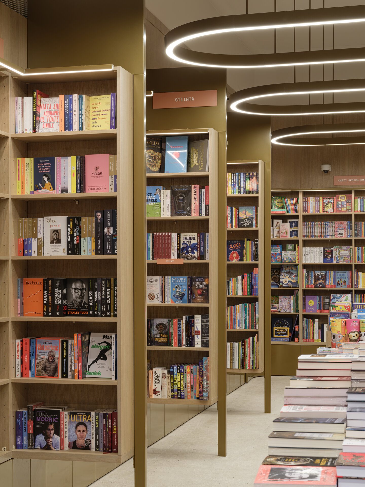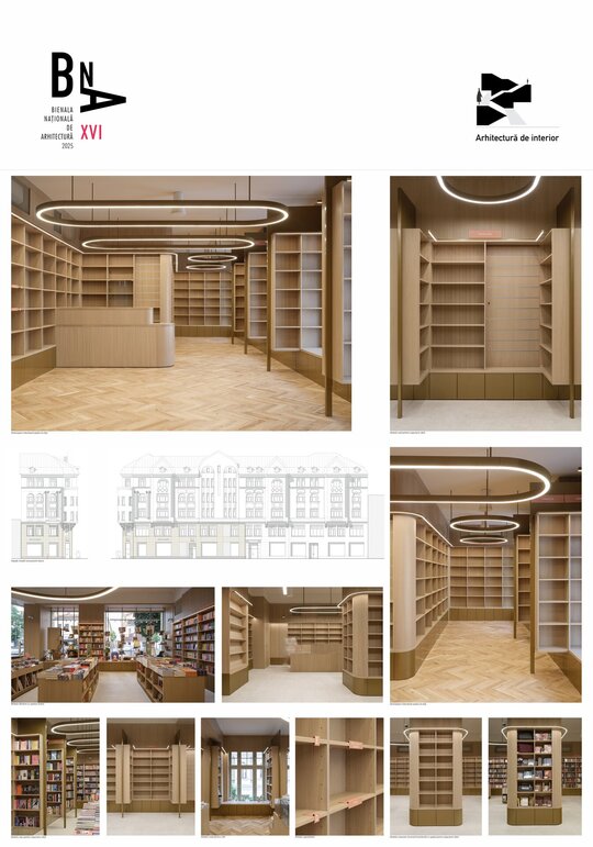 Paleta restrânsă de materiale și detalii se bazează pe rafinamentul execuției manufacturiere, creând un cadru atemporal în care cartea devine protagonistul absolut. În același spirit, semnalistica librăriei este tratată cu sobrietate și măsură, evitând gesturile ostentative, pentru a păstra echilibrul între identitatea comercială și semnificația istorică a imobilului.