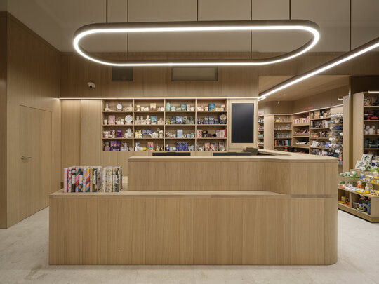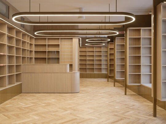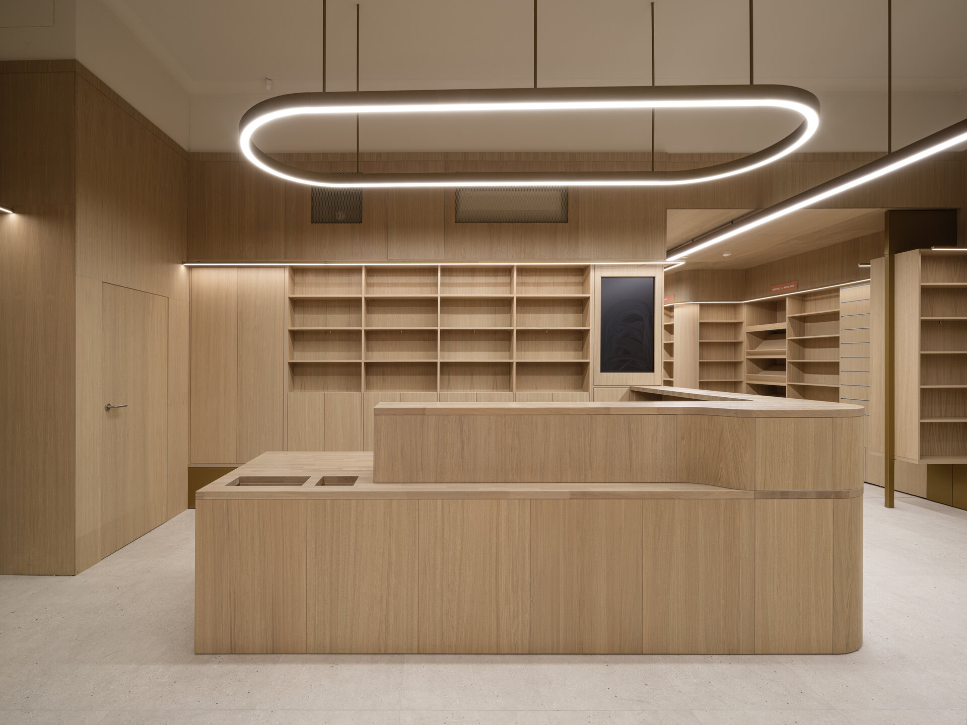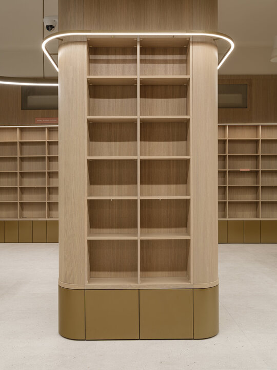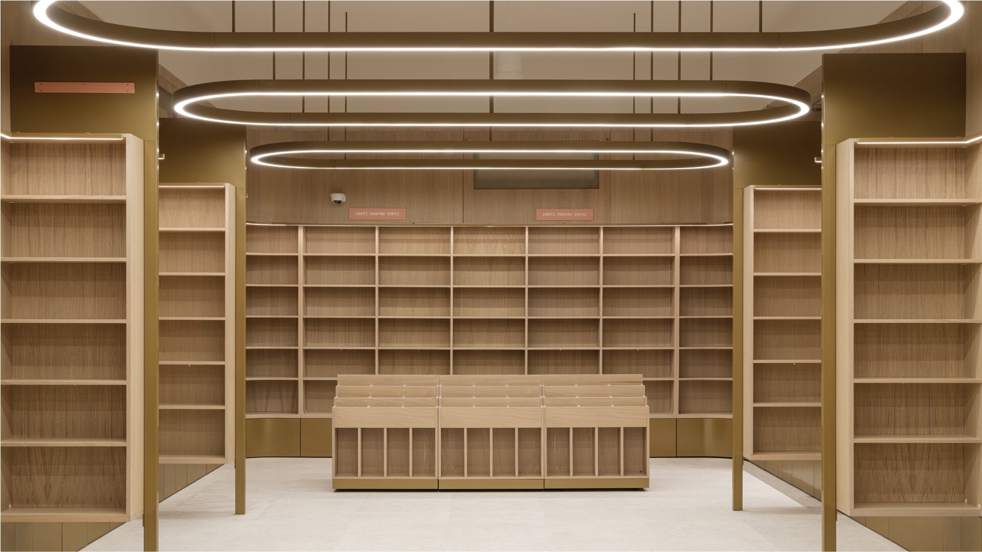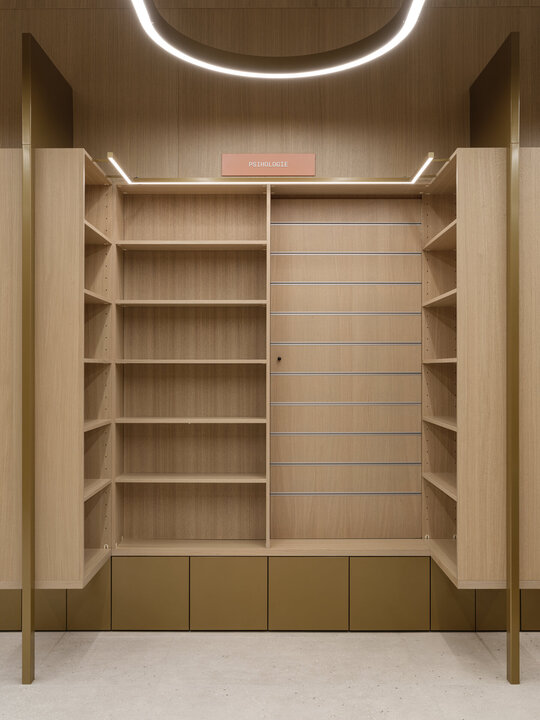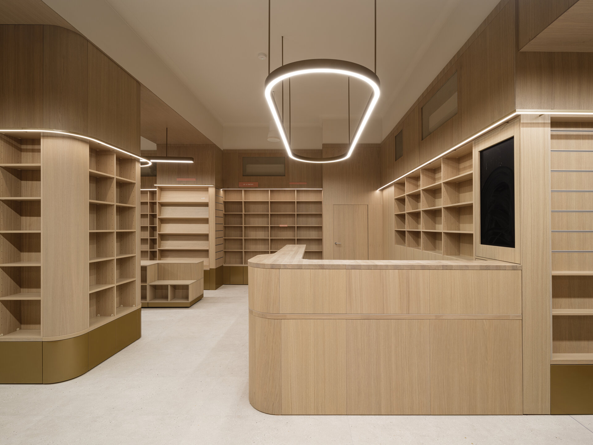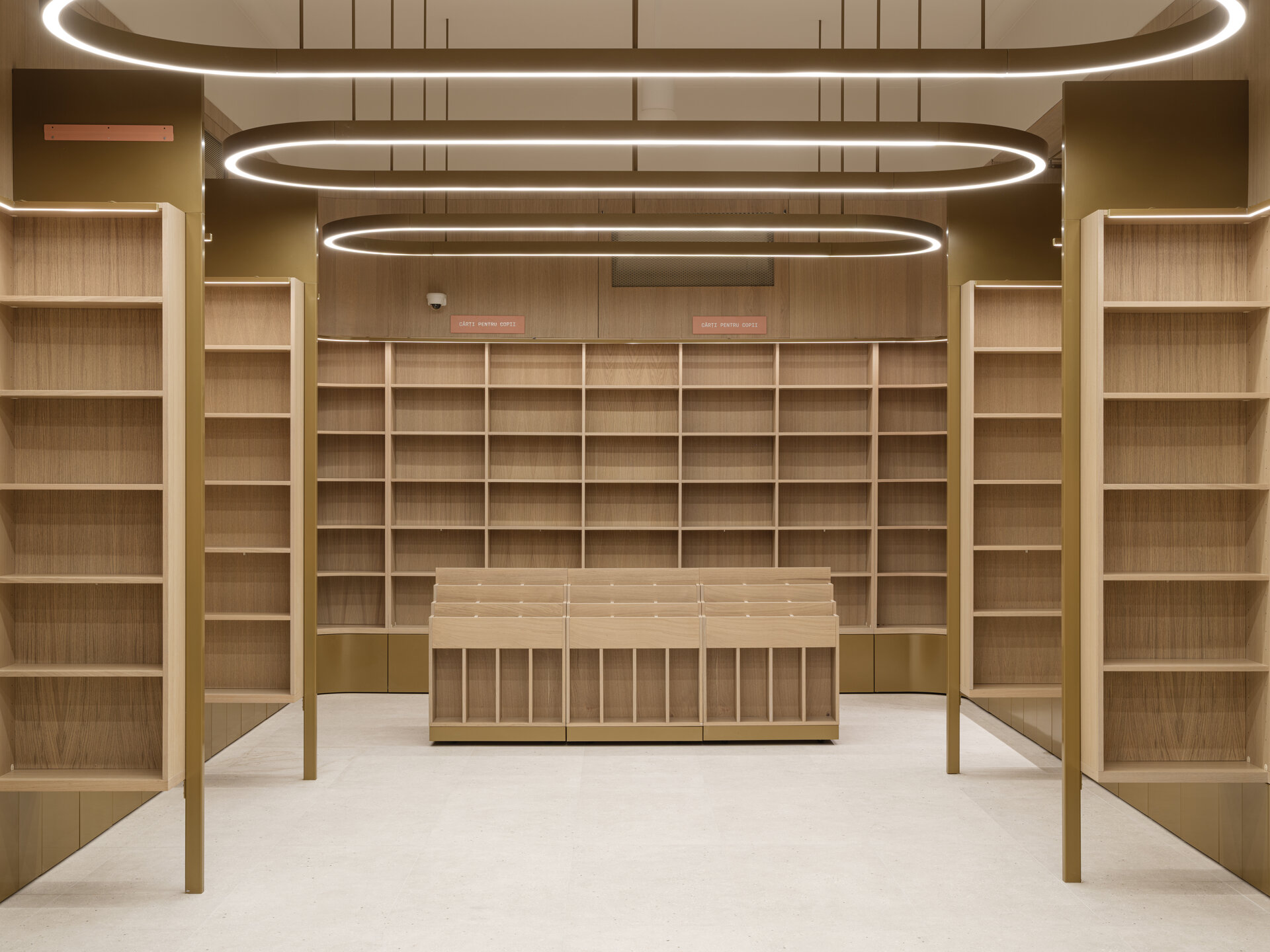 Paleta restrânsă de materiale și detalii se bazează pe rafinamentul execuției manufacturiere, creând un cadru atemporal în care cartea devine protagonistul absolut. În același spirit, semnalistica librăriei este tratată cu sobrietate și măsură, evitând gesturile ostentative, pentru a păstra echilibrul între identitatea comercială și semnificația istorică a imobilului.