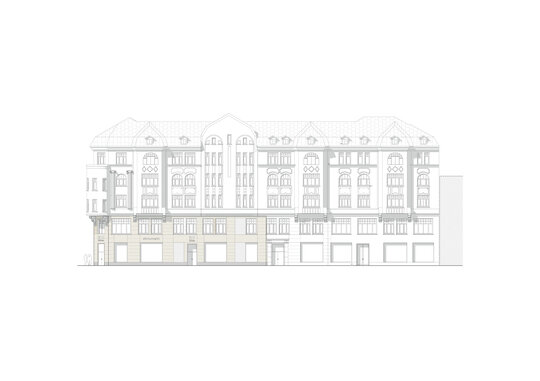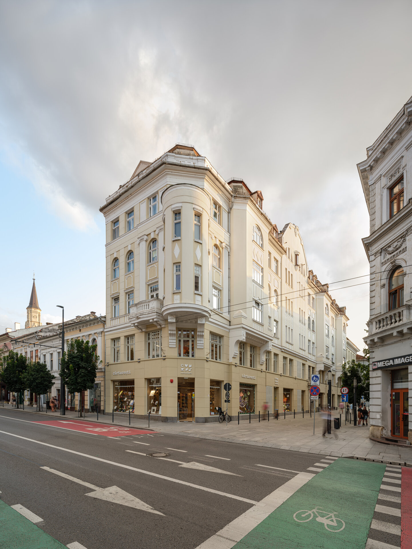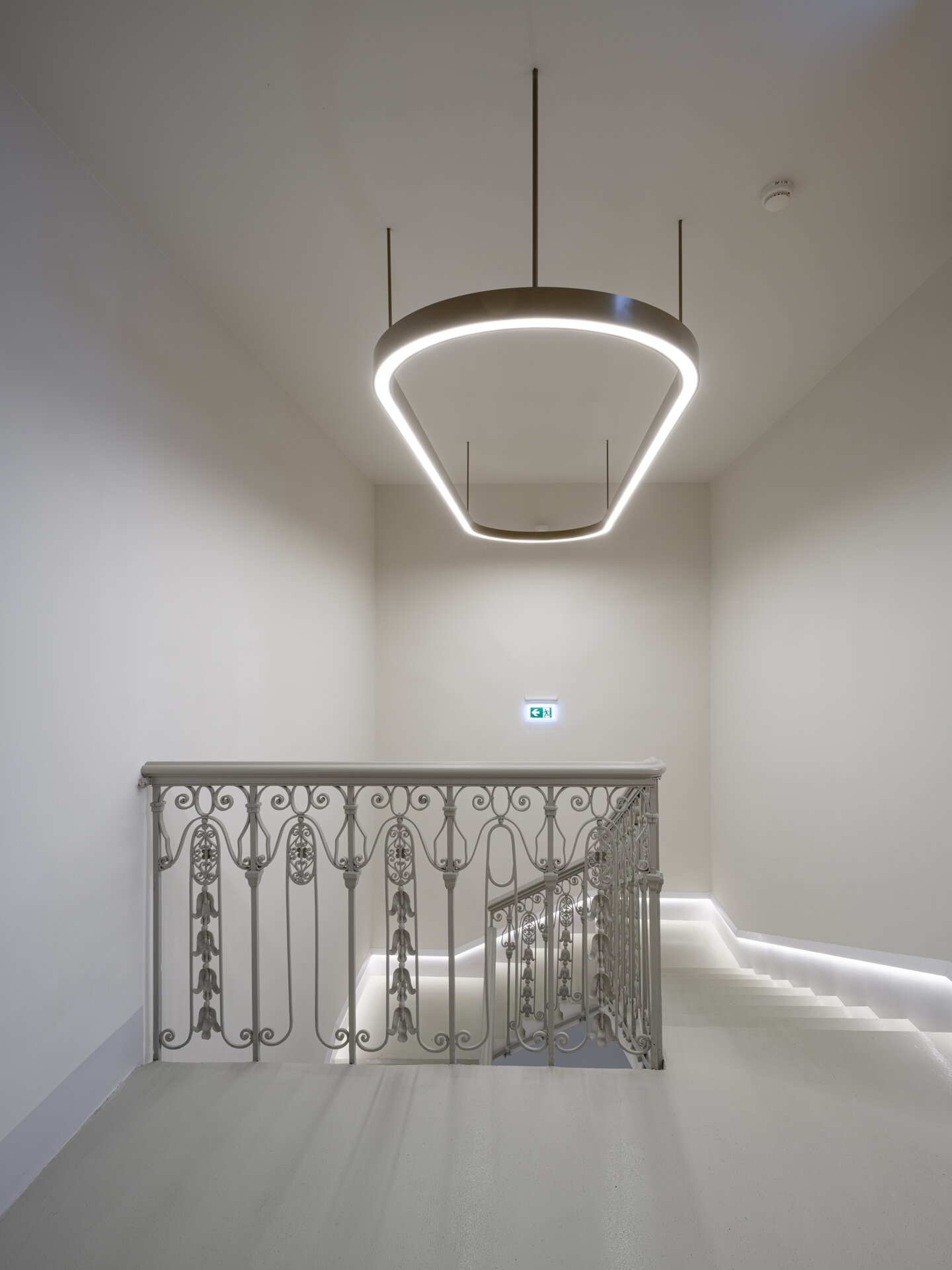 Designul interior urmărește o coerență formală și materială inspirată din arhitectura istorică a imobilului. Mobilierul și corpurile de iluminat, realizate personalizat pentru fiecare spațiu, traduc în limbaj contemporan liniile fluide ale colțului rotund al clădirii, prin detalii de colț rotunjite și finisaje din lemn. Această abordare unitară maschează elementele tehnice – structuri, ventilații, instalații – integrându-le discret în ansamblul compozițional.
