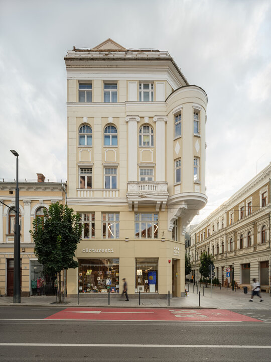 Situată pe cea mai veche arteră comercială a centrului istoric al Clujului, noua librărie Cărturești ocupă subsolul, parterul și etajul întâi al colțului unei clădiri de patrimoniu remarcabile, construită la începutul secolului XX. Imobilul, considerat la momentul ridicării sale un reper al modernității – fiind prima construcție din oraș cu mai mult de două etaje – a adăpostit, de-a lungul timpului, o varietate de funcțiuni comerciale la parter. Aceste transformări succesive au lăsat urme adânci în calitatea spațială și în starea structurală a clădirii.