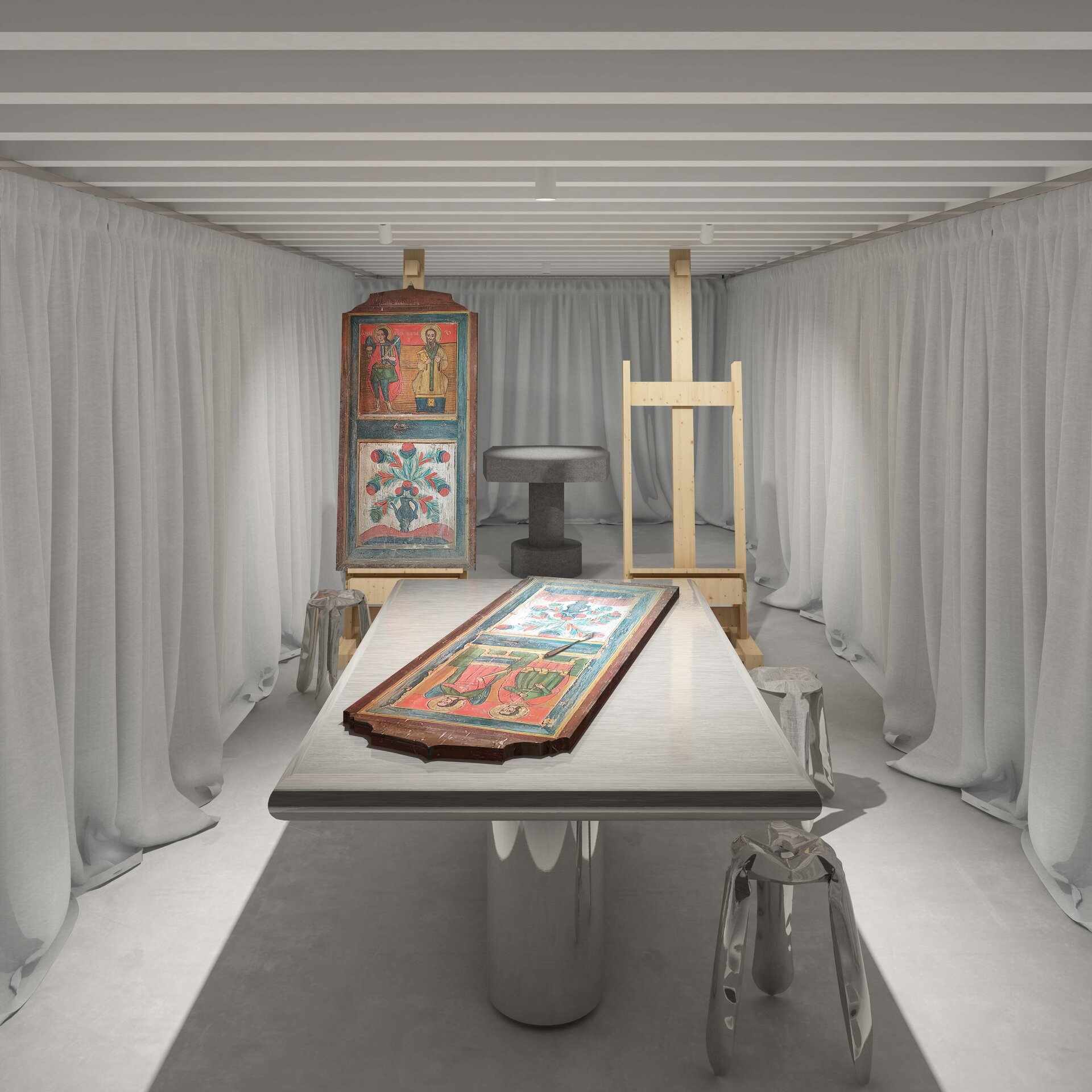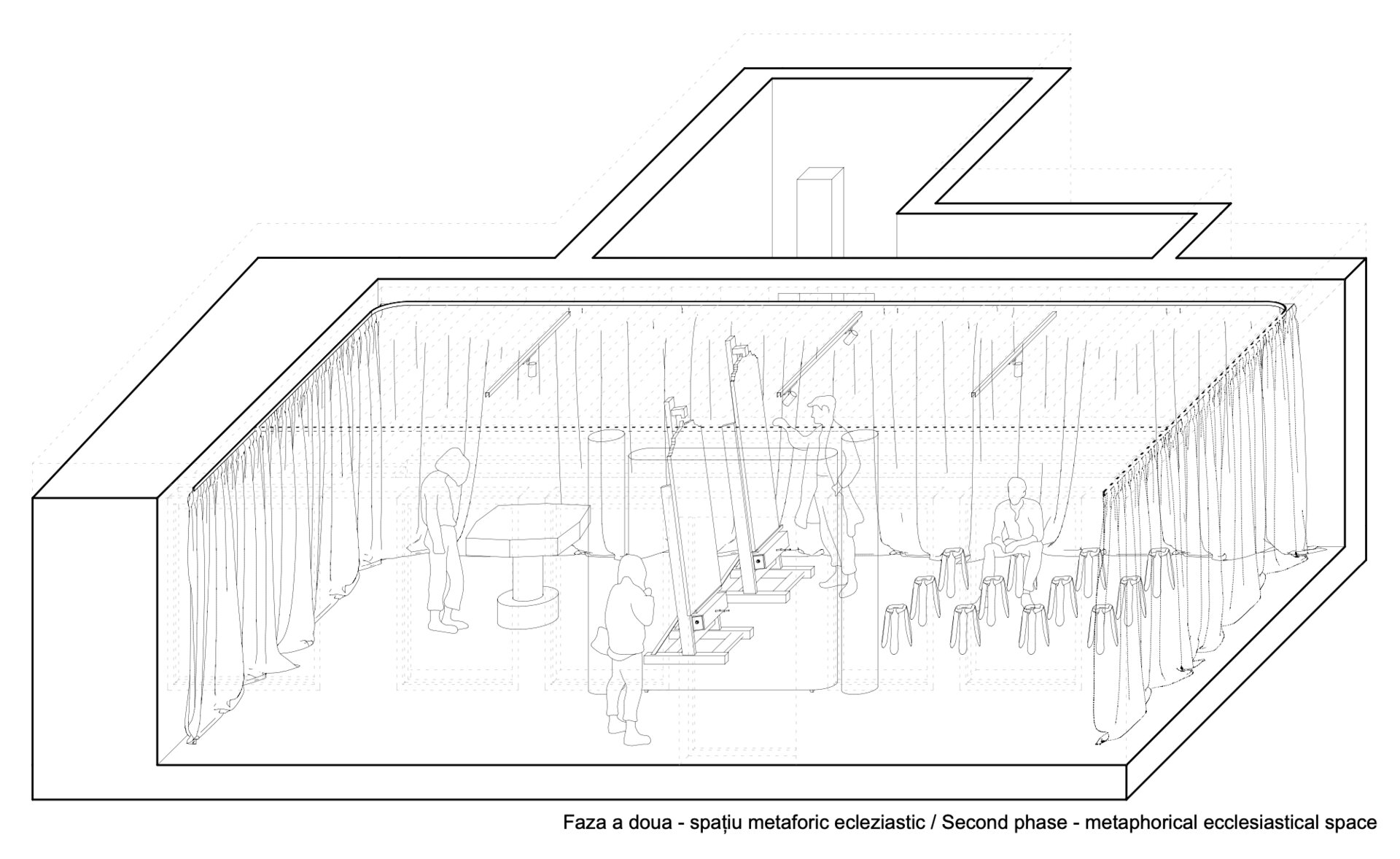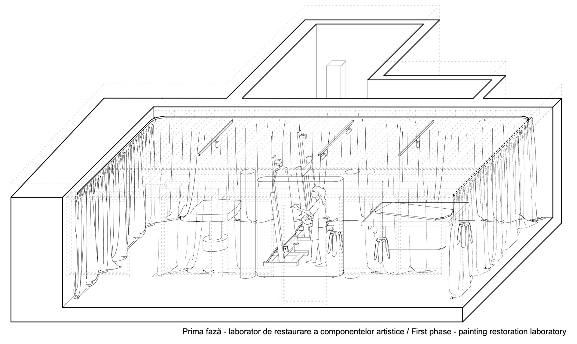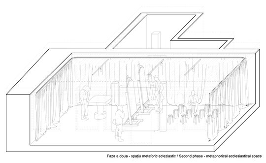 Pe parcursul primelor 3 luni, se va asista la înălțarea bisericii în Pavilionul României din Giardini della Bienale, biserica fiind amplasată în jumătatea nordică a pavilionului, iar spațiul sudic amenajat pentru activitățile de restaurare și ateliere. Galeria IRCCU va fi dedicată restaurării componentelor artistice, servind drept laborator și spațiu metaforic similar unui spațiu ecleziastic.