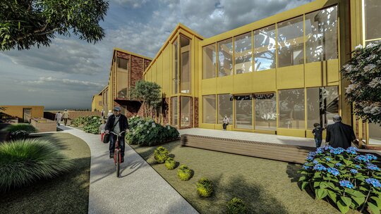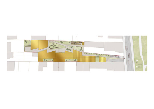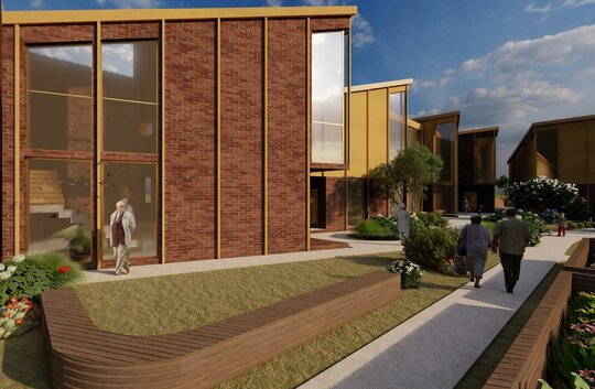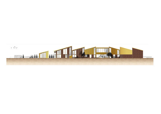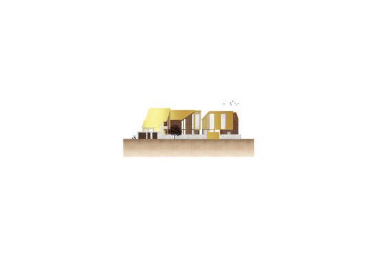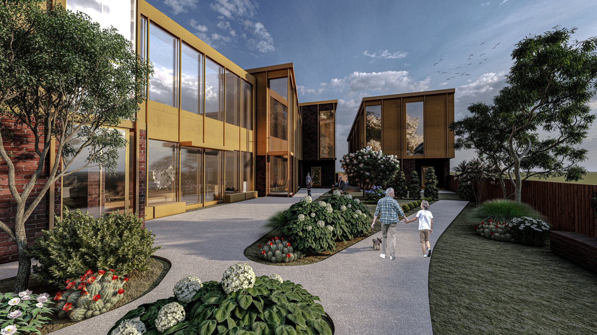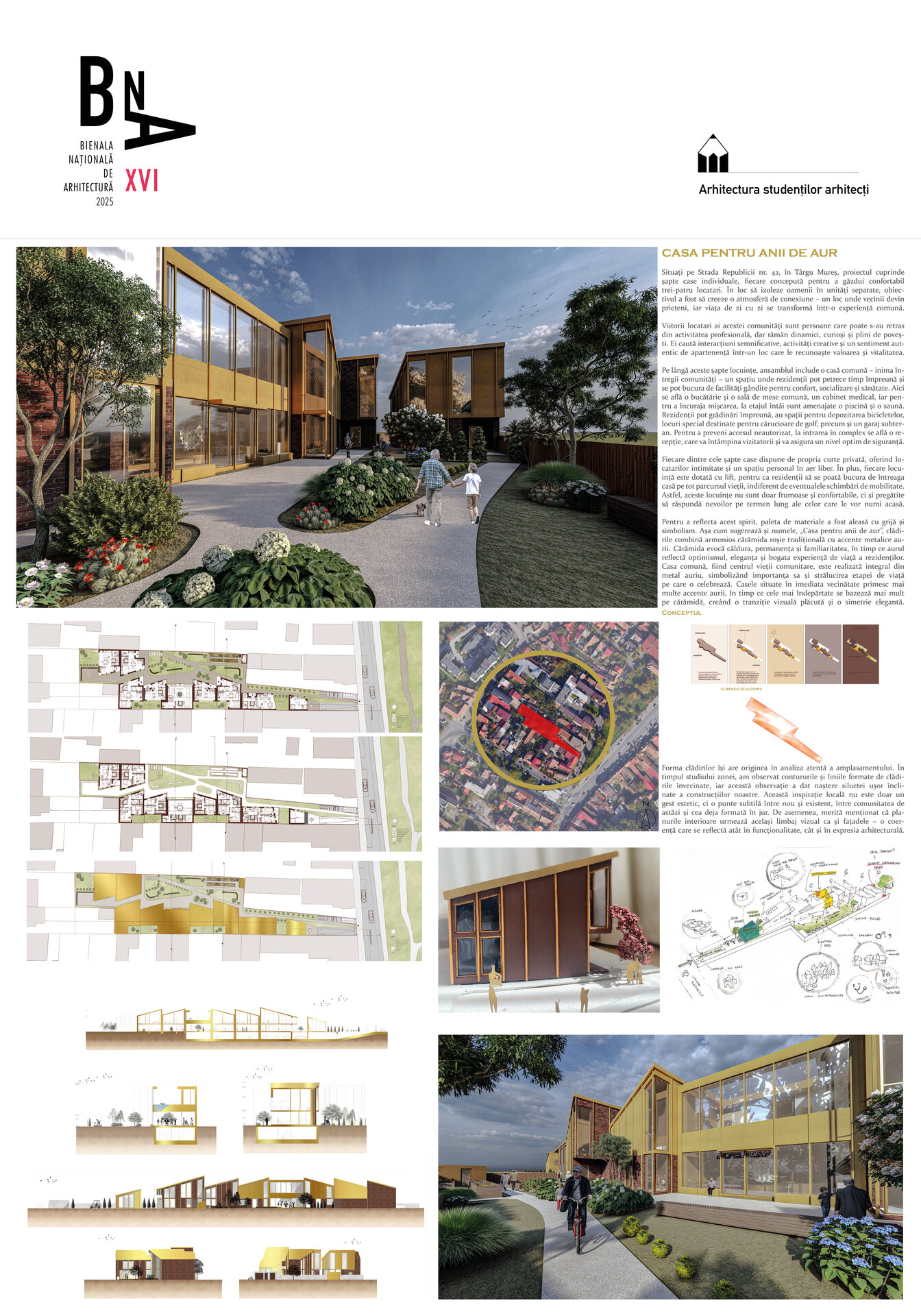 Pentru a reflecta acest spirit, paleta de materiale a fost aleasă cu grijă și simbolism. Așa cum sugerează și numele, „Casa pentru anii de aur”, clădirile combină armonios cărămida roșie tradițională cu accente metalice aurii. Cărămida evocă căldura, permanența și familiaritatea, în timp ce aurul reflectă optimismul, eleganța și bogata experiență de viață a rezidenților. Casa comună, fiind centrul vieții comunitare, este realizată integral din metal auriu, simbolizând importanța sa și strălucirea etapei de viață pe care o celebrează. Casele situate în imediata vecinătate primesc mai multe accente aurii, în timp ce cele mai îndepărtate se bazează mai mult pe cărămidă, creând o tranziție vizuală plăcută și o simetrie elegantă. Forma clădirilor își are originea în analiza atentă a amplasamentului.