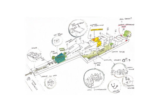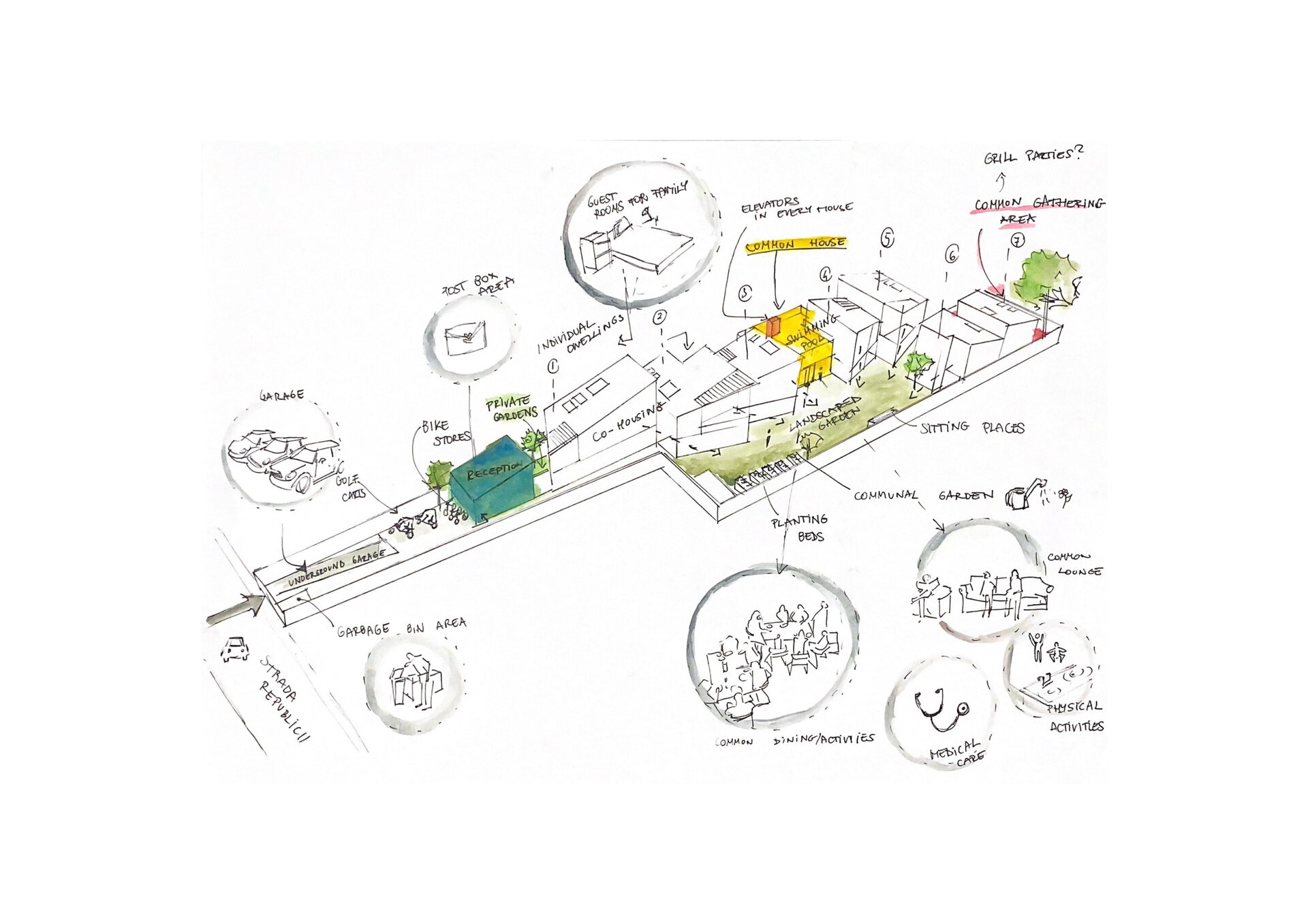 Pe lângă aceste șapte locuințe, ansamblul include o casă comună – inima întregii comunități – un spațiu unde rezidenții pot petrece timp împreună și se pot bucura de facilități gândite pentru confort, socializare și sănătate. Aici se află o bucătărie și o sală de mese comună, un cabinet medical, iar pentru a încuraja mișcarea, la etajul întâi sunt amenajate o piscină și o saună. Rezidenții pot grădinări împreună, au spații pentru depozitarea bicicletelor, locuri special destinate pentru cărucioare de golf, precum și un garaj subteran. Pentru a preveni accesul neautorizat, la intrarea în complex se află o recepție, care va întâmpina vizitatorii și va asigura un nivel optim de siguranță.