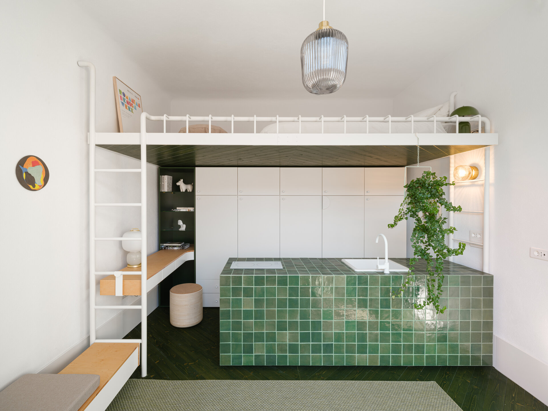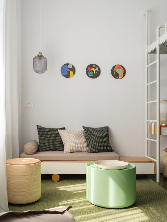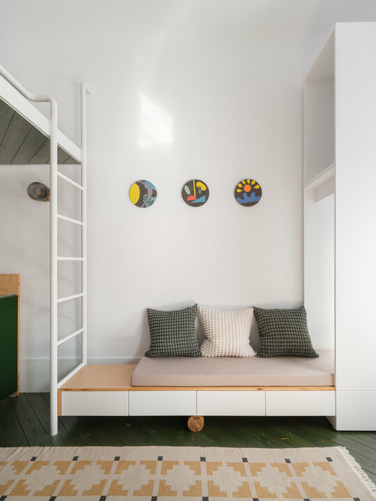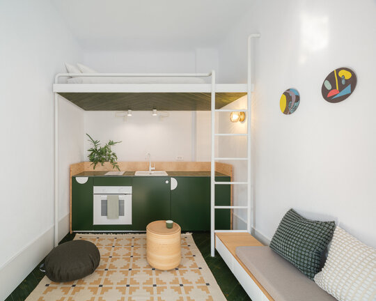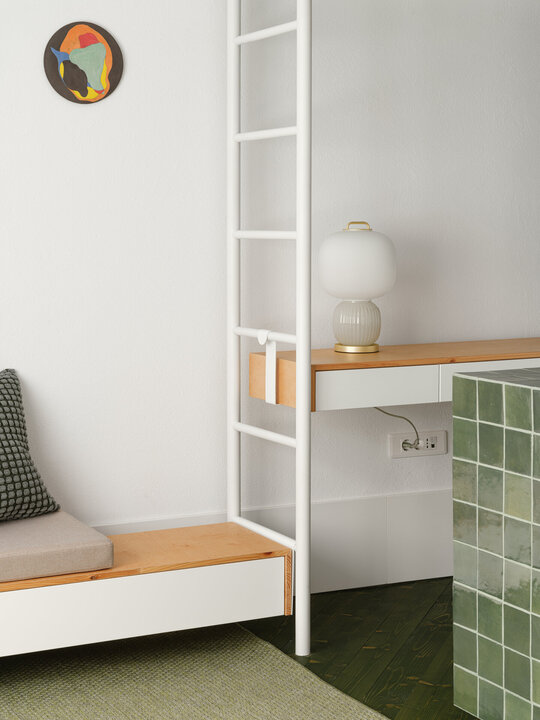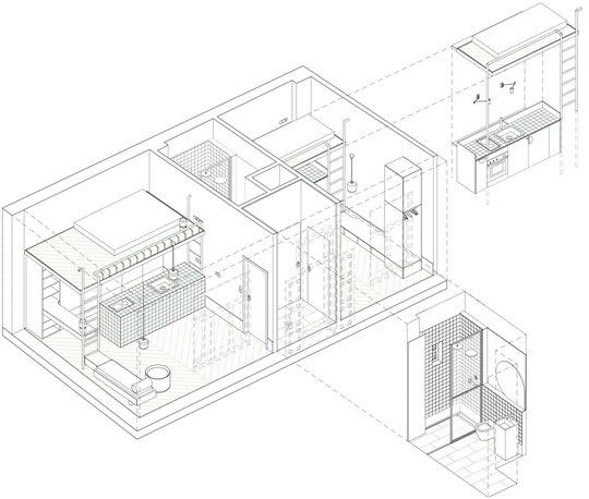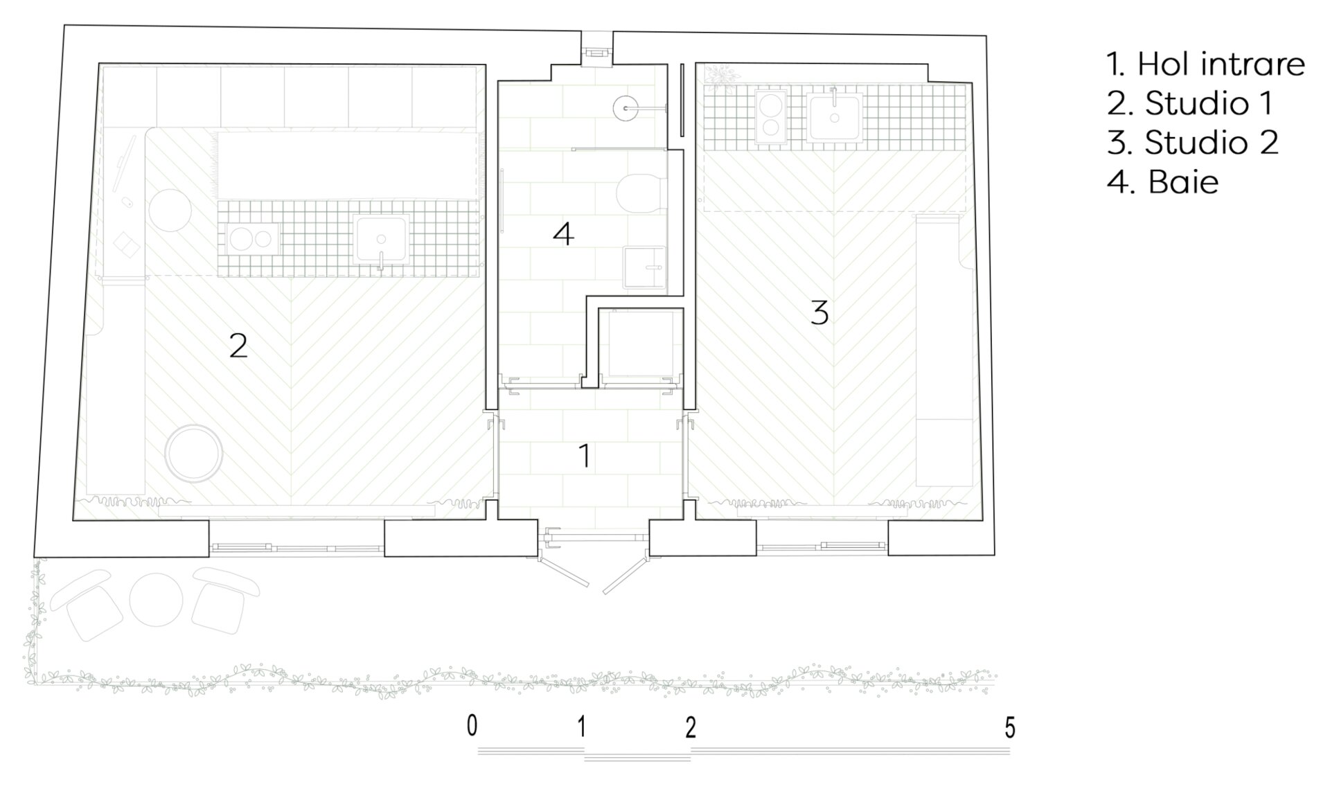 În încăperea mai generoasă se configurează un mobilier pe comandă de tip insulă îmbrăcat în plăci ceramice, înconjurat de o zonă de depozitare și una de studiu. Scara de acces la patul supraetajat conectează și susține biroul și laița care devine, astfel, prima treaptă a scării. În încăperea mai puțin generoasă mobilierul de bucătărie se așează la perete, fiind definit de o zonă de antistrop din panel cu furnir de mesteacăn și un blat din plăci ceramice. Scara de acces la patul supraetajat susține, cu ajutorul garderobei, laița. Un set de piese MaNoOtTa își asumă rolurile pentru care au fost concepute - masă de cafea/ceai și tabureți, putând deservi mai multe scenarii de ocupare a spațiului cu ajutor de la accesoriile lor - pernele și tăvile de plută.