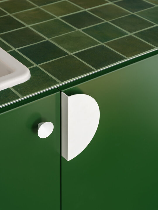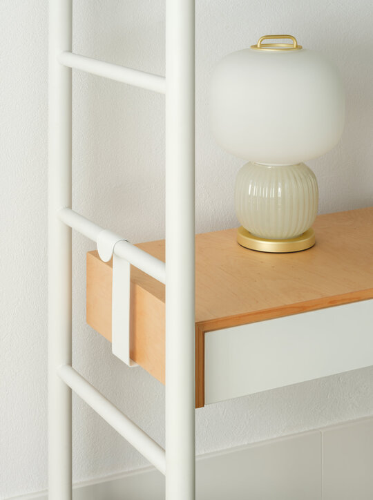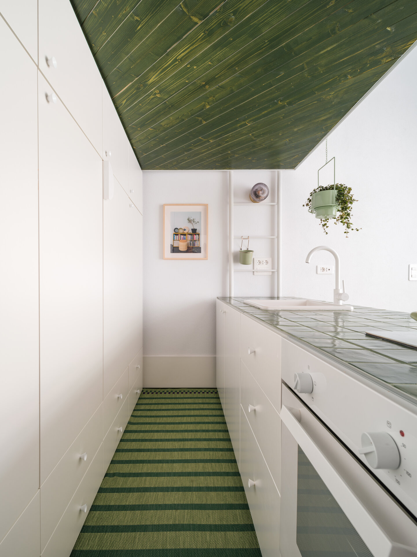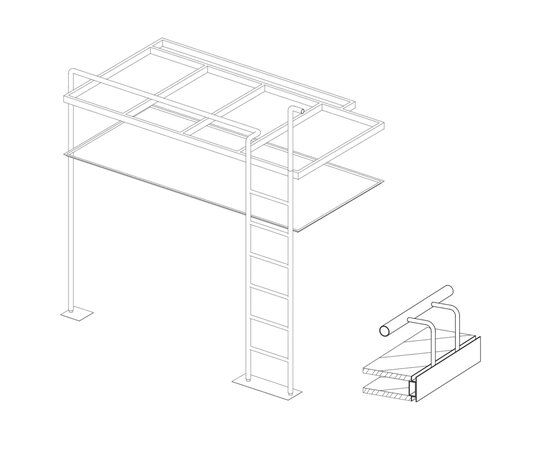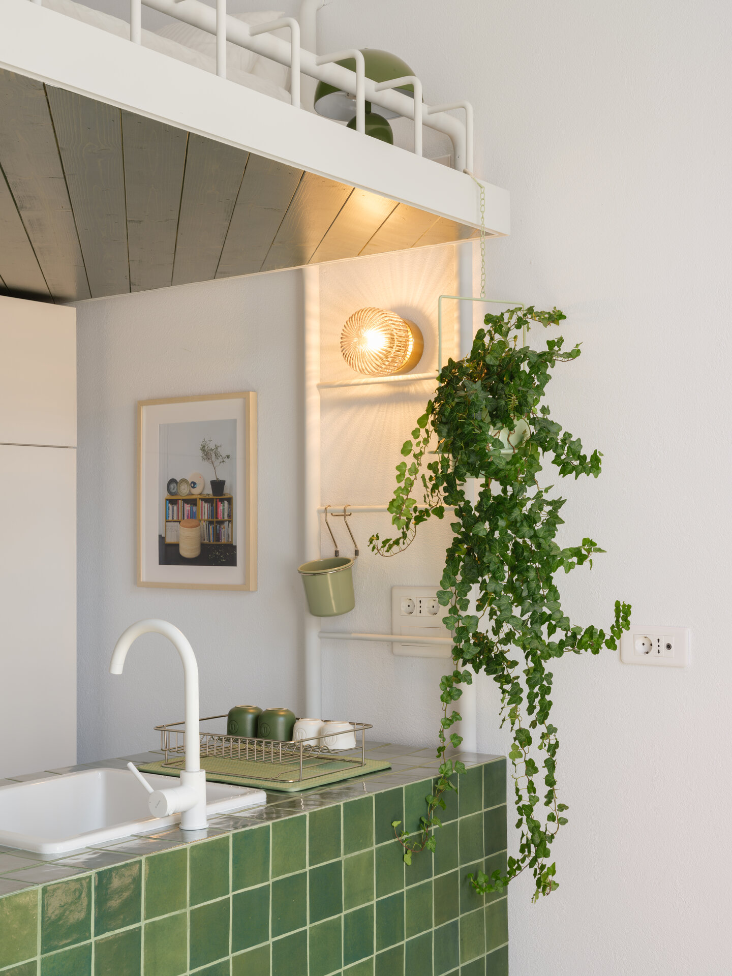 În încăperea mai generoasă se configurează un mobilier pe comandă de tip insulă îmbrăcat în plăci ceramice, înconjurat de o zonă de depozitare și una de studiu. Scara de acces la patul supraetajat conectează și susține biroul și laița care devine, astfel, prima treaptă a scării. În încăperea mai puțin generoasă mobilierul de bucătărie se așează la perete, fiind definit de o zonă de antistrop din panel cu furnir de mesteacăn și un blat din plăci ceramice. Scara de acces la patul supraetajat susține, cu ajutorul garderobei, laița. Un set de piese MaNoOtTa își asumă rolurile pentru care au fost concepute - masă de cafea/ceai și tabureți, putând deservi mai multe scenarii de ocupare a spațiului cu ajutor de la accesoriile lor - pernele și tăvile de plută.
