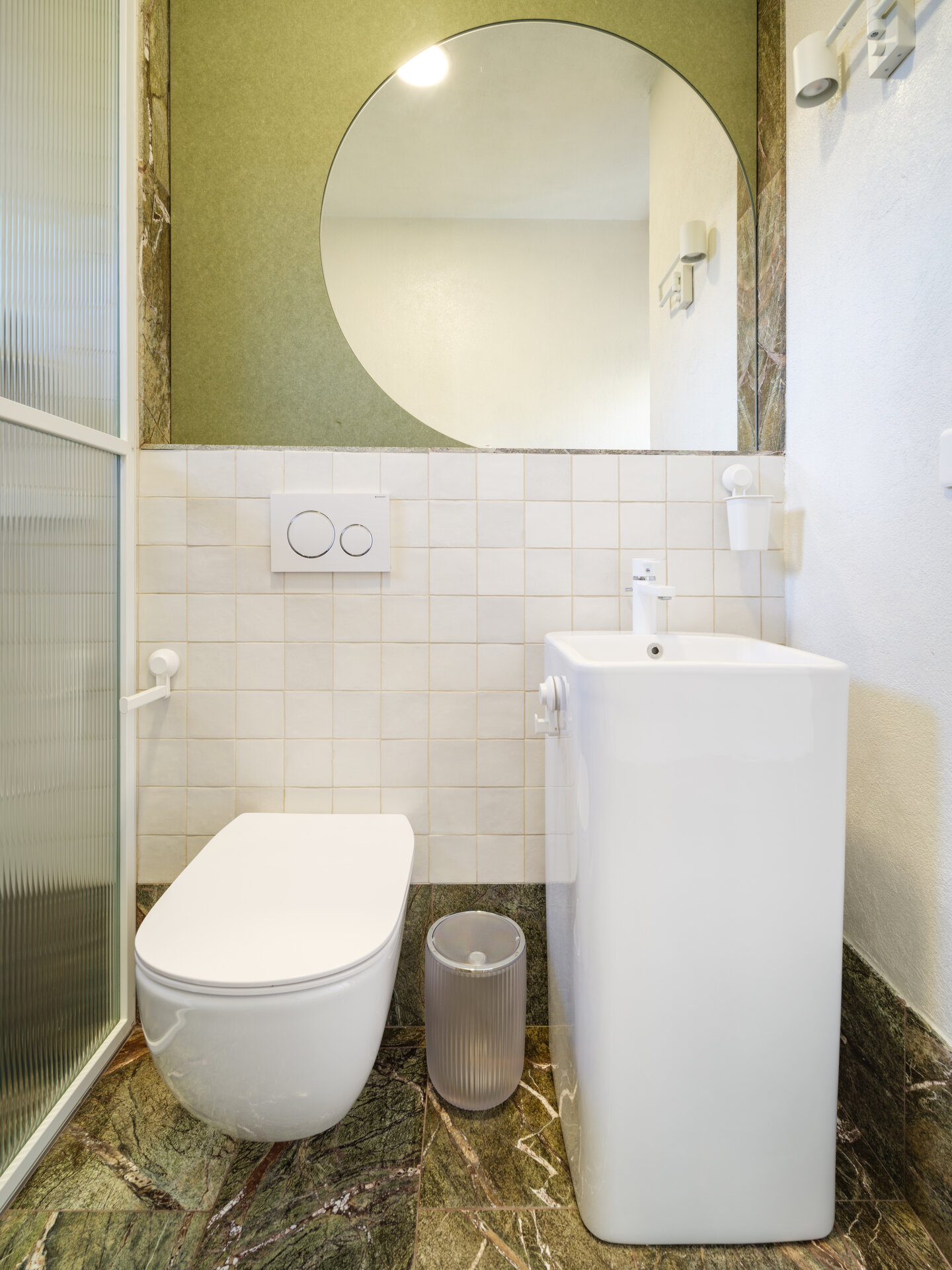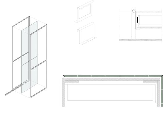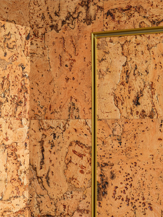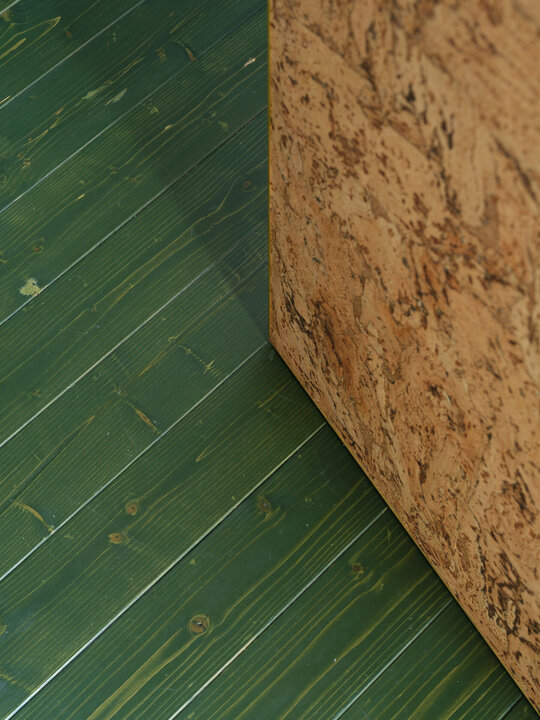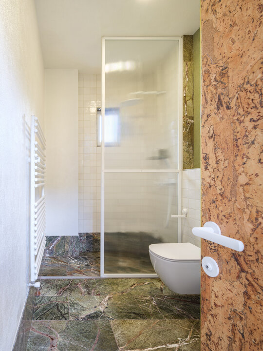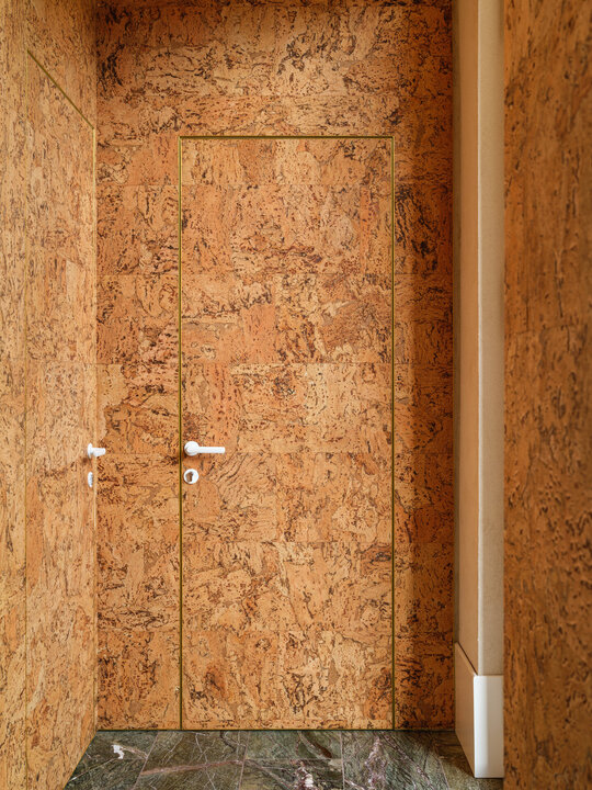Materialele, texturile, culorile, detaliile și limbajul formal unesc, dar în același timp și diferențiază cele două încăperi deservite de un spațiu pentru igienă și întreținere corporală și un vestibul definit de 4 uși filomuro îmbrăcate, din rațiuni acustice și estetice, în plută.