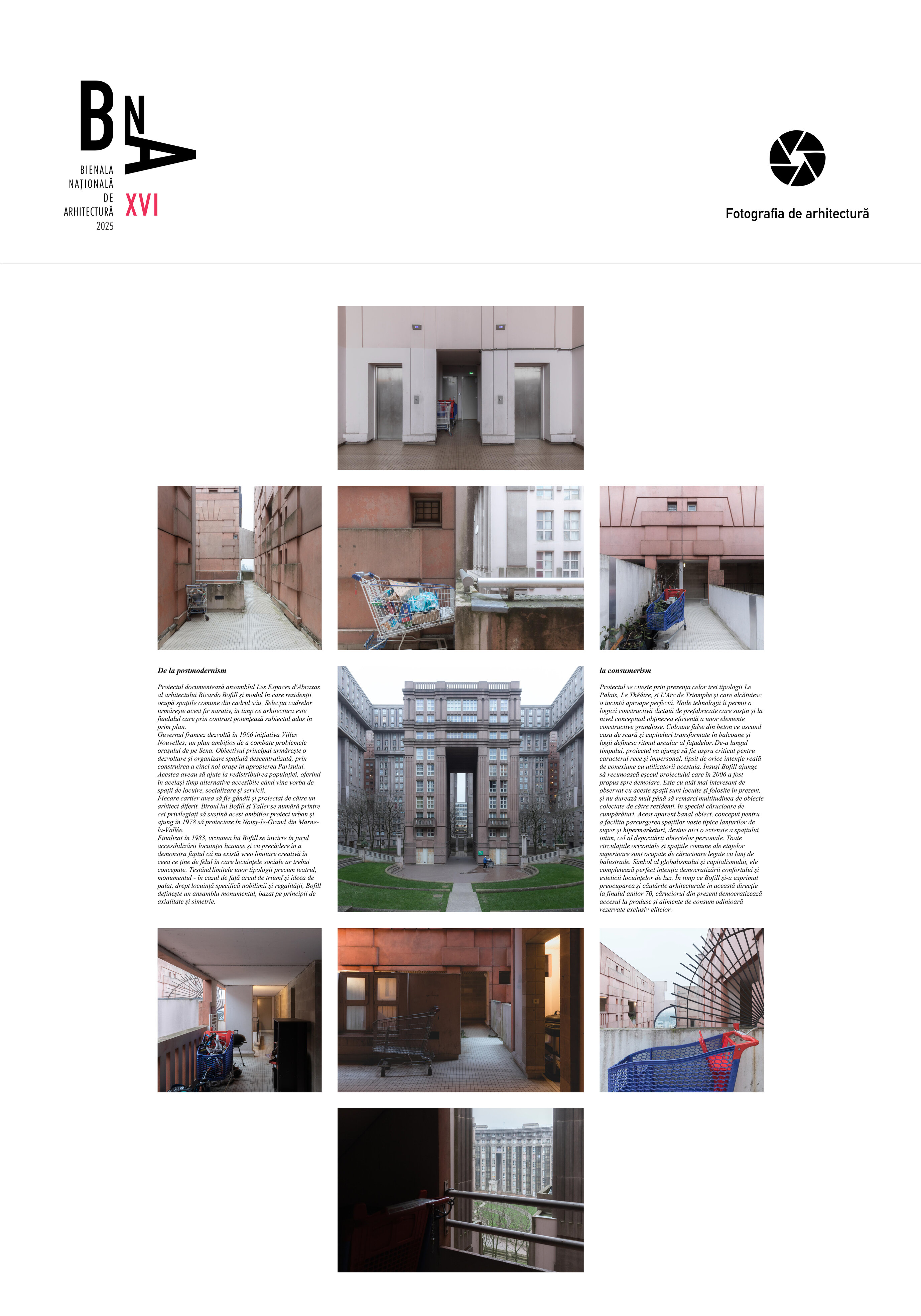 Proiectul documentează ansamblul Les Espaces d'Abraxas al arhitectului Ricardo Bofill și modul în care rezidenții ocupă spațiile comune din cadrul său. Selecția cadrelor urmărește acest fir narativ, în timp ce arhitectura este fundalul care prin contrast potențează subiectul adus în prim plan.